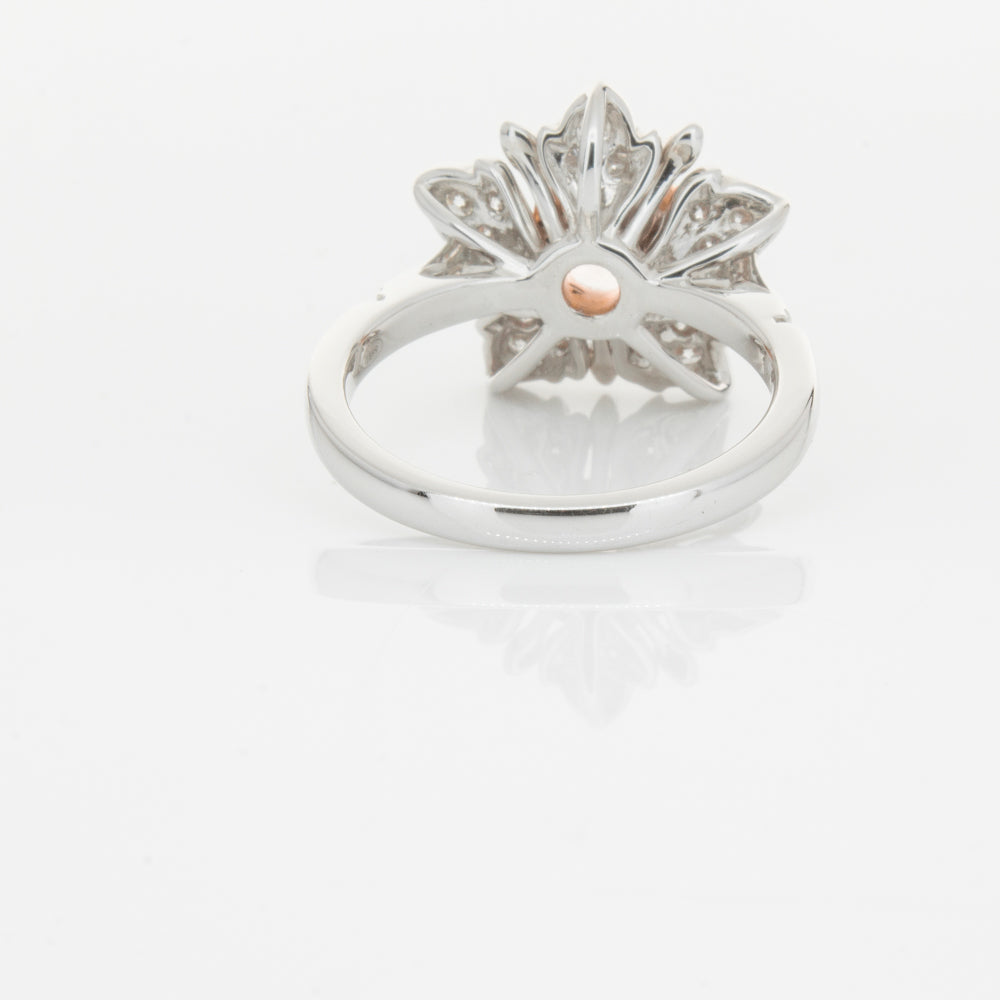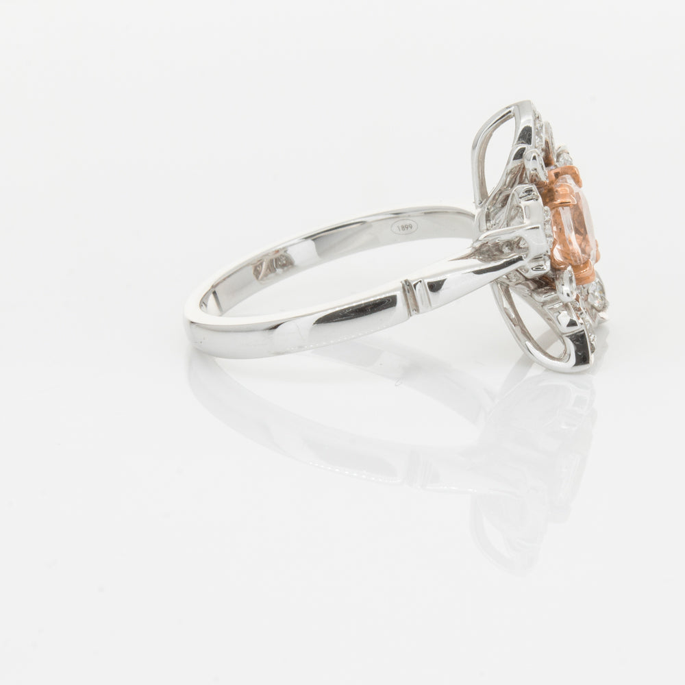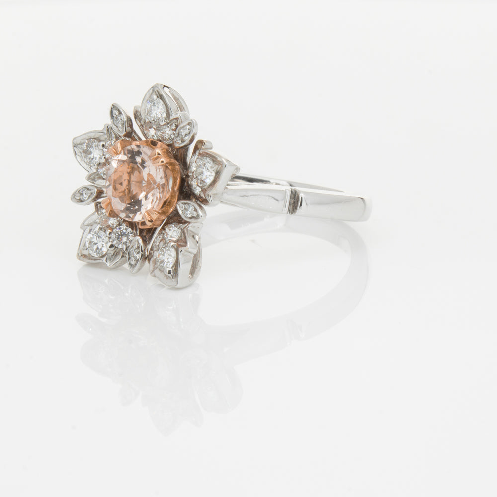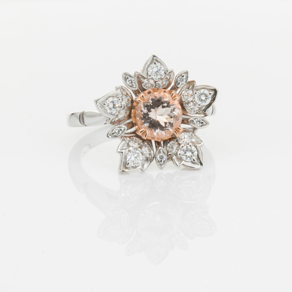 Carefully crafted in 18ct white gold this gorgeous Maple ring boasts one round cut morganite set in 18ct rose gold, framed by twenty round brilliant cut diamonds.