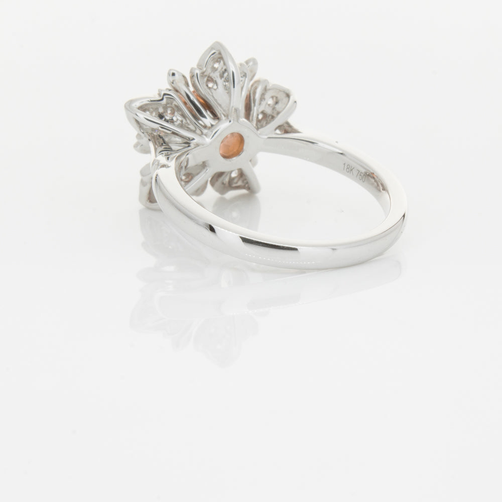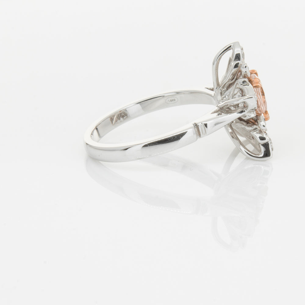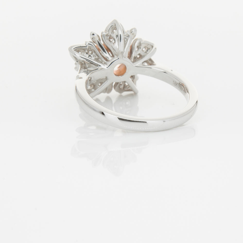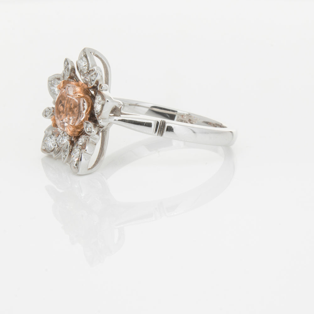Carefully crafted in 18ct white gold this gorgeous Maple ring boasts one round cut morganite set in 18ct rose gold, framed by twenty round brilliant cut diamonds.