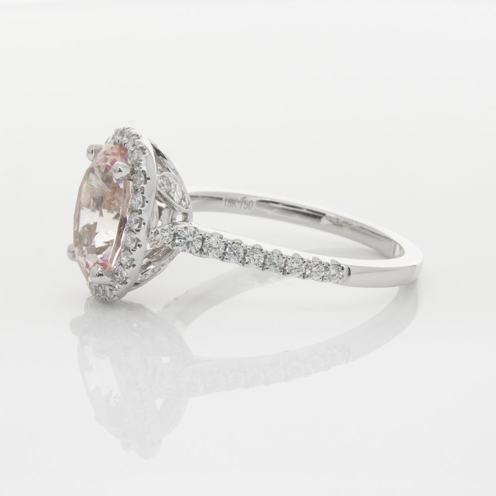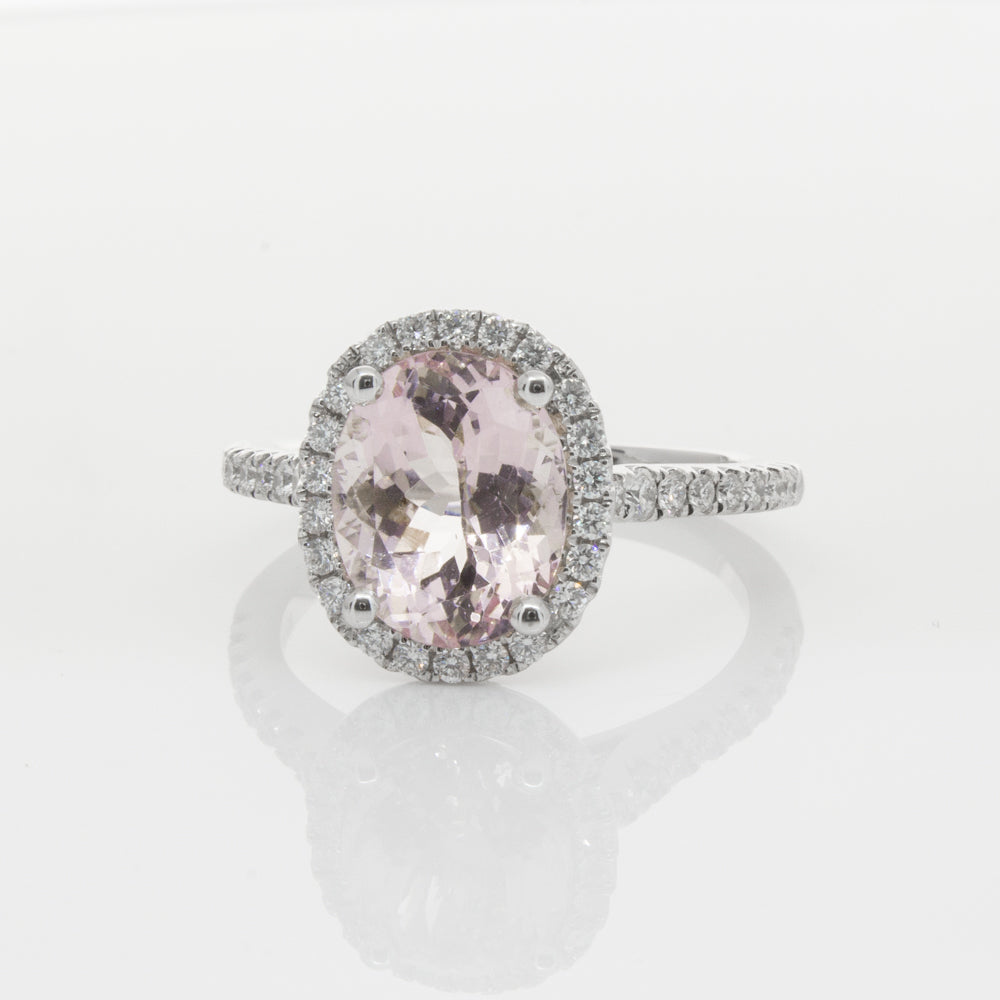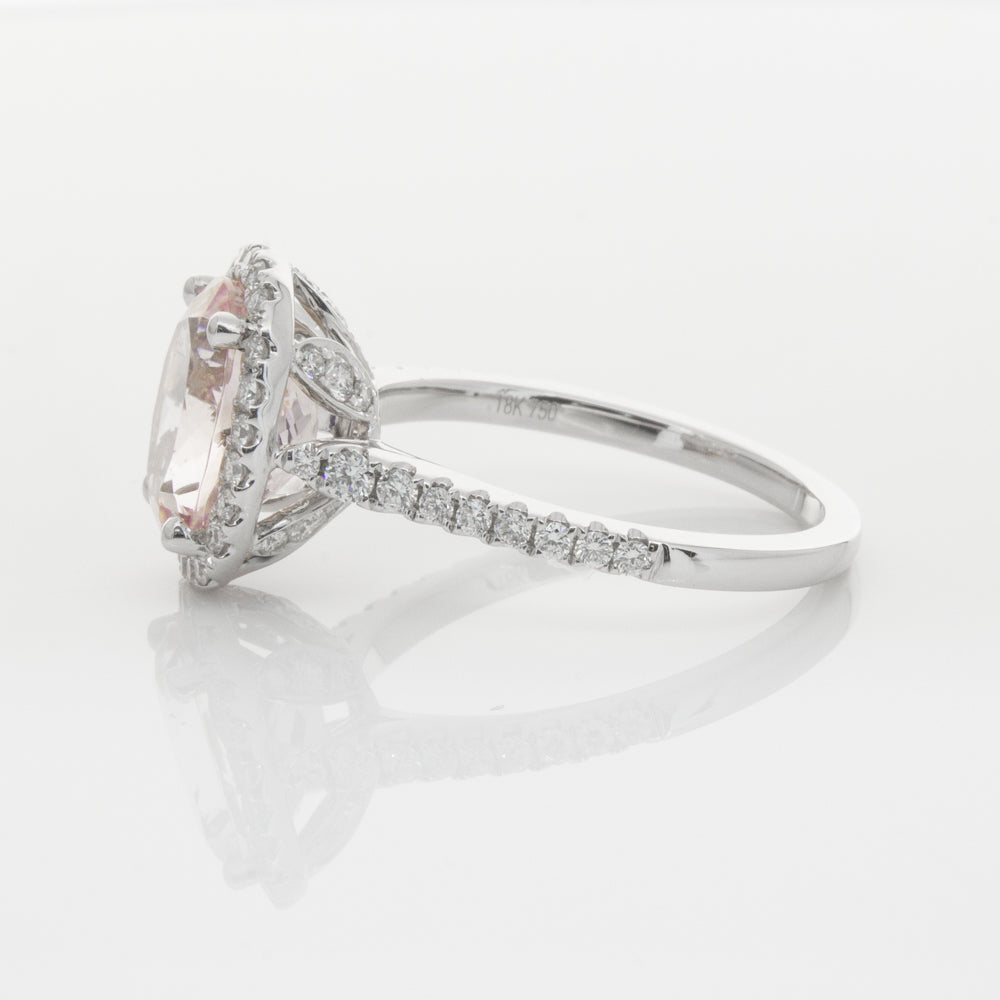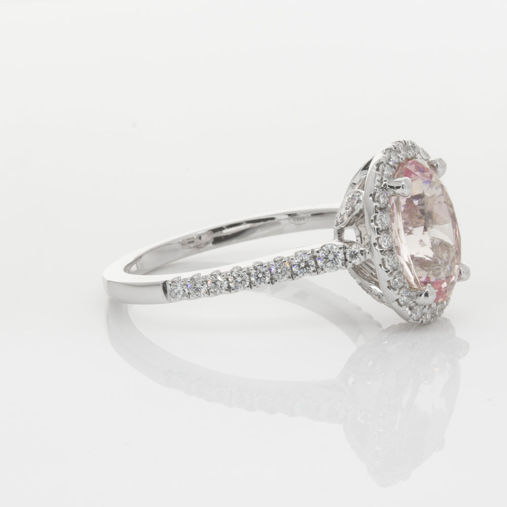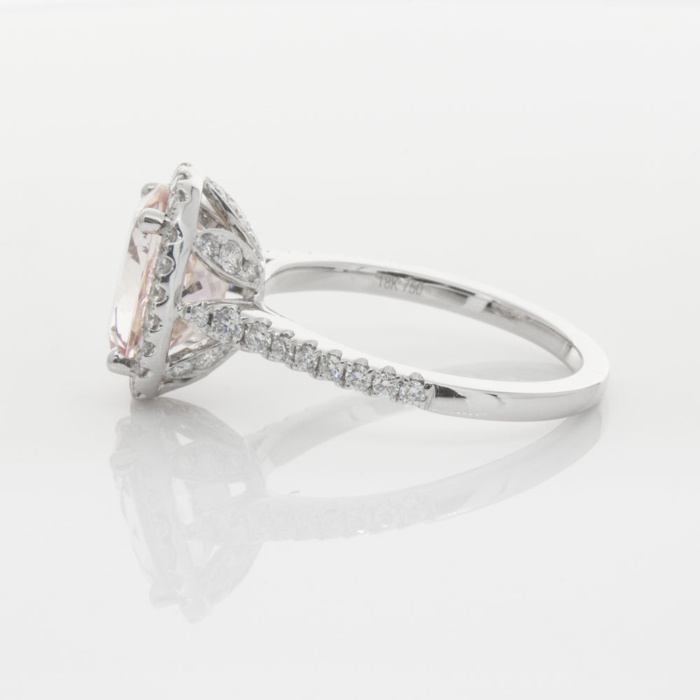 Carefully crafted in white gold, this beautiful Sierra ring boasts a morganite, framed by a halo of shimmering white diamonds.