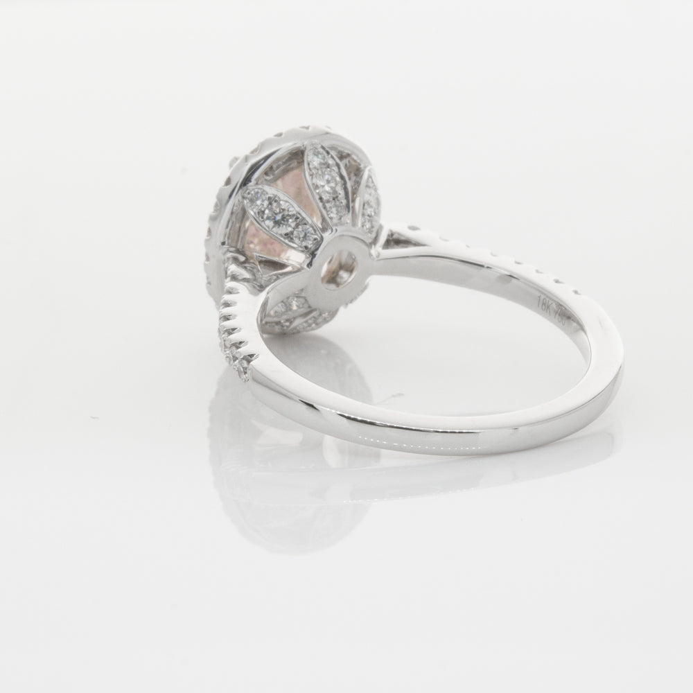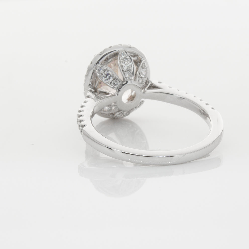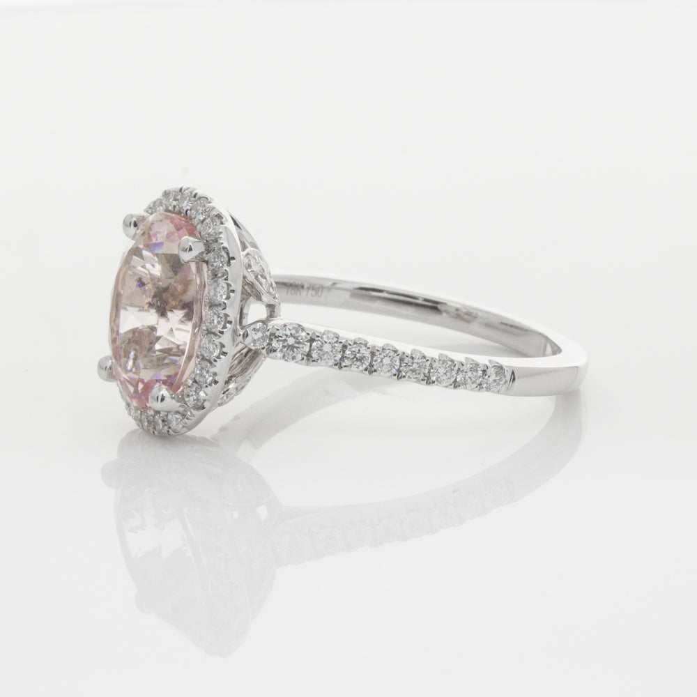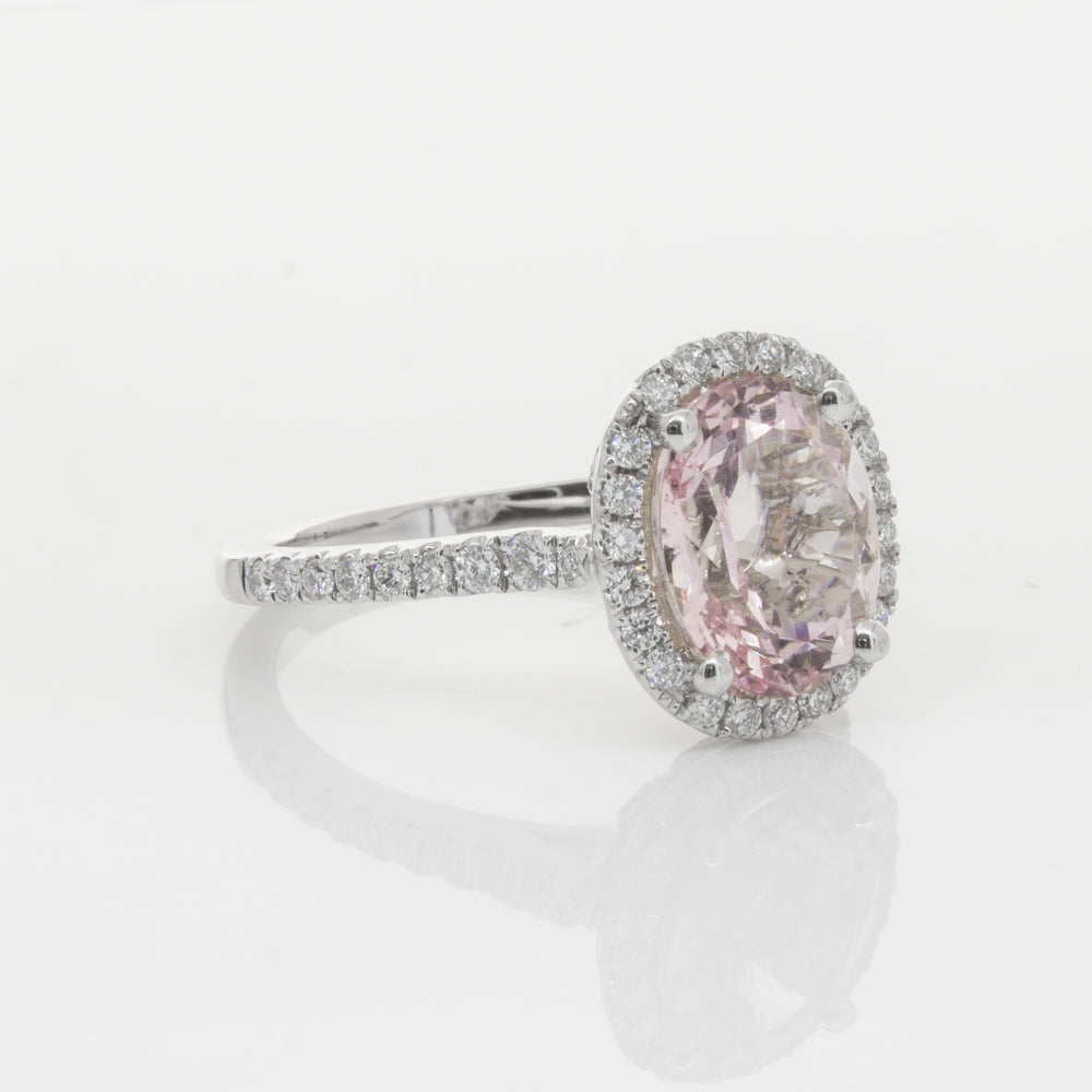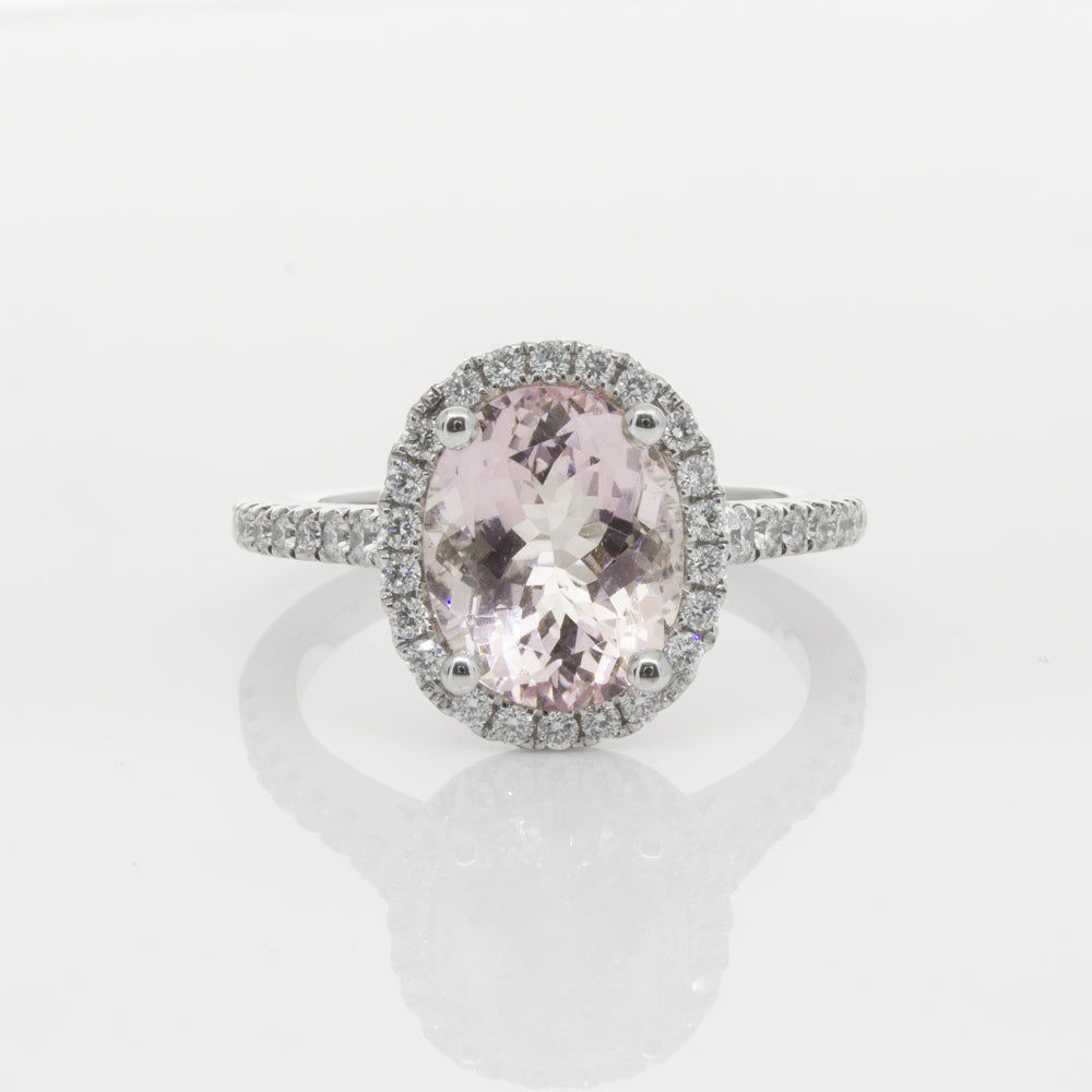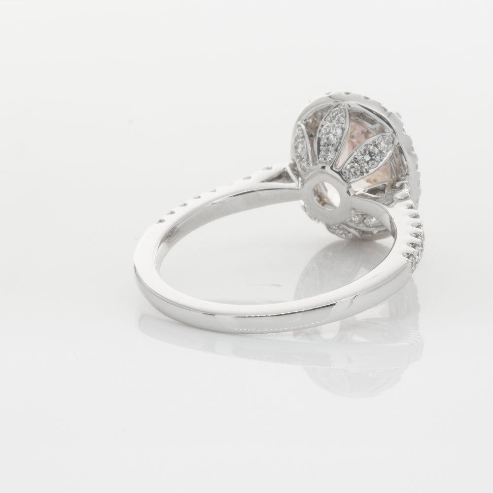 Carefully crafted in white gold, this beautiful Sierra ring boasts a morganite, framed by a halo of shimmering white diamonds.