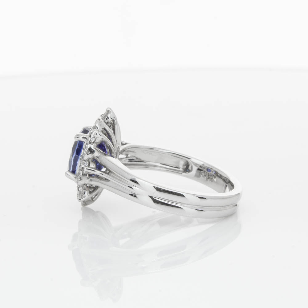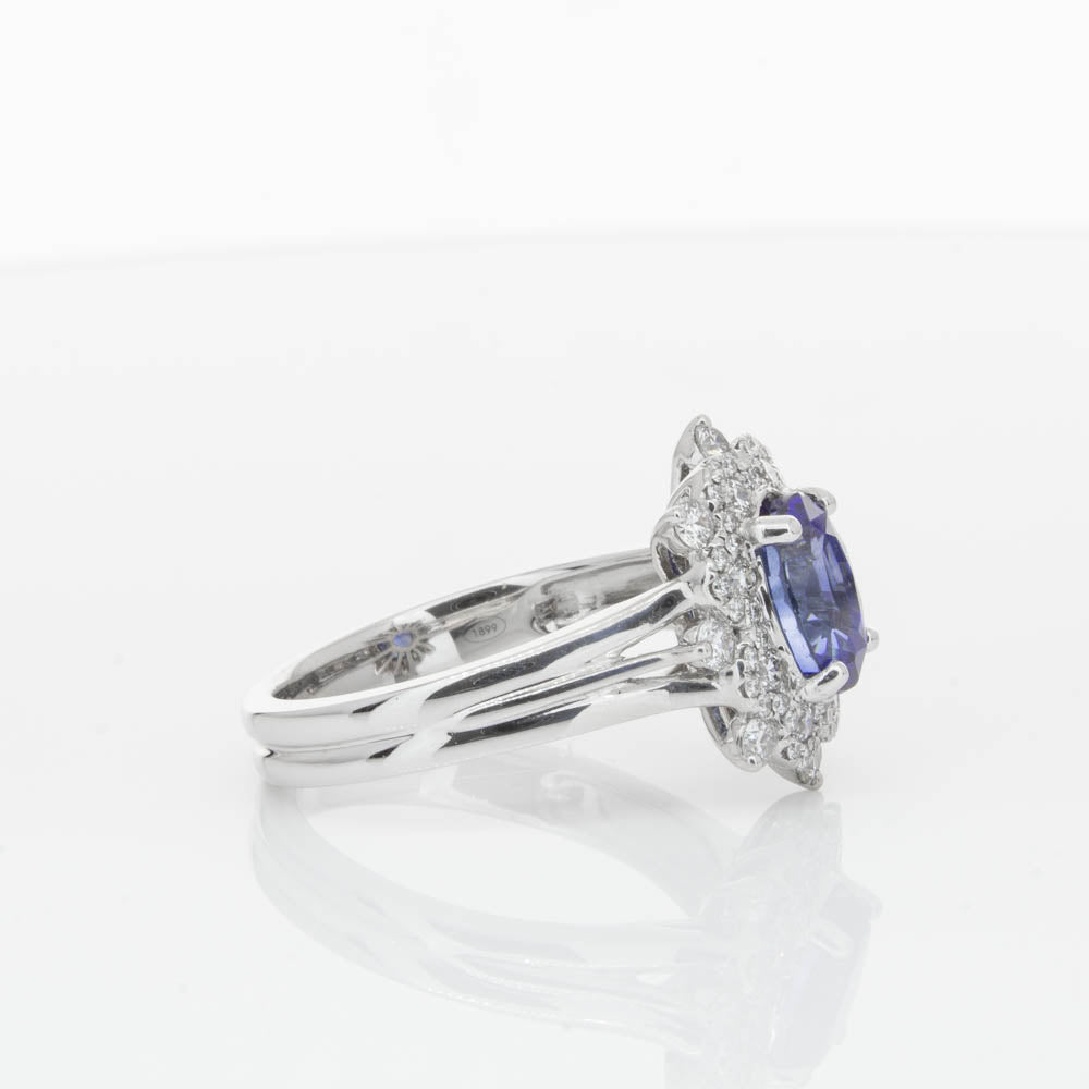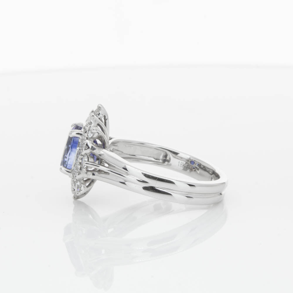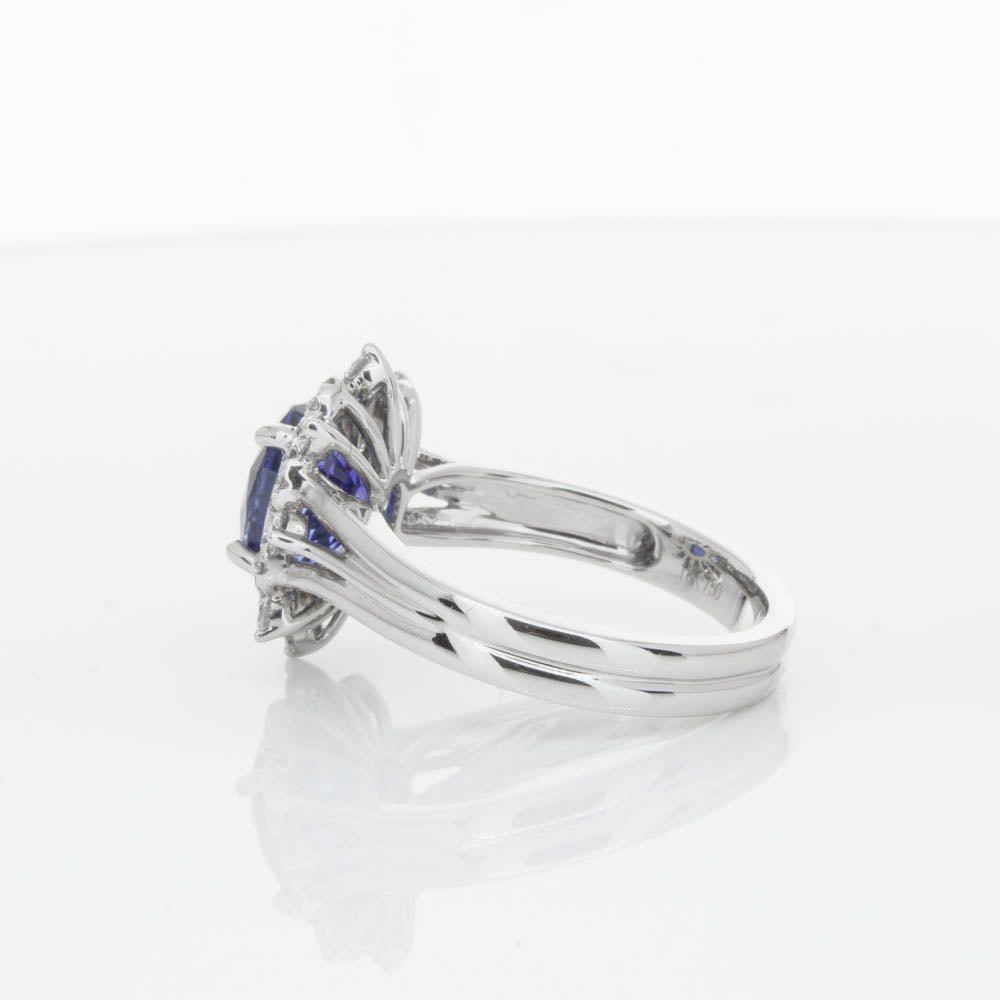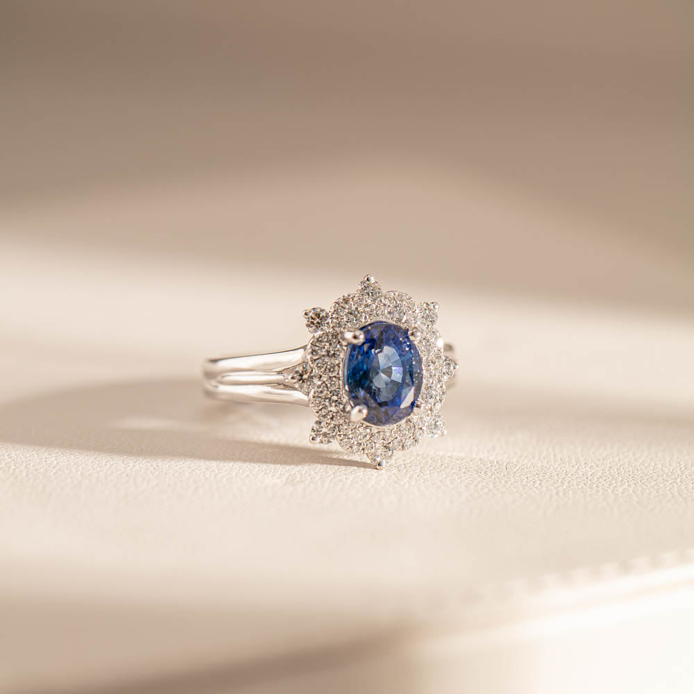 Surrounded by a framing halo of round brilliant cut diamonds, the deep blue colour of the sapphire comes on strong, and delivers the constant companionship of brilliant sparkle. This statement ring is set in our high palladium 18ct 1899 white gold.