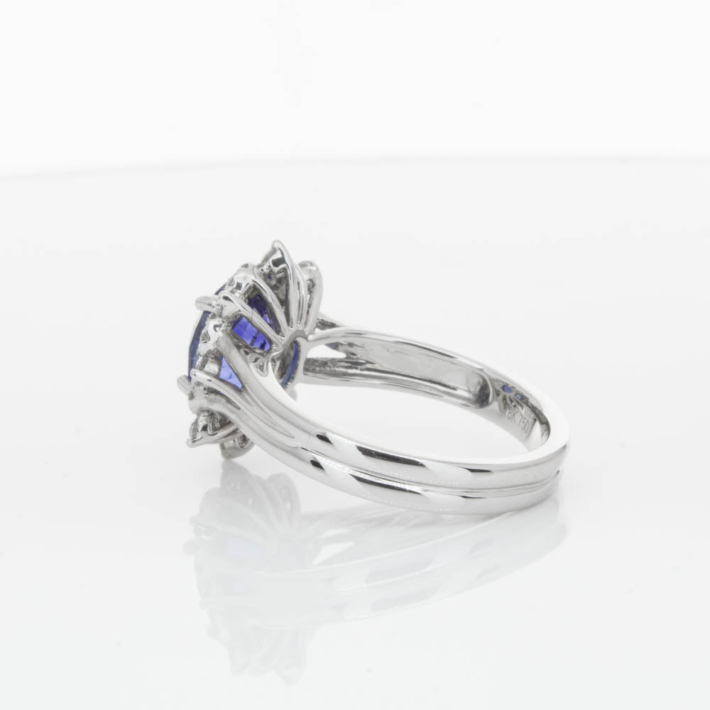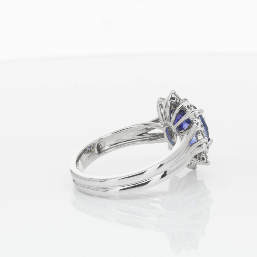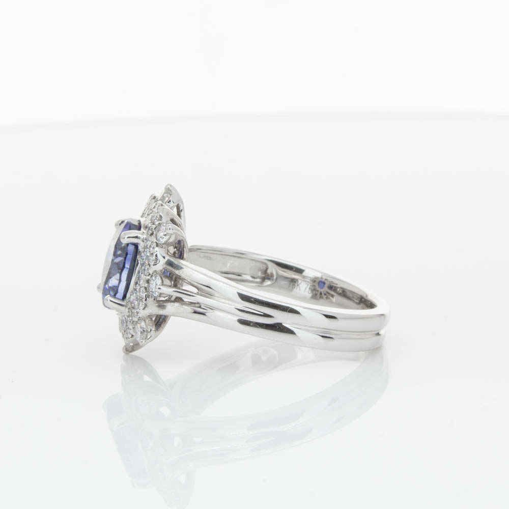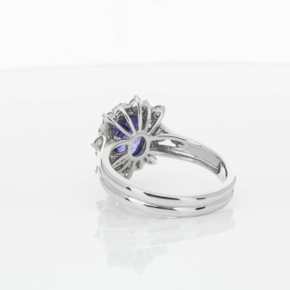 Surrounded by a framing halo of round brilliant cut diamonds, the deep blue colour of the sapphire comes on strong, and delivers the constant companionship of brilliant sparkle. This statement ring is set in our high palladium 18ct 1899 white gold.