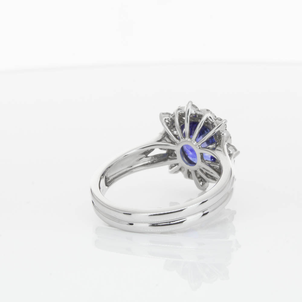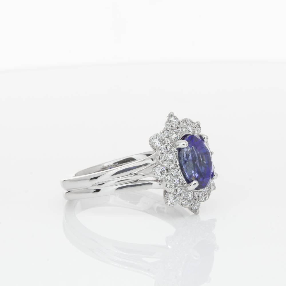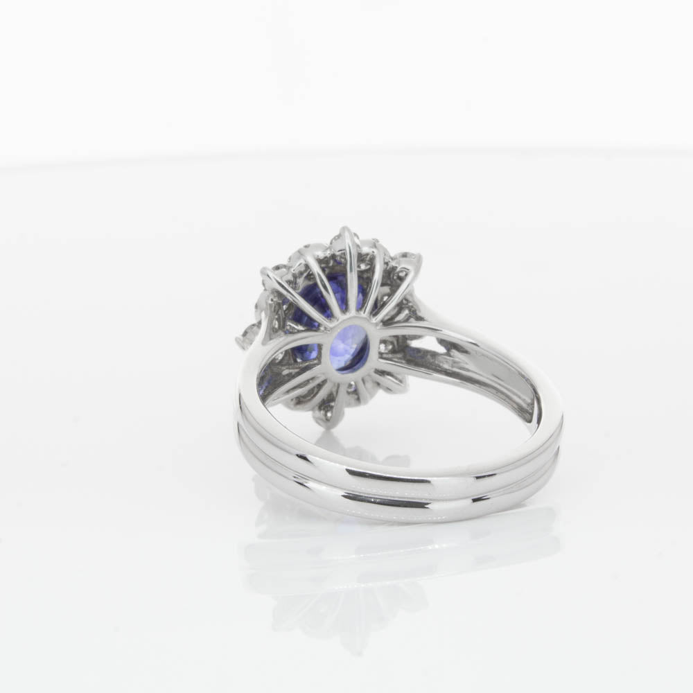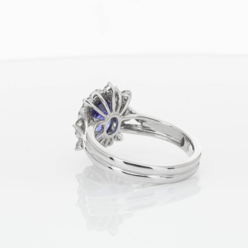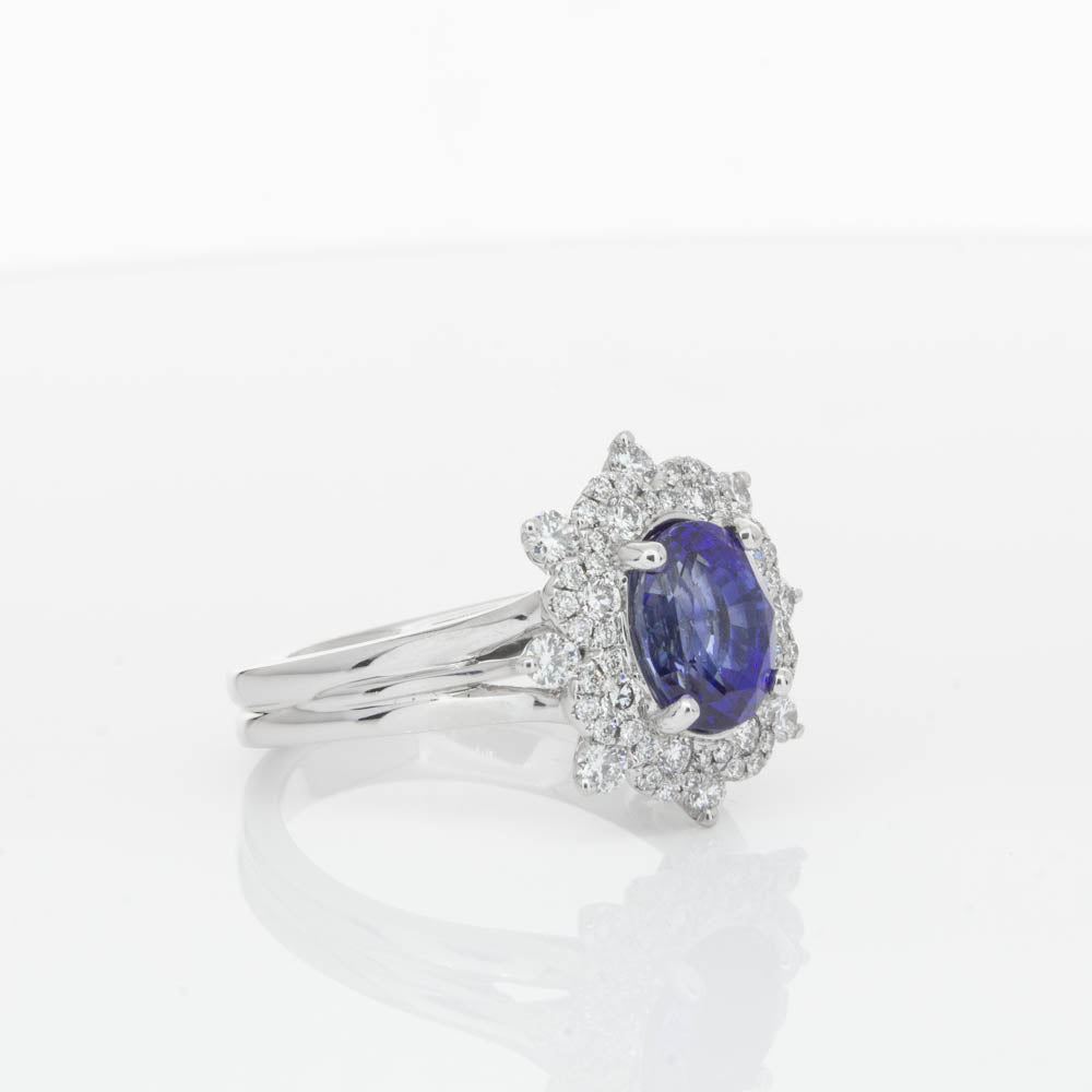 Surrounded by a framing halo of round brilliant cut diamonds, the deep blue colour of the sapphire comes on strong, and delivers the constant companionship of brilliant sparkle. This statement ring is set in our high palladium 18ct 1899 white gold.