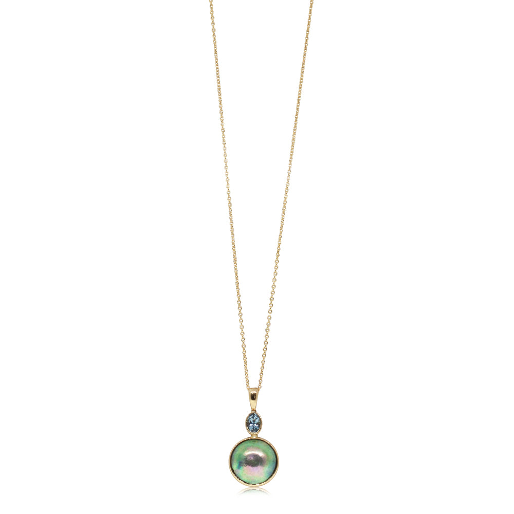 18ct yellow gold pendant featuring one paua pearl & a light blue oval cut aquamarine.