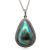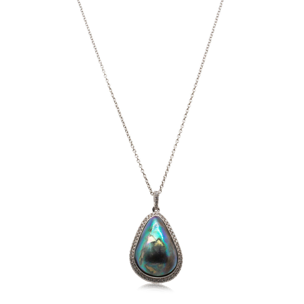 18ct white gold pendant boasts a paua pearl with a dazzling diamond halo and bail.