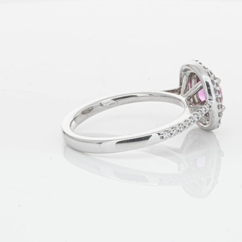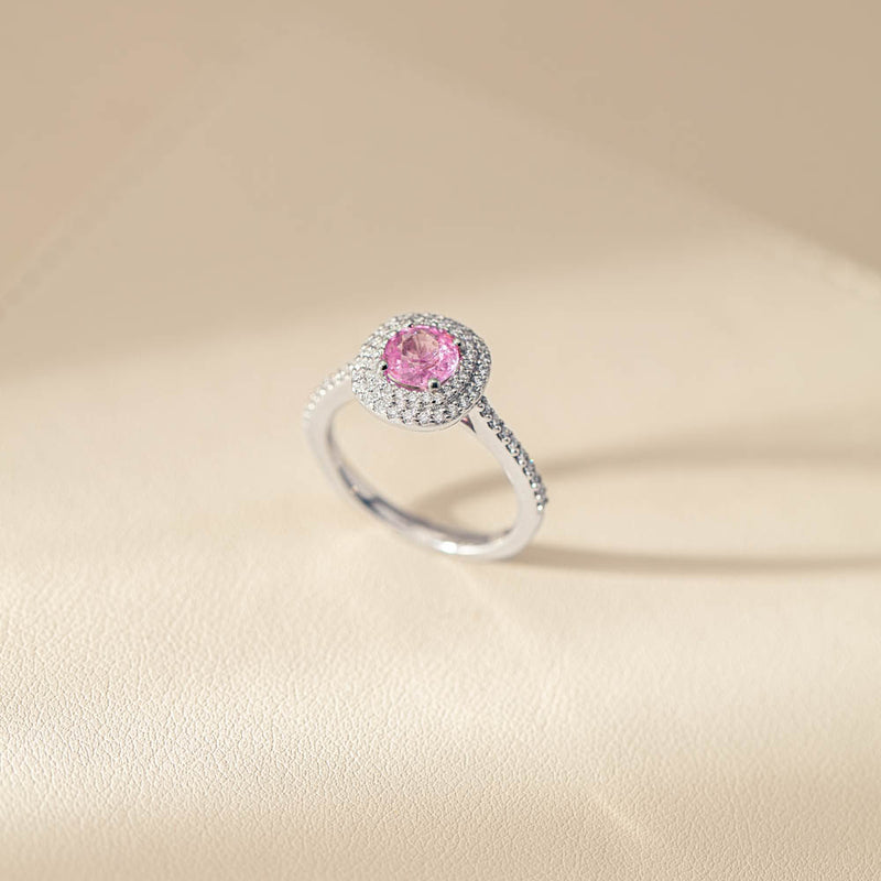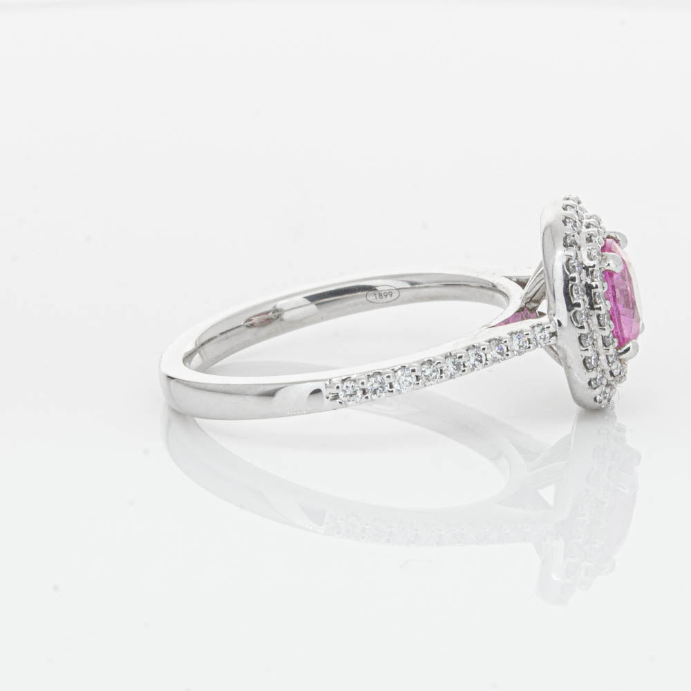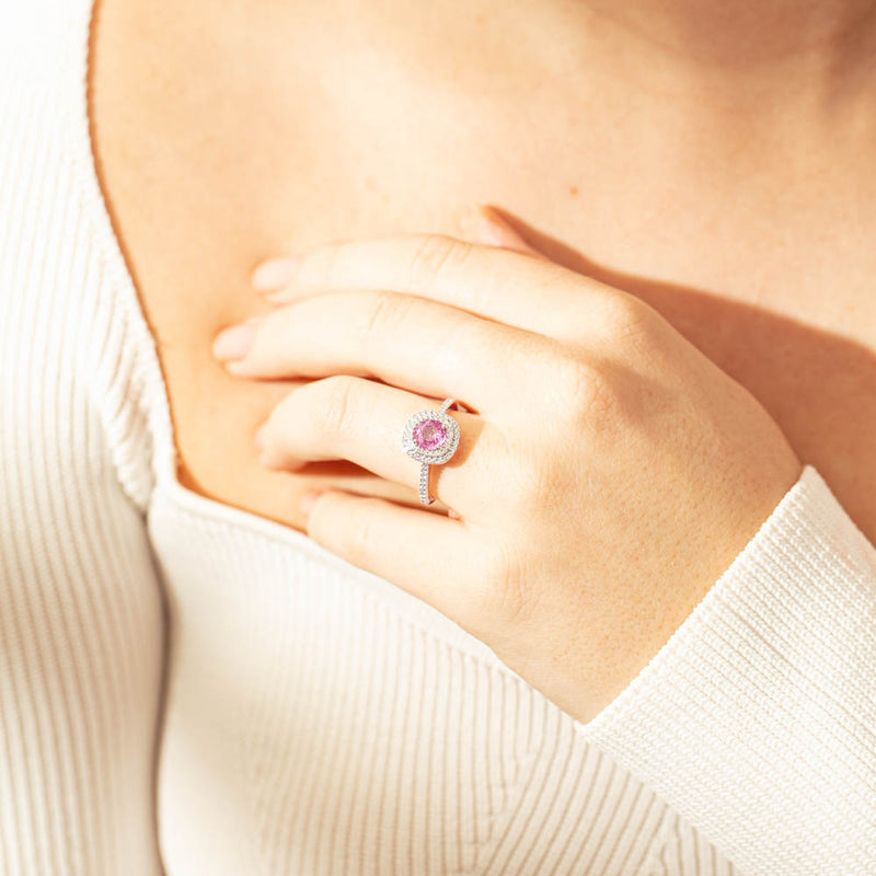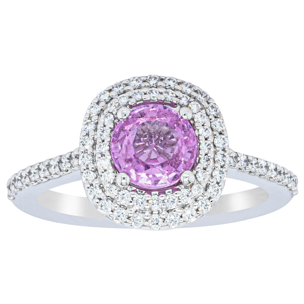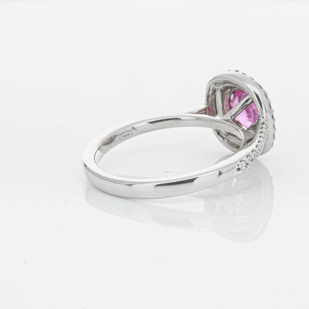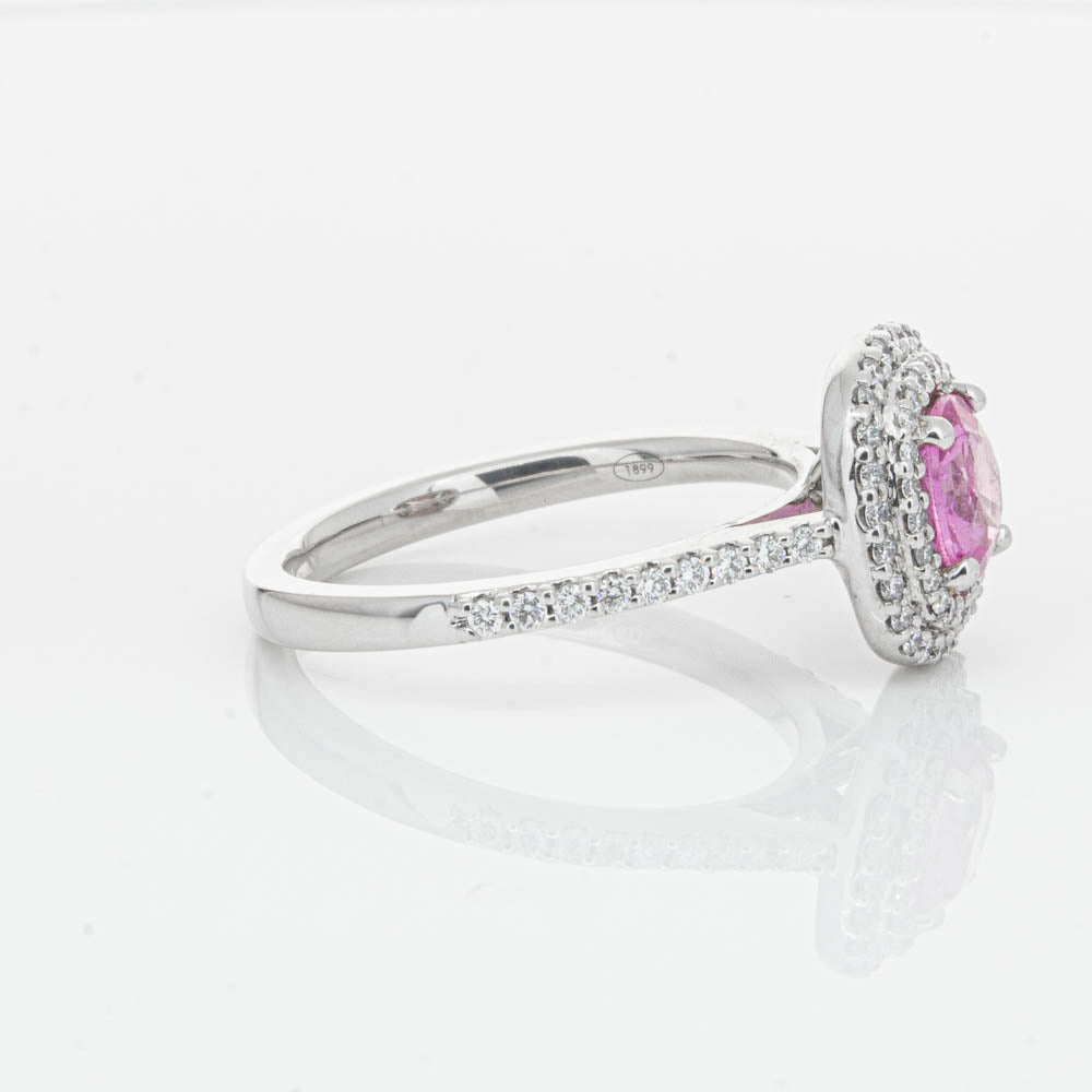 For the moment when only a grand gesture will do, there's the Rosa pink sapphire and diamond ring from our signature 1899 collection. Exceptionally crafted in our high palladium 18ct white gold, this Rosa ring features a purplish pink sapphire inside a double diamond halo creating a breathtaking display of brilliance beyond comparison.
