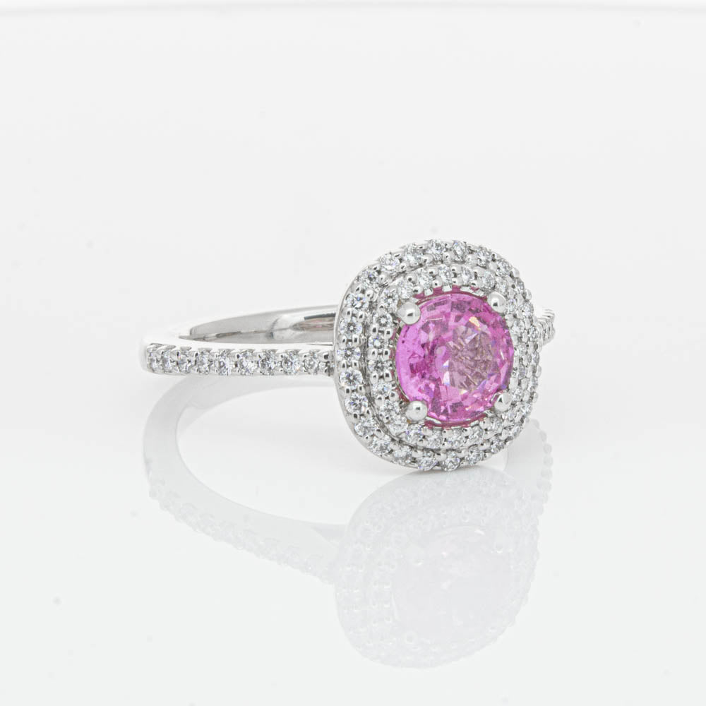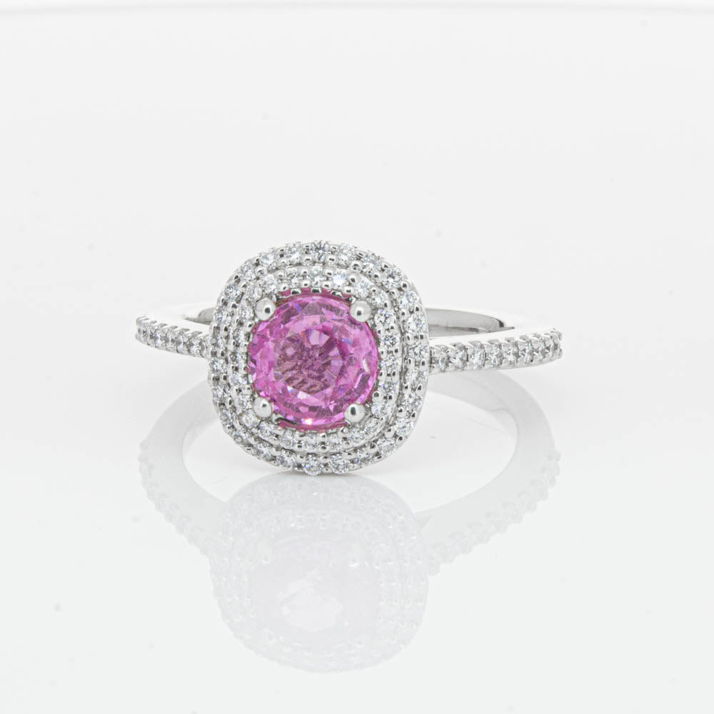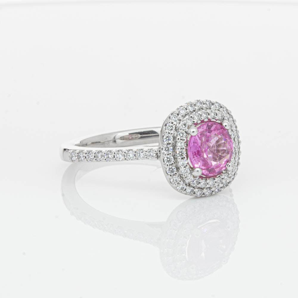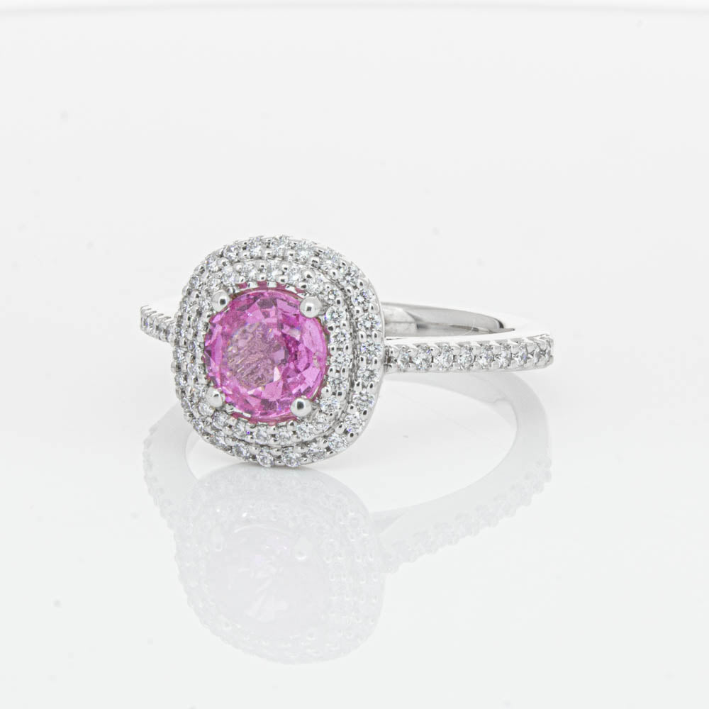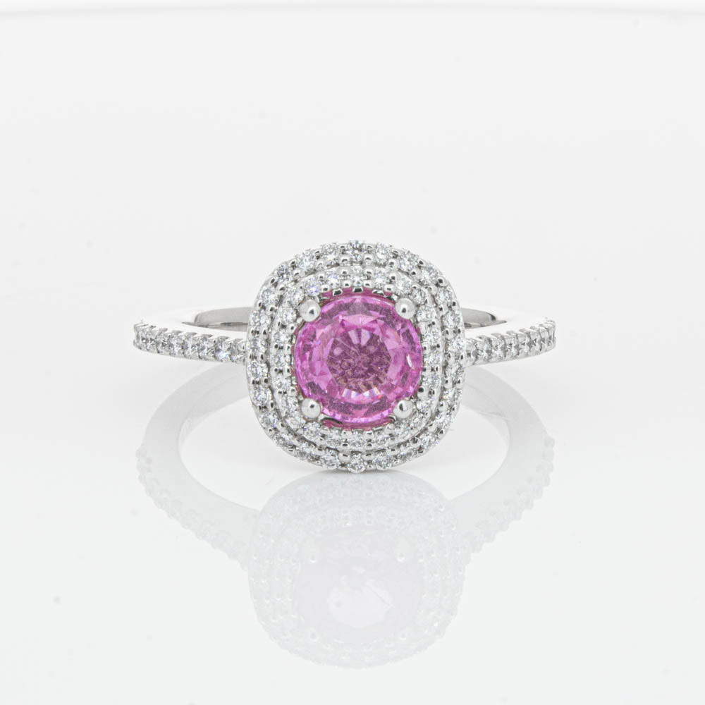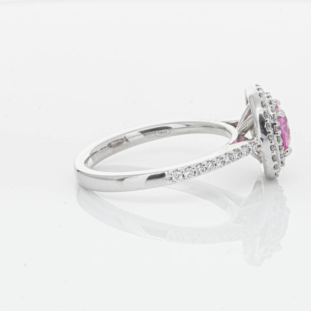 For the moment when only a grand gesture will do, there's the Rosa pink sapphire and diamond ring from our signature 1899 collection. Exceptionally crafted in our high palladium 18ct white gold, this Rosa ring features a purplish pink sapphire inside a double diamond halo creating a breathtaking display of brilliance beyond comparison.