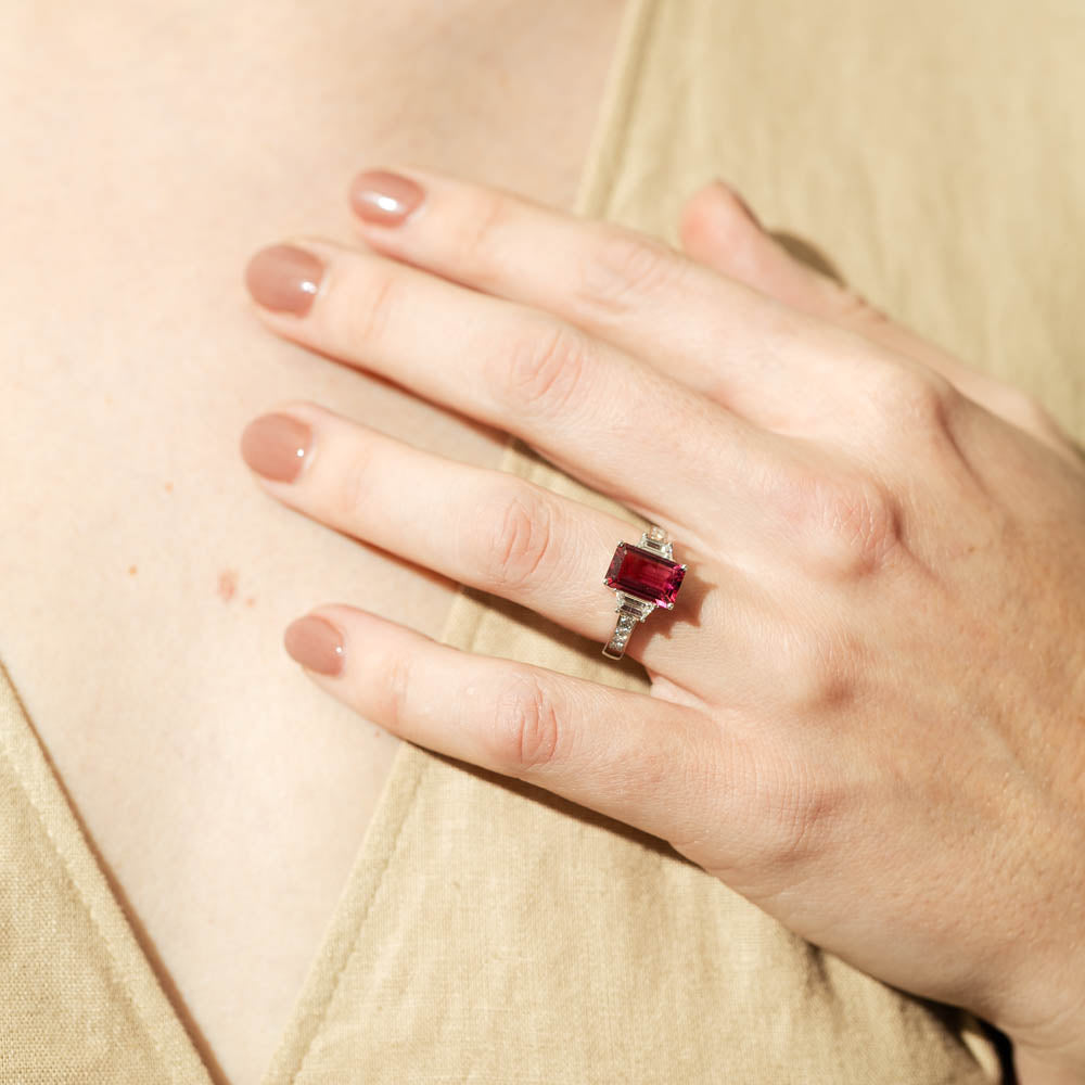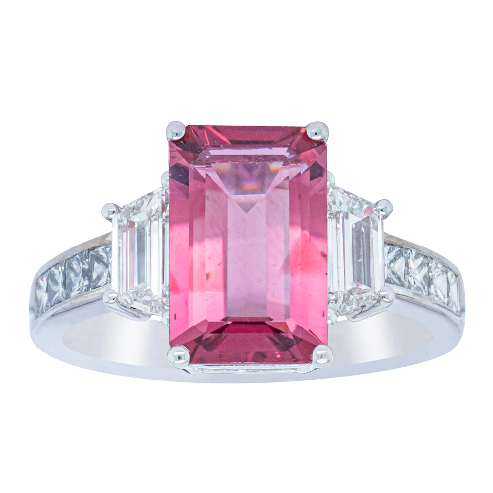 Wow her with this impressive pink tourmaline and diamond ring! Perfectly crafted from beautiful 18ct white gold this striking piece boasts a rectangular step cut pink tourmaline which rests between two shining taper cut diamonds. Complete with diamond set shoulders to complete a vision of elegance, this piece is sure to put a smile on her face the same way you do.