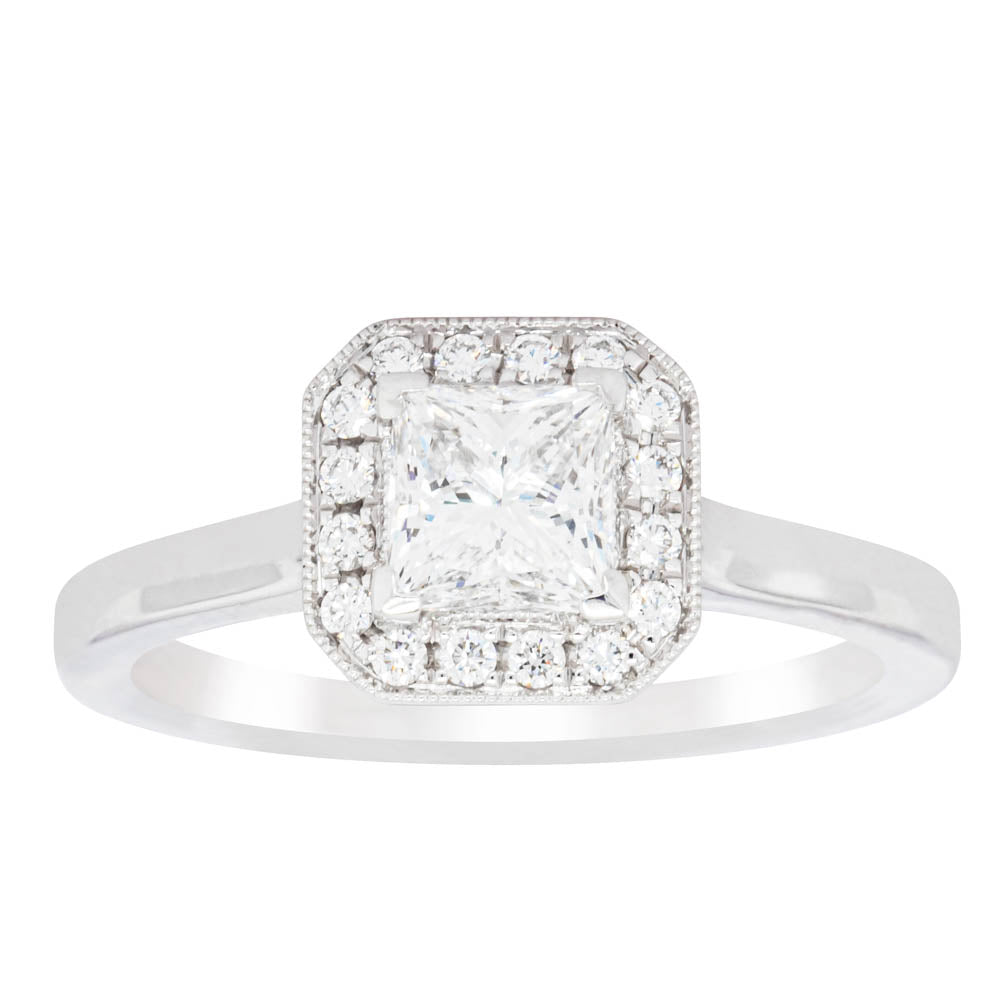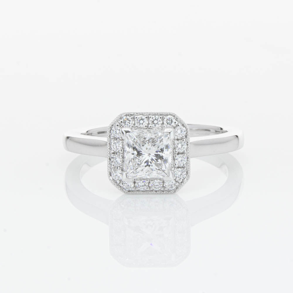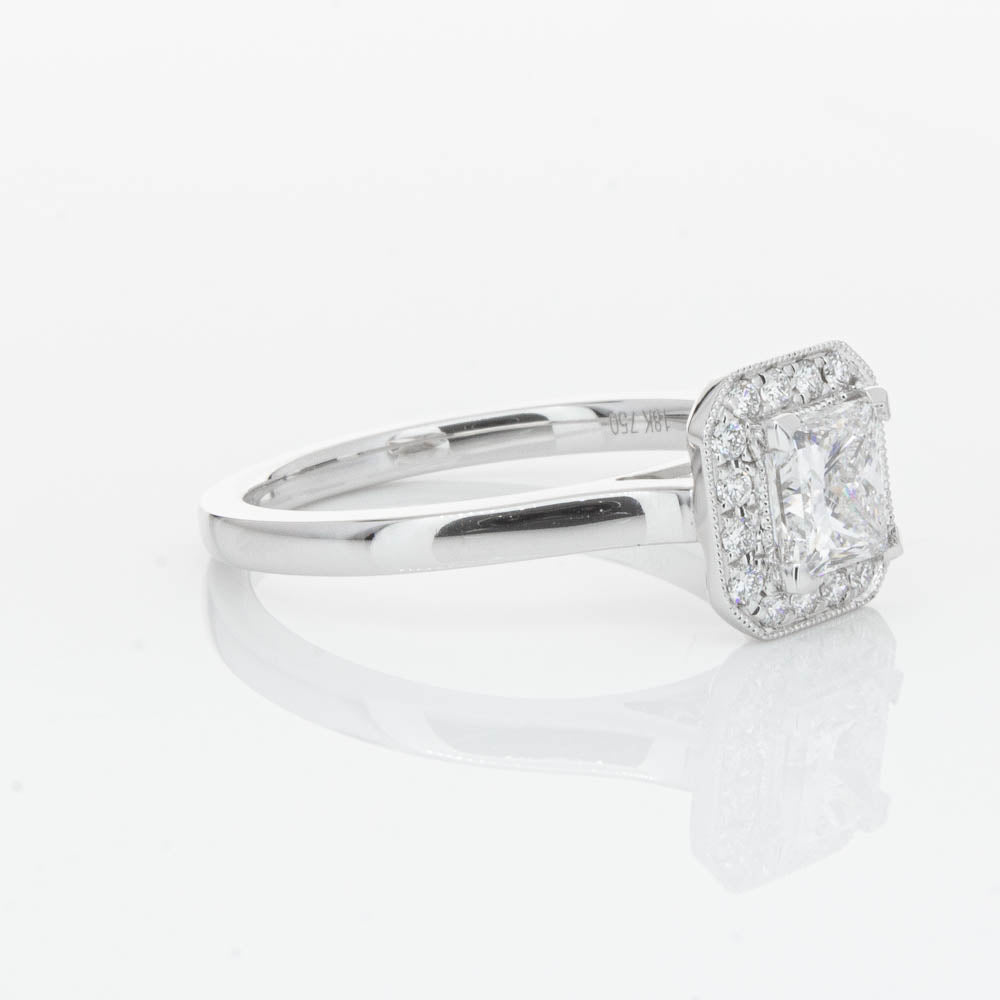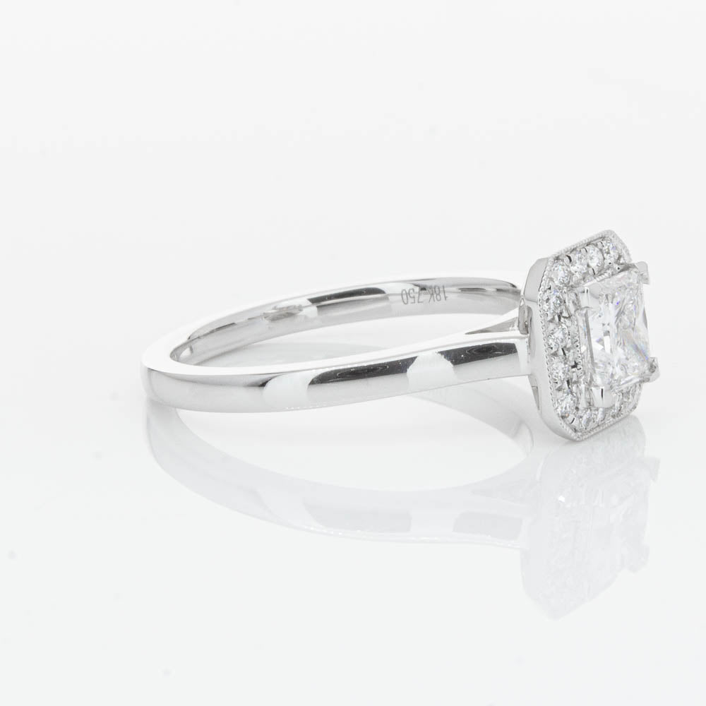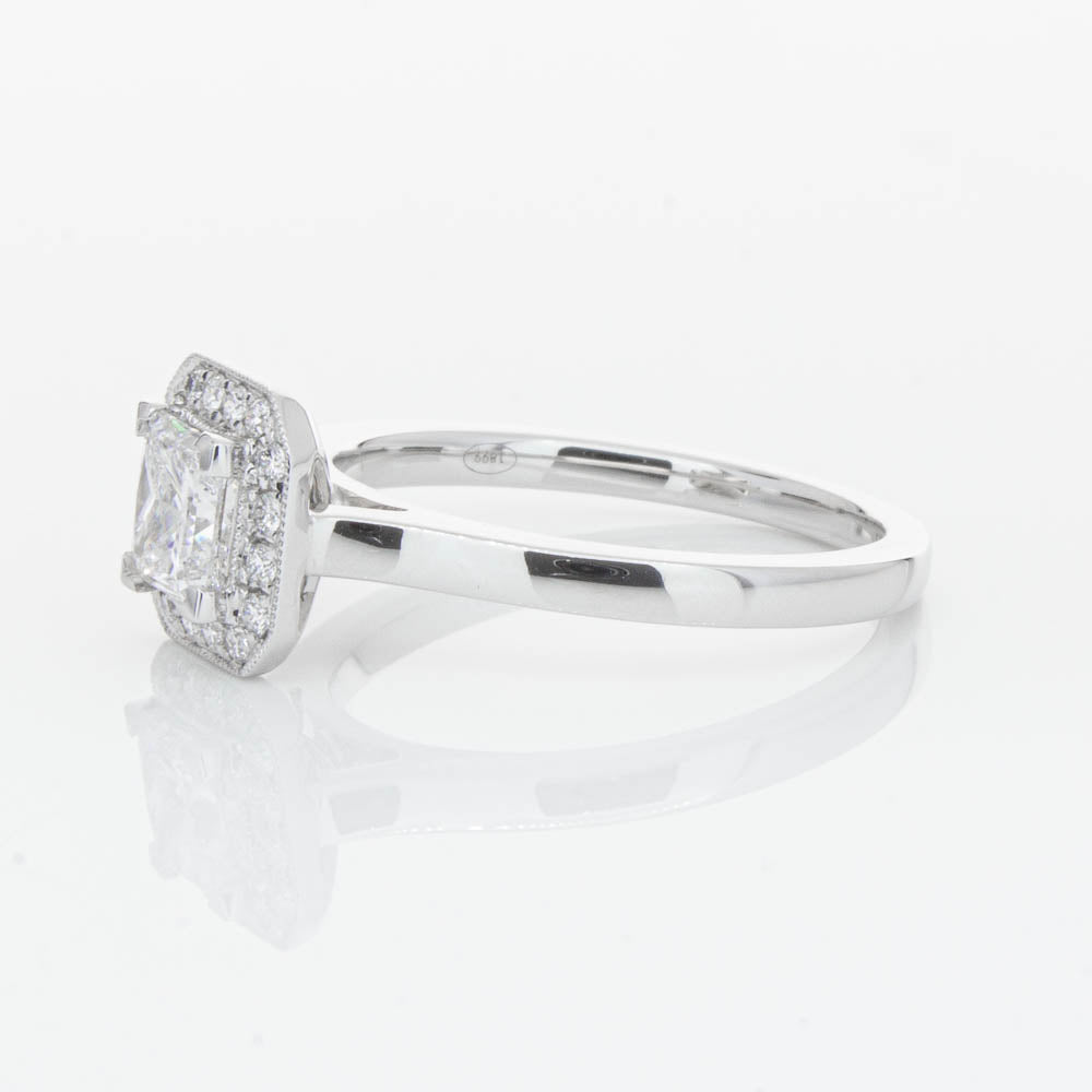 This elegant ring has been crafted in 18ct white gold from our signature 1899 collection, boasting a shining princess cut centre diamond framed by a glittering diamond halo.