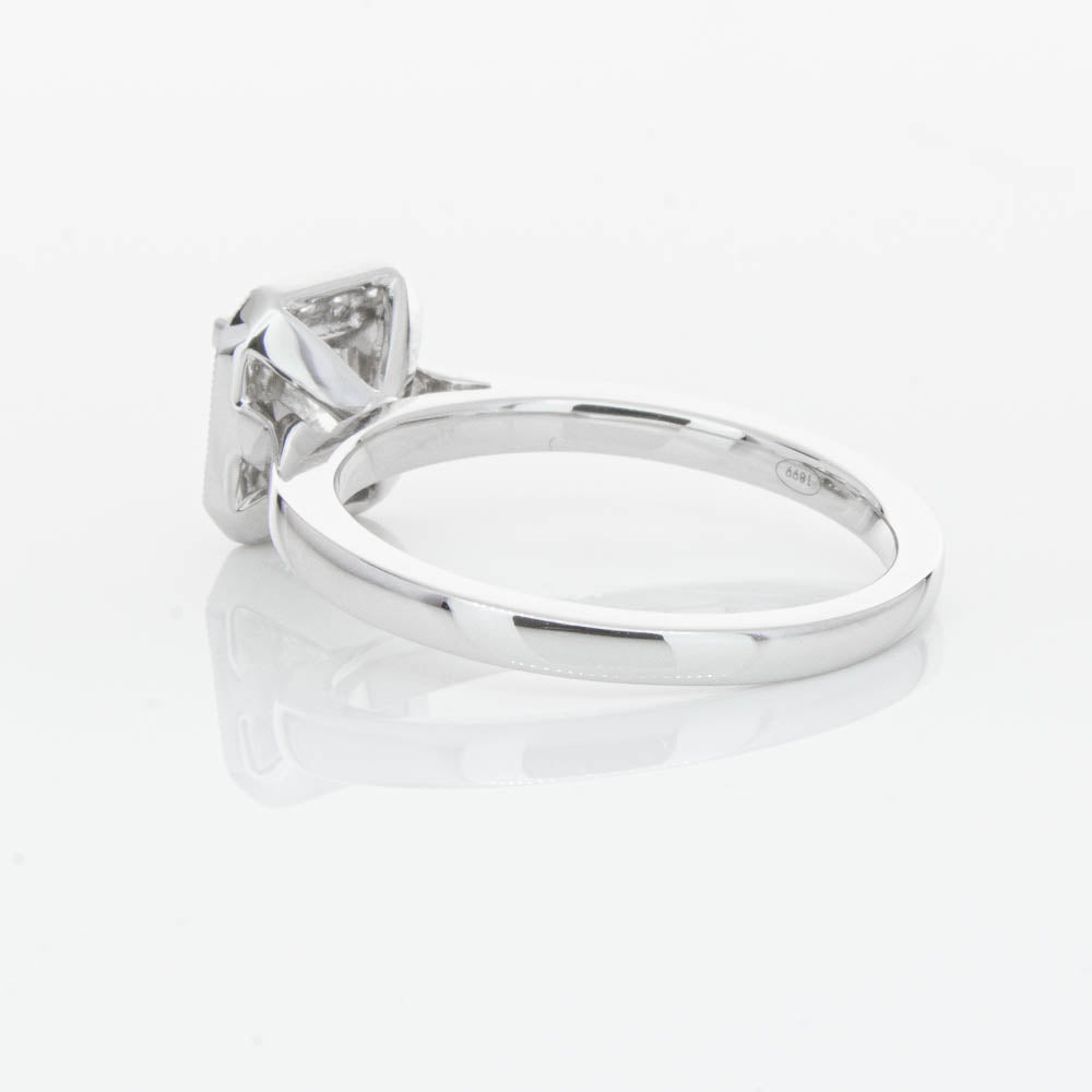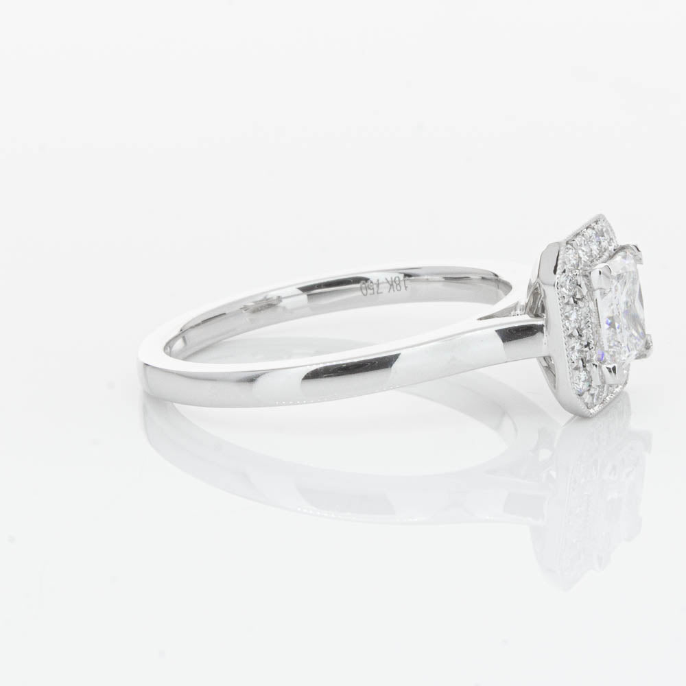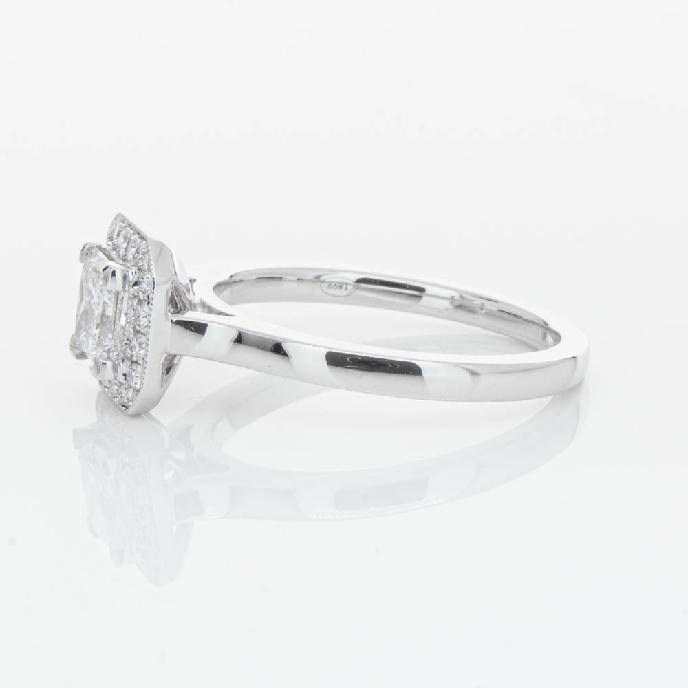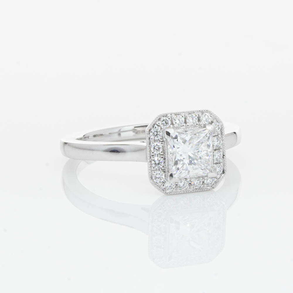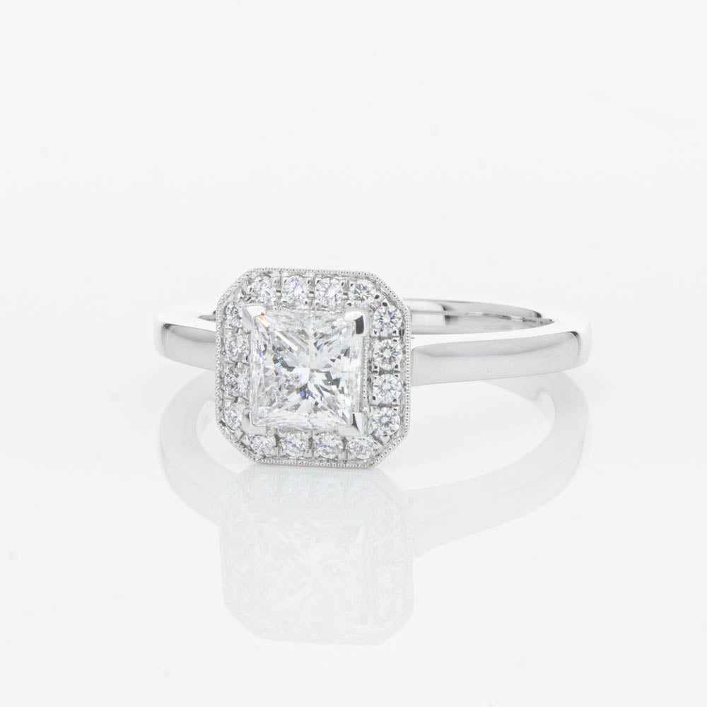 This elegant ring has been crafted in 18ct white gold from our signature 1899 collection, boasting a shining princess cut centre diamond framed by a glittering diamond halo.
