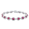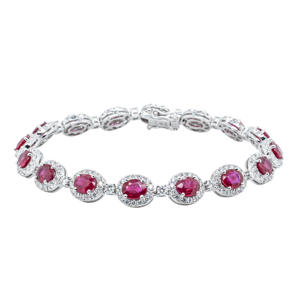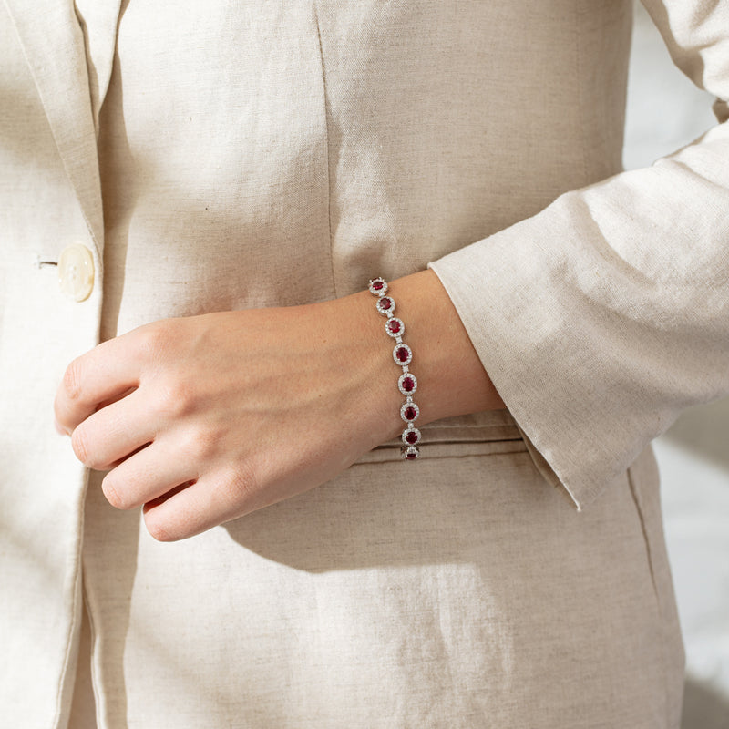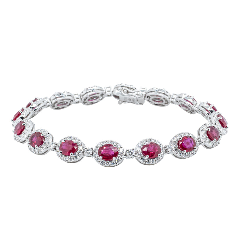 This stunning Ruby and Diamond Bracelet showcases sixteen ruby and diamond clusters arranged in a captivating halo setting. Crafted from luxurious 18ct white gold, it is a timeless piece of fine jewellery that will turn heads.