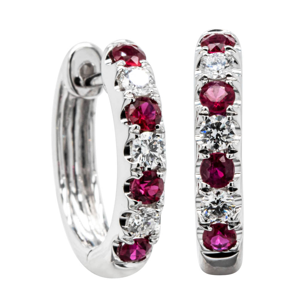 Striking in beauty, these Meridien hoop earrings from our signature 1899 collection showcase rubies accented with round brilliant cut diamonds perfectly set in 18ct white gold.
