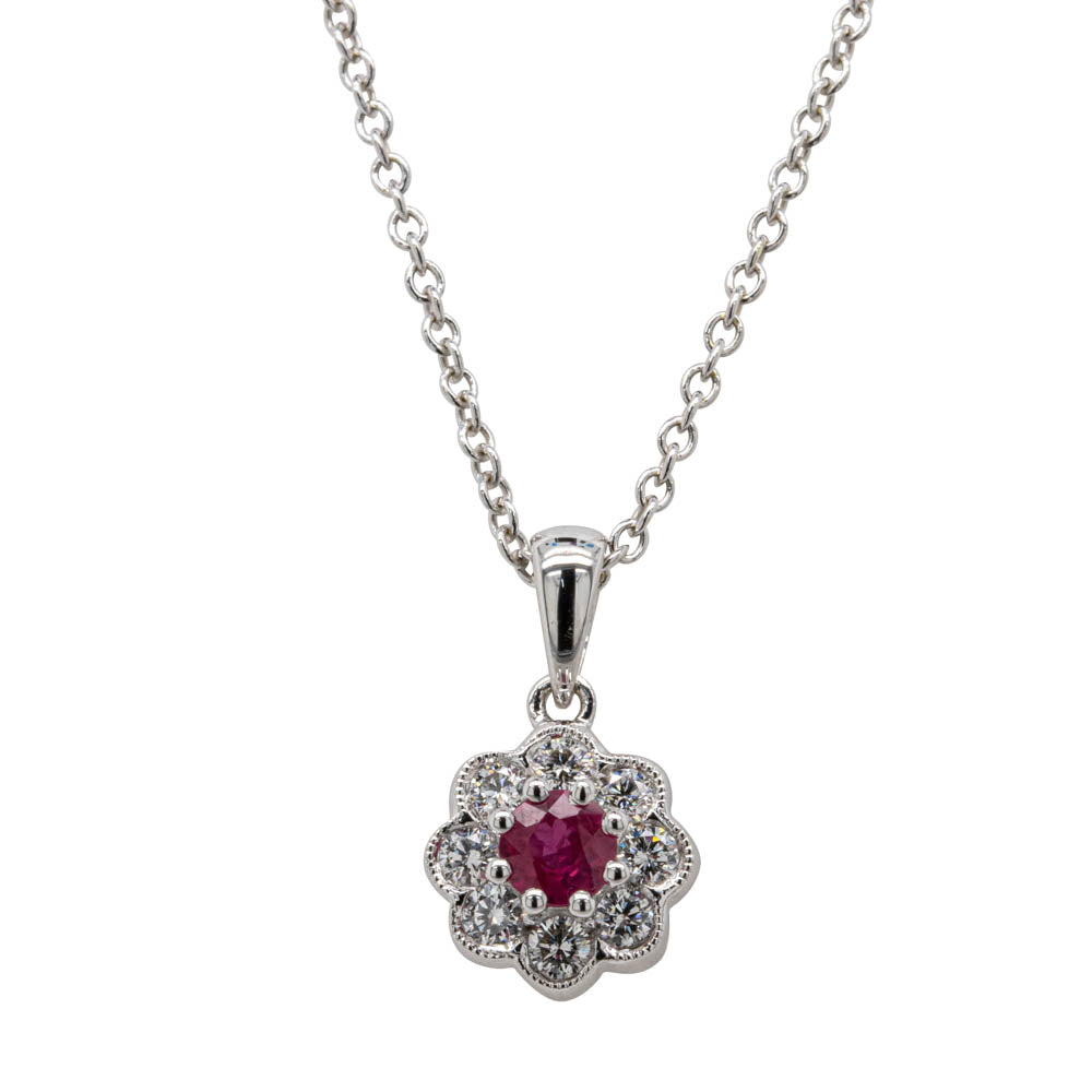 Crafted to perfection in 18ct white gold this gorgeous pendant features a round faceted ruby framed by a halo of round brilliant cut diamonds. Swinging from a tapering bail, this beautiful pendant is perfect for you.