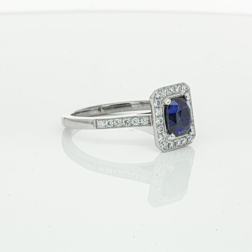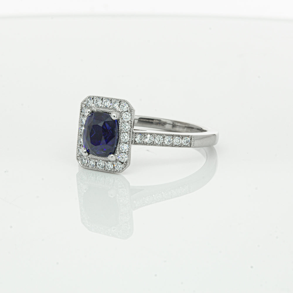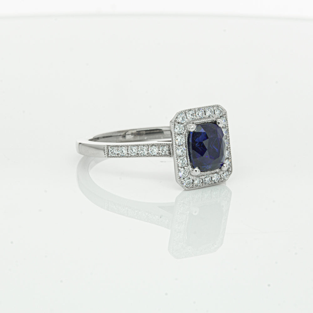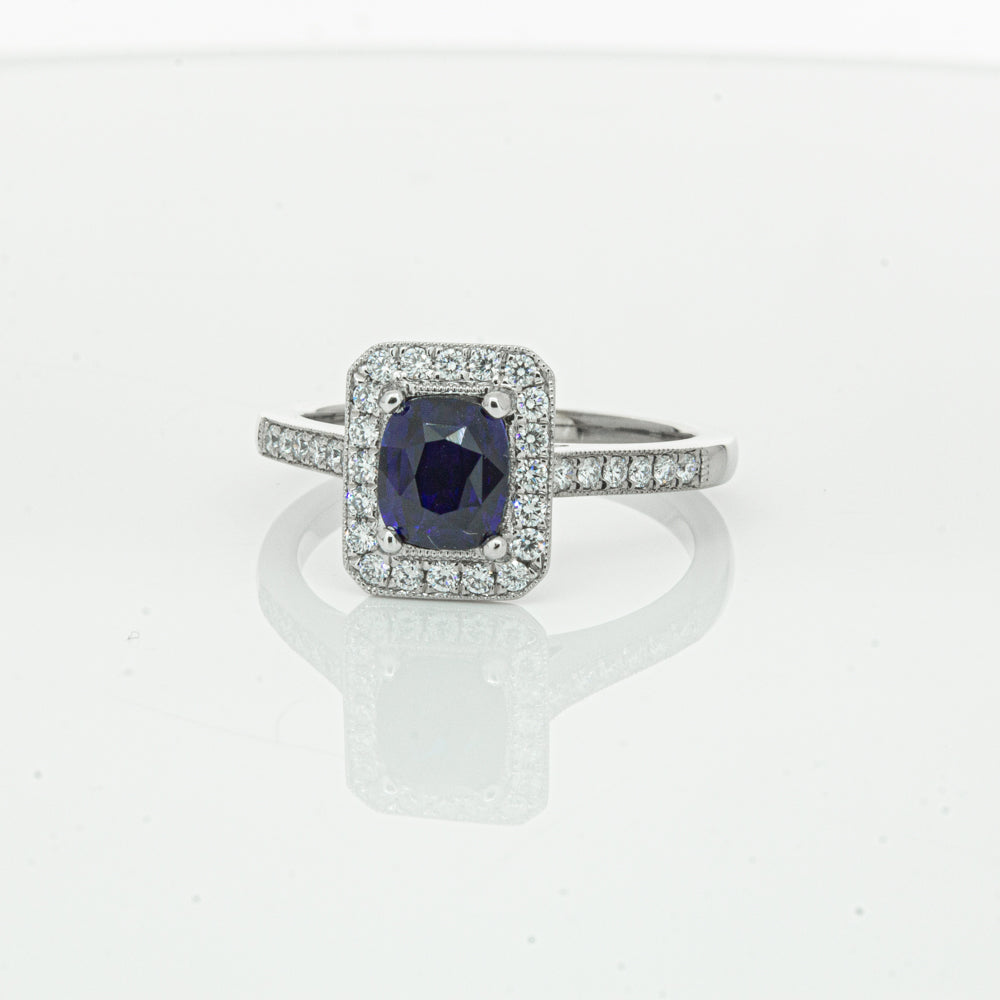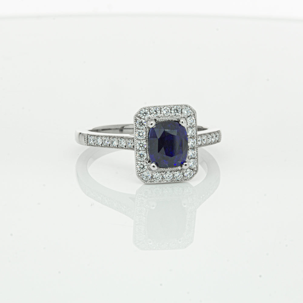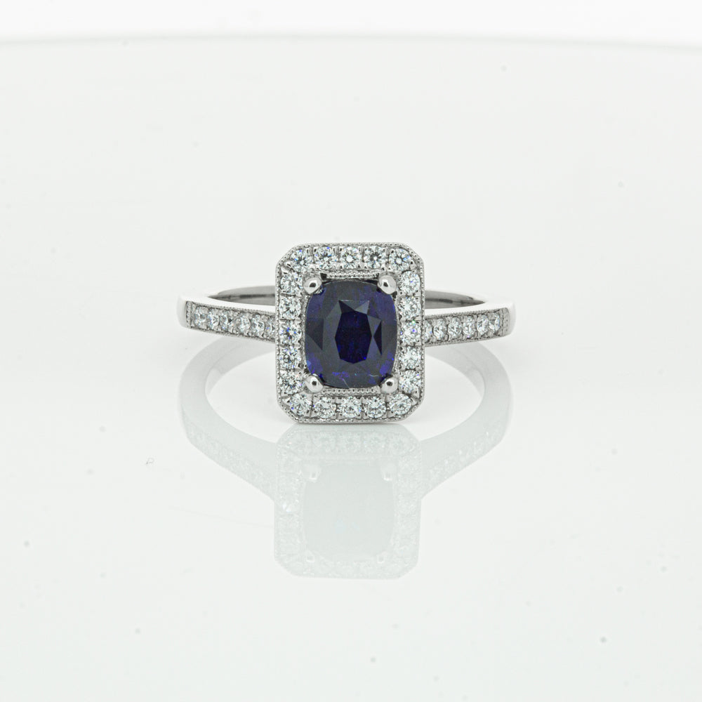 A classic but stylish choice, this elegant sapphire and diamond Aria ring has a cushion cut sapphire and is surrounded by a halo of bead set diamonds framed in 18ct white gold from our signature 1899 collection. You will treasure this magical ring always.