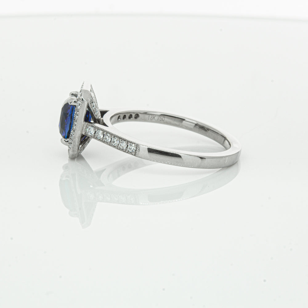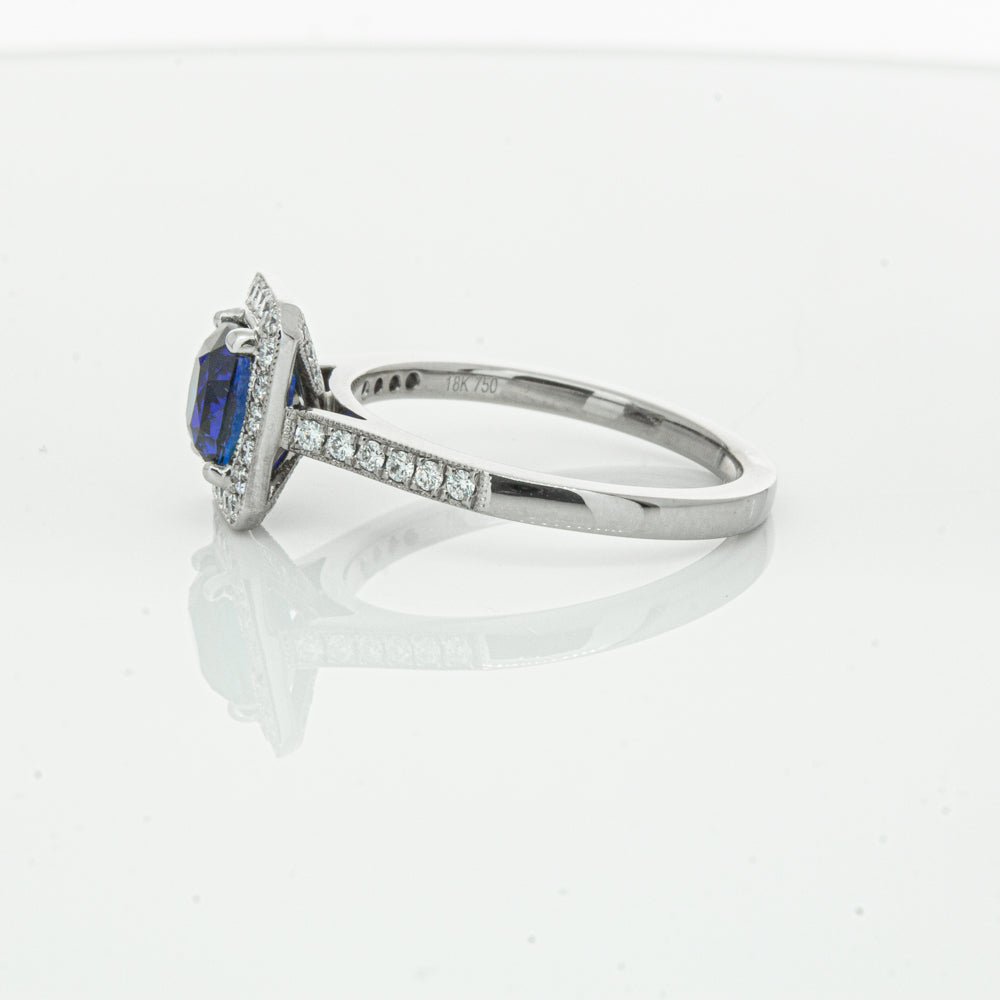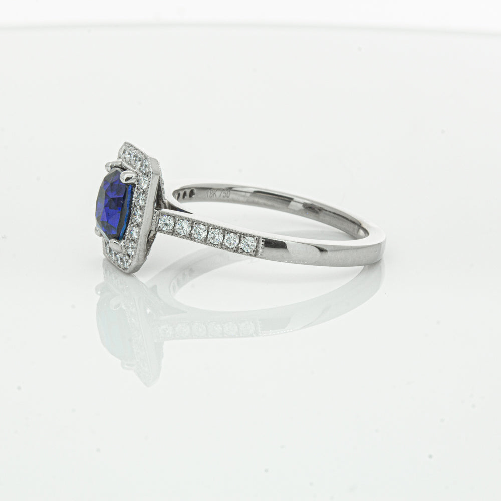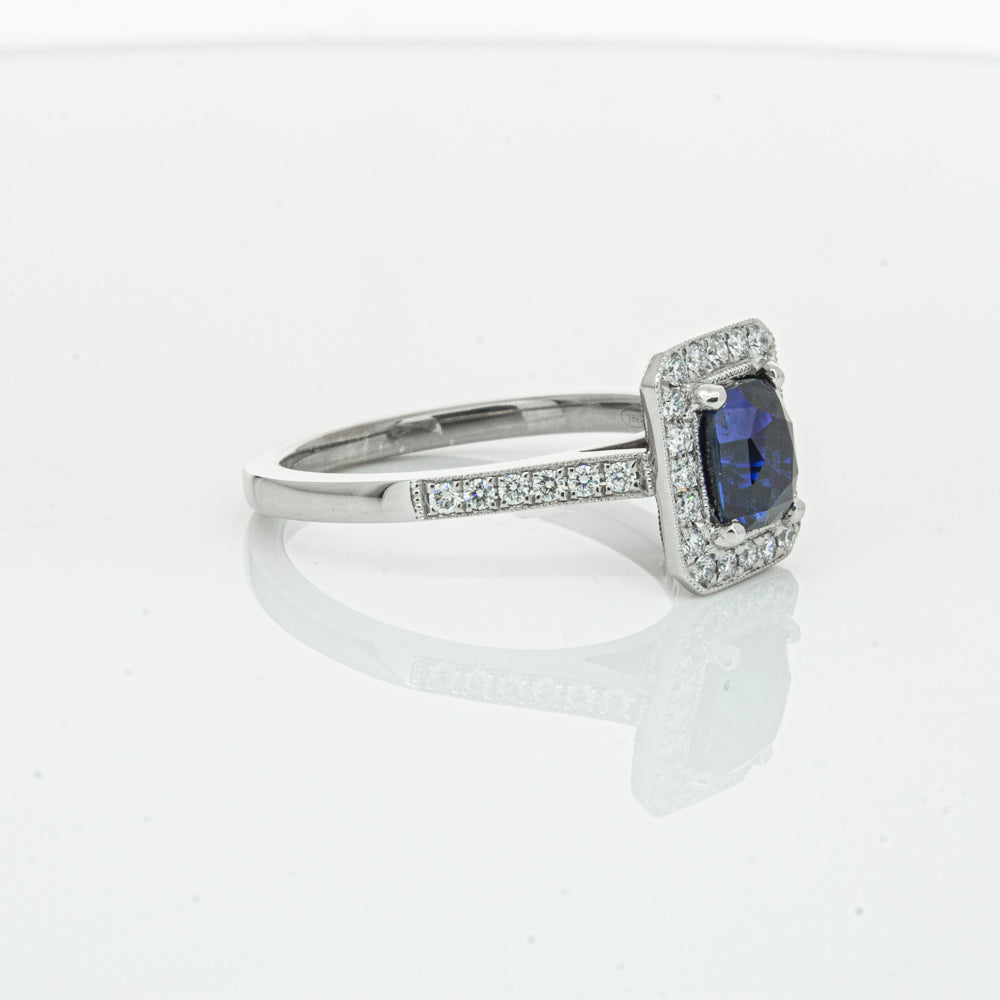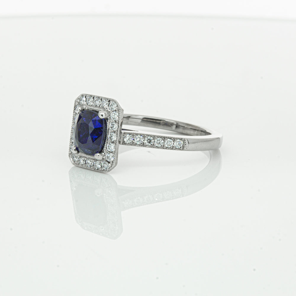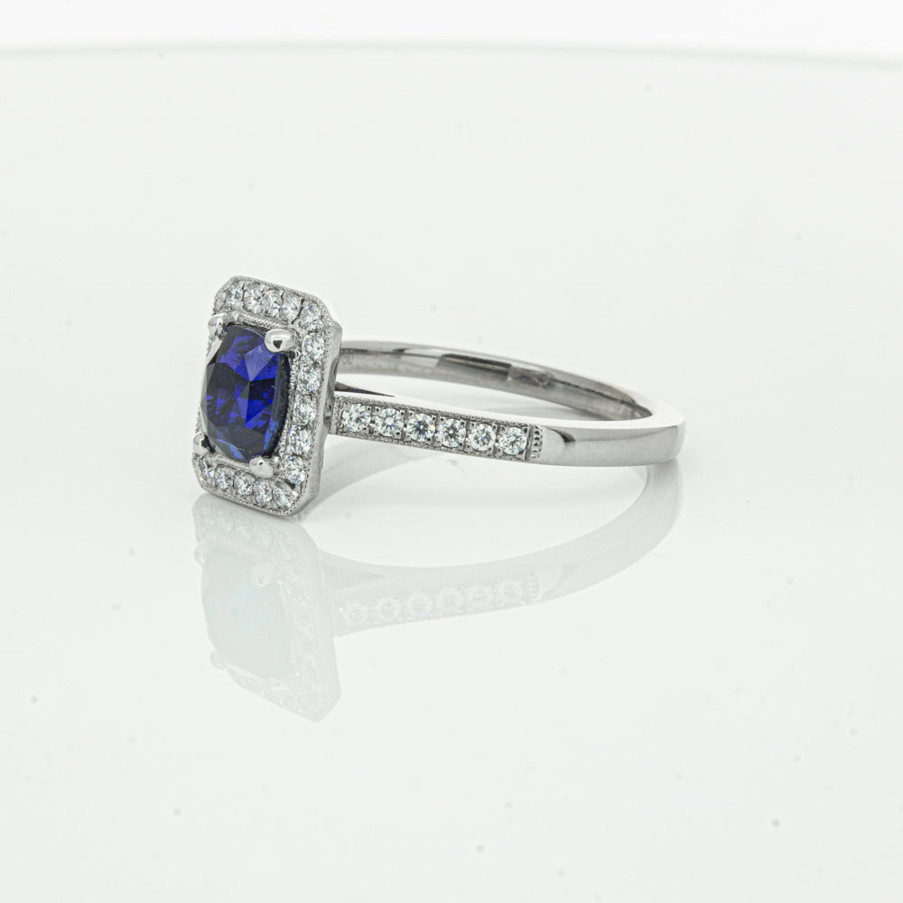 A classic but stylish choice, this elegant sapphire and diamond Aria ring has a cushion cut sapphire and is surrounded by a halo of bead set diamonds framed in 18ct white gold from our signature 1899 collection. You will treasure this magical ring always.