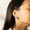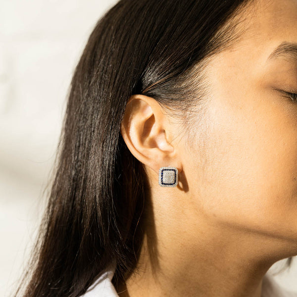 18ct white gold earrings featuring one hundred and thirty dazzing diamonds with a total diamond weight of 1.20cts & forty strong dark blue sapphires with a total weight of .80cts.