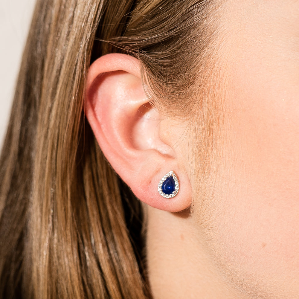 Glisten in these sophisticated sapphire and diamond studs. Crafted in luxurious 18ct white gold from our signature 1899 collection, this dazzling duo boasts two pear faceted blue sapphires framed by twinkling round brilliant cut diamonds. You will never want to take them off!