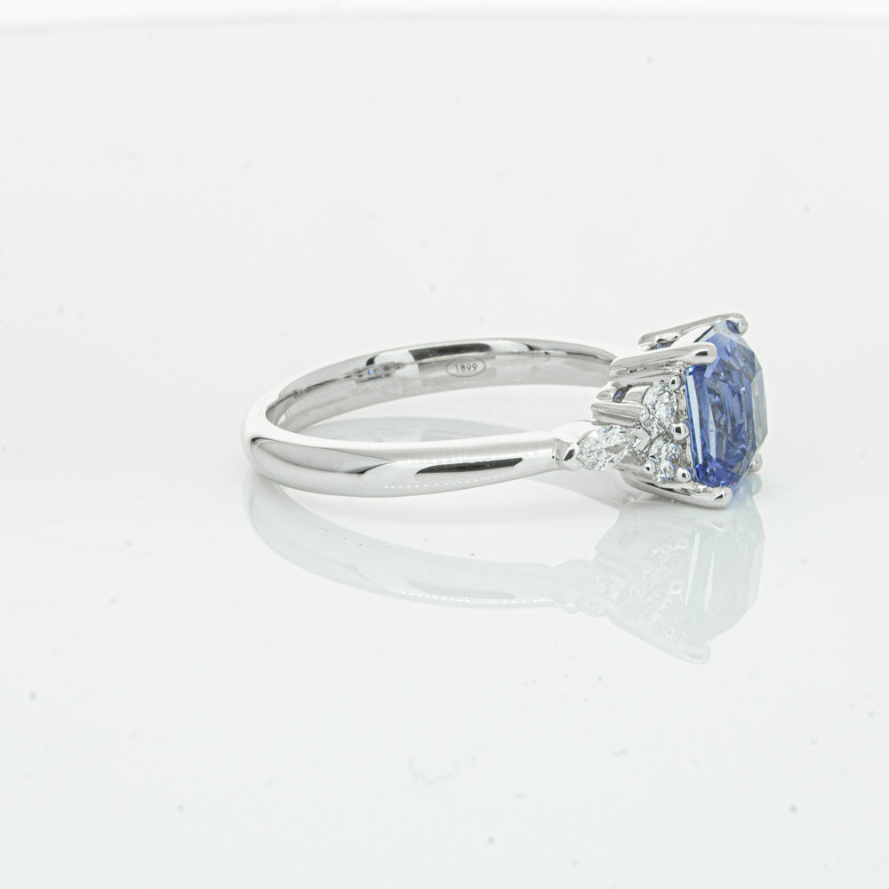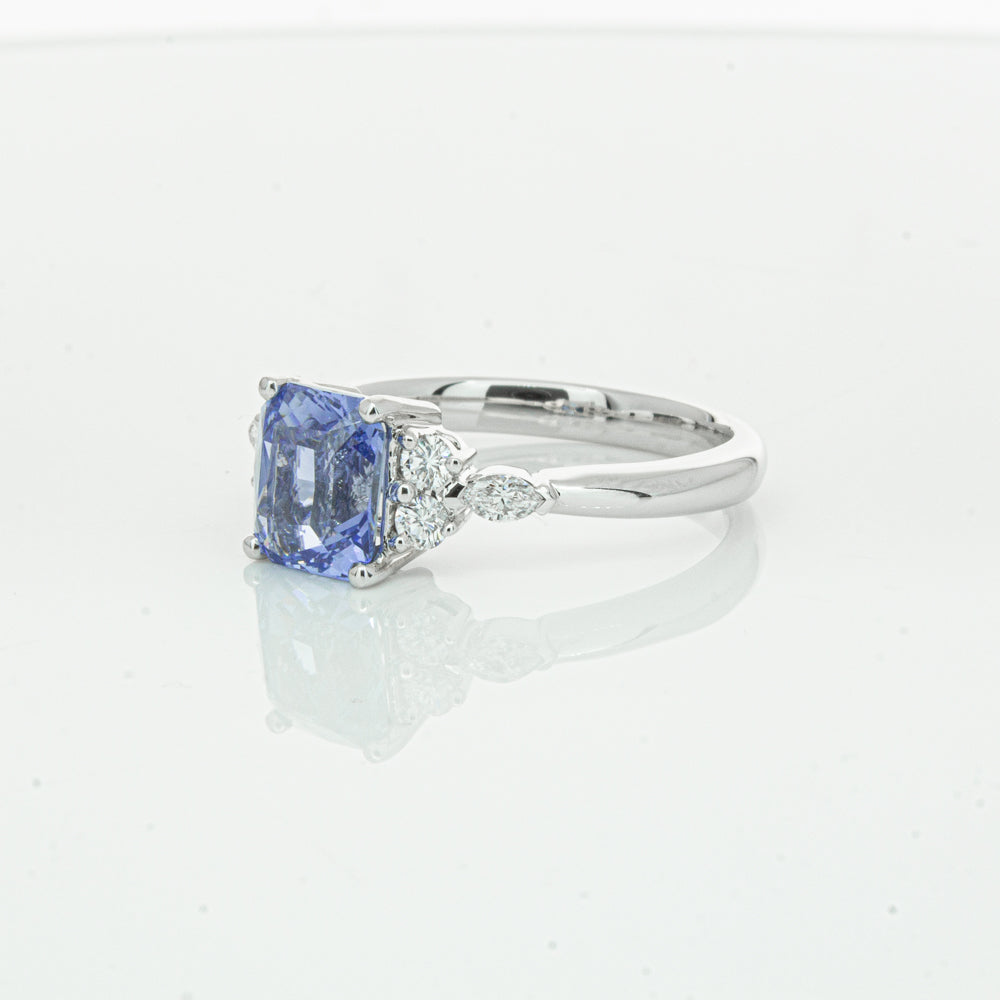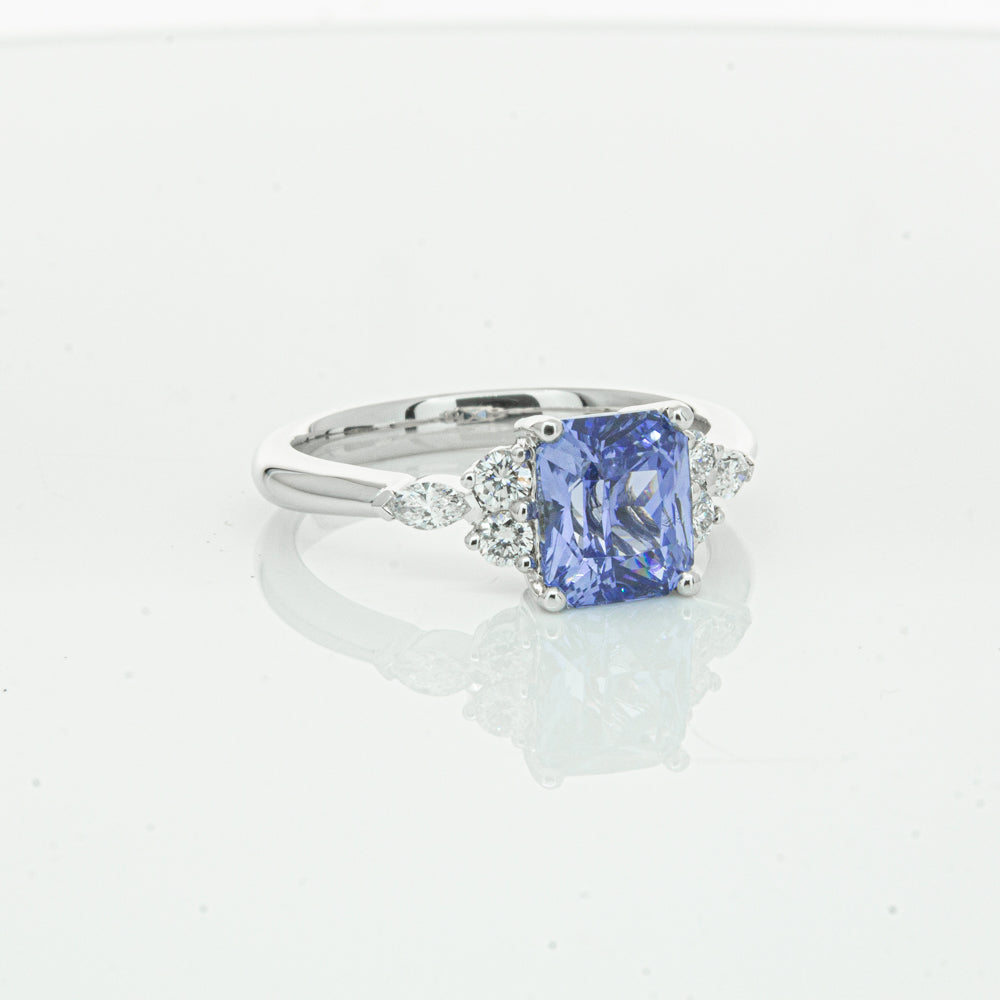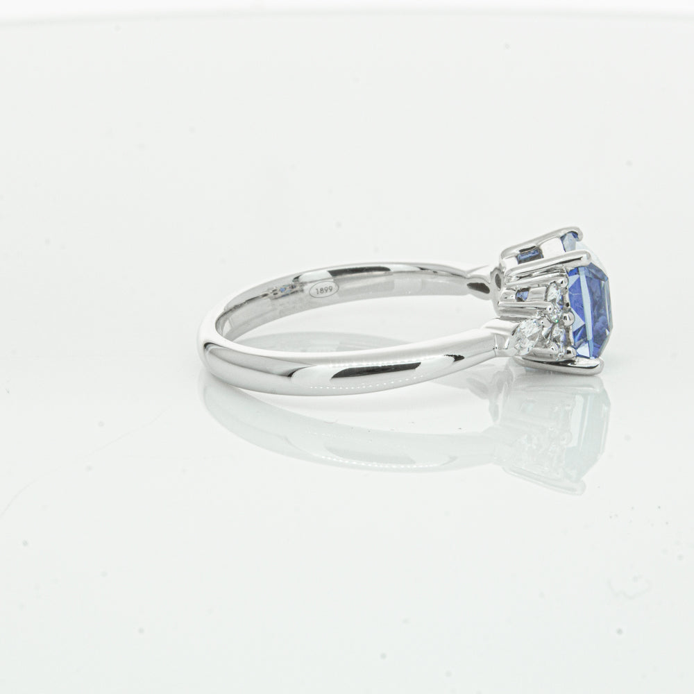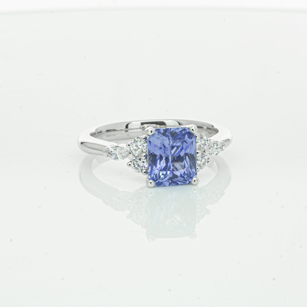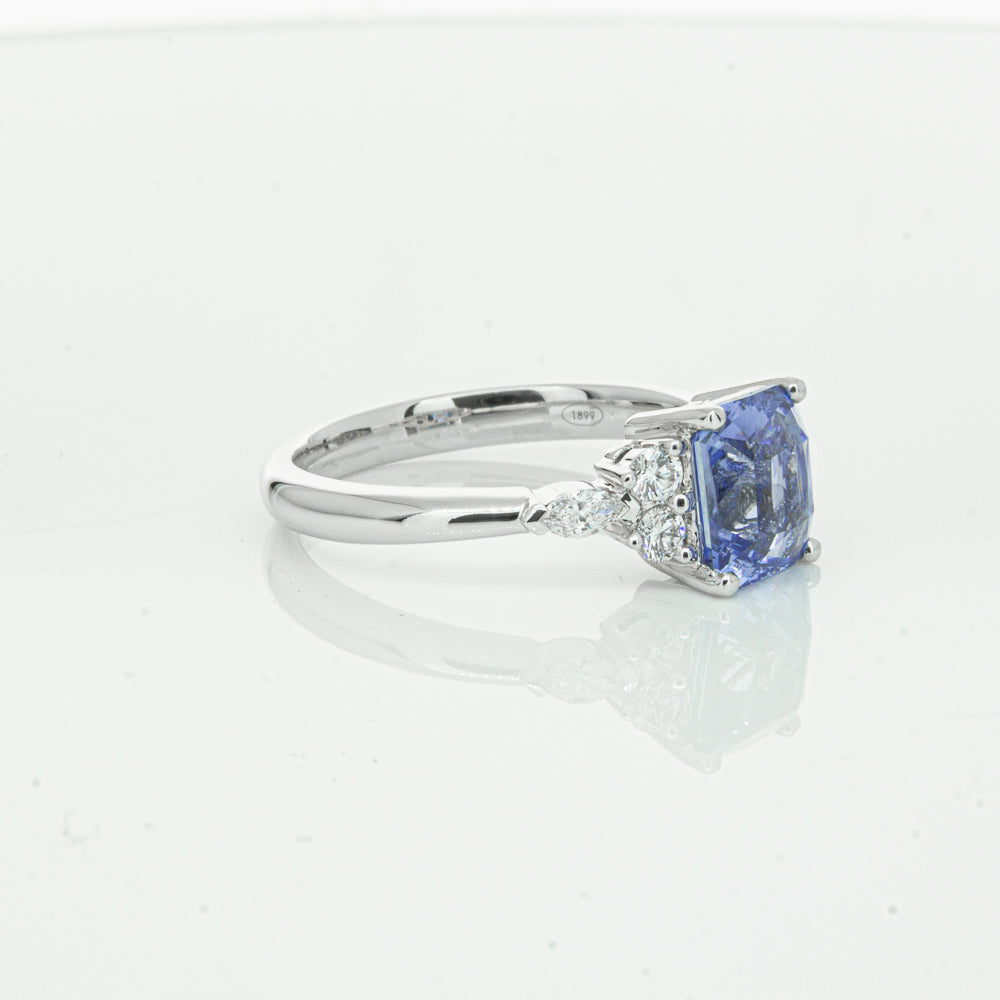 Exuding light and crafted perfectly in 18ct white gold from our signature 1899 collection, this beautiful Oriana ring boasts an impressive rectangular faceted sapphire with marquise and round brilliant cut diamond set shoulders.