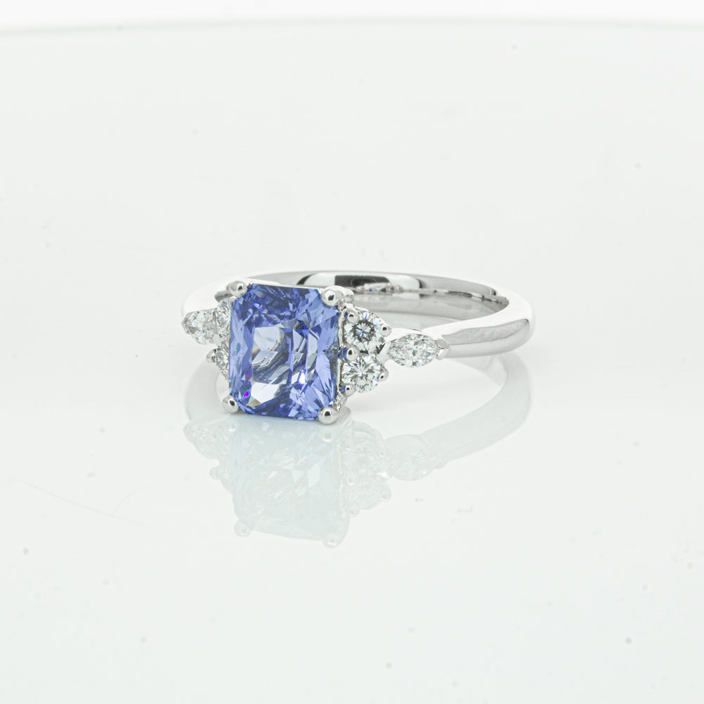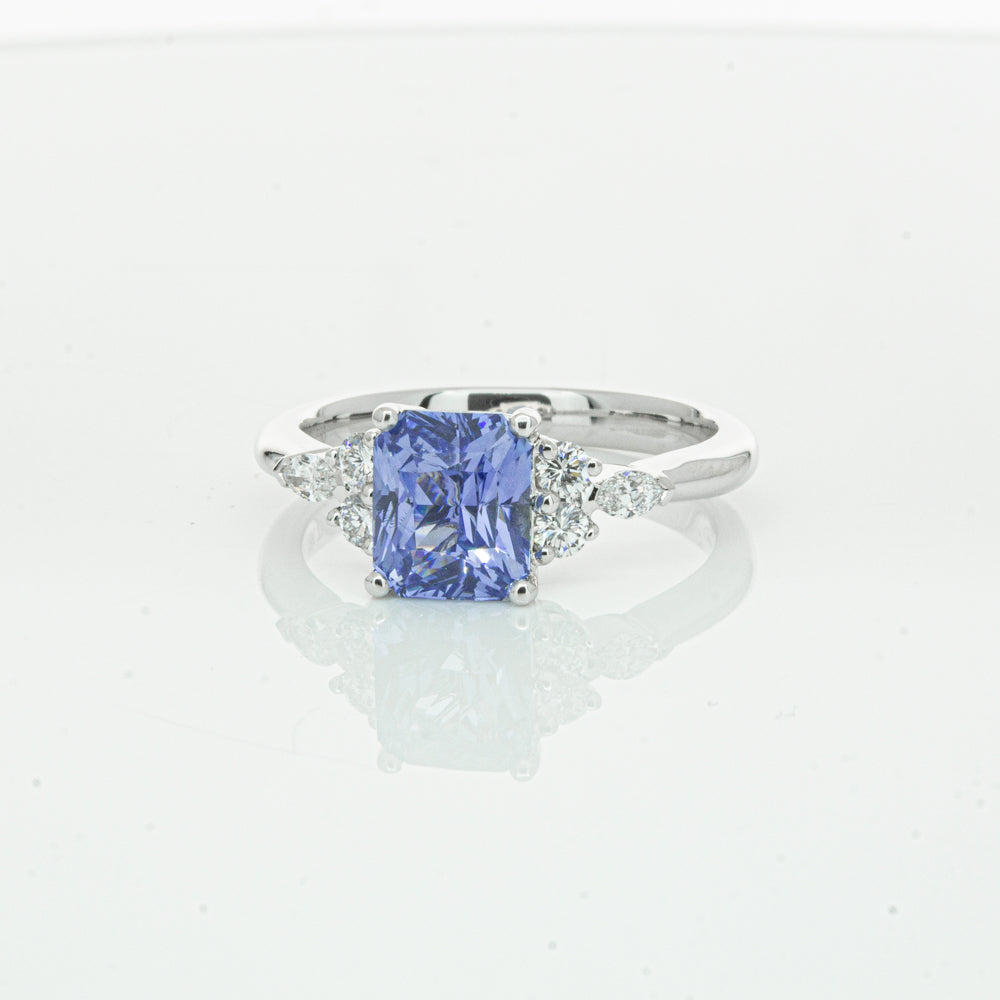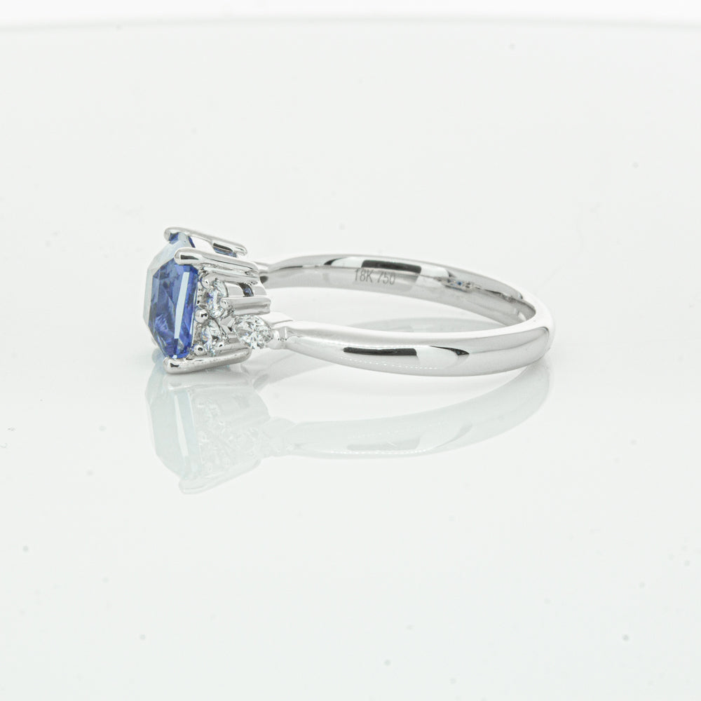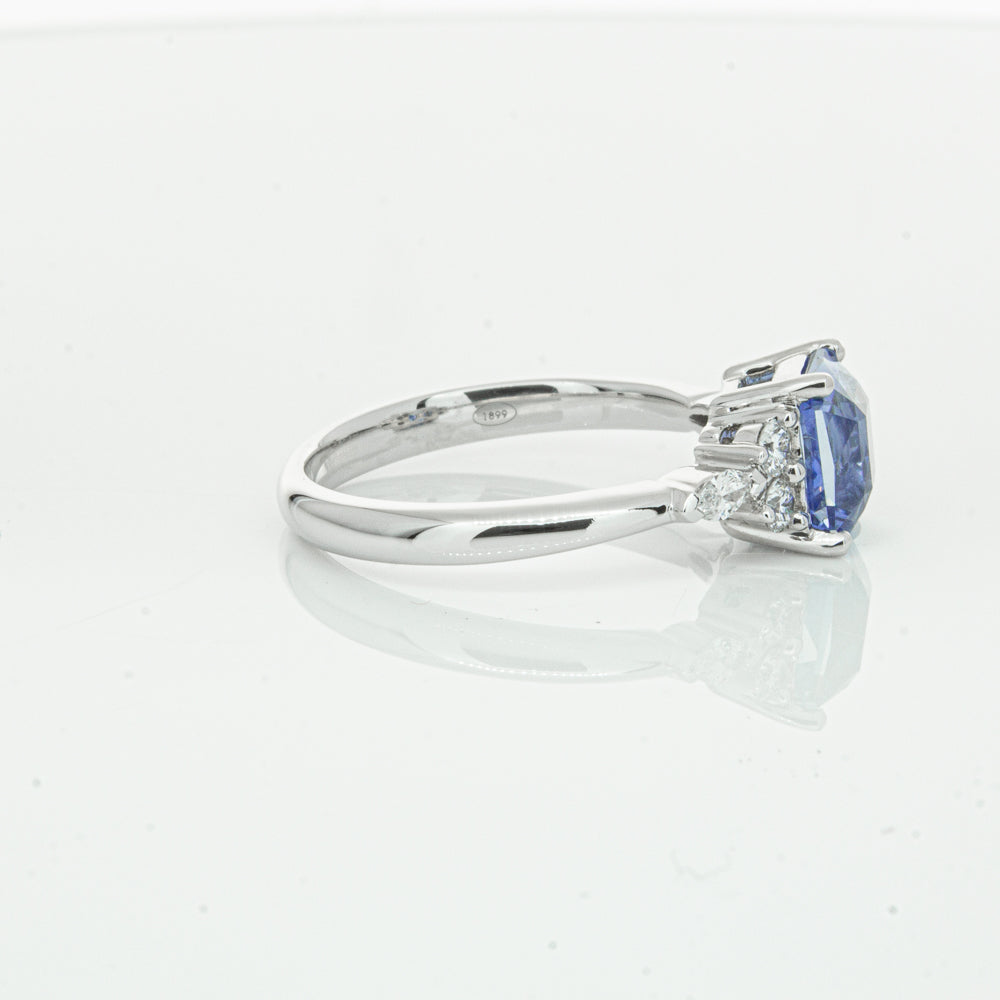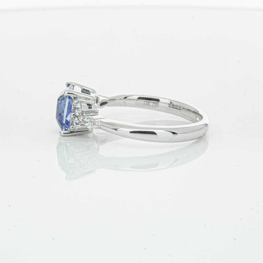 Exuding light and crafted perfectly in 18ct white gold from our signature 1899 collection, this beautiful Oriana ring boasts an impressive rectangular faceted sapphire with marquise and round brilliant cut diamond set shoulders.