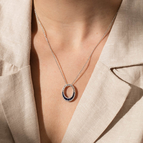Carefully crafted to perfection from luxurious 18ct white gold, this shimmering pendant features a line of tapering round faceted sapphires inside a halo of round brilliant cut diamonds. A wonderful piece of jewellery for a September born beauty.