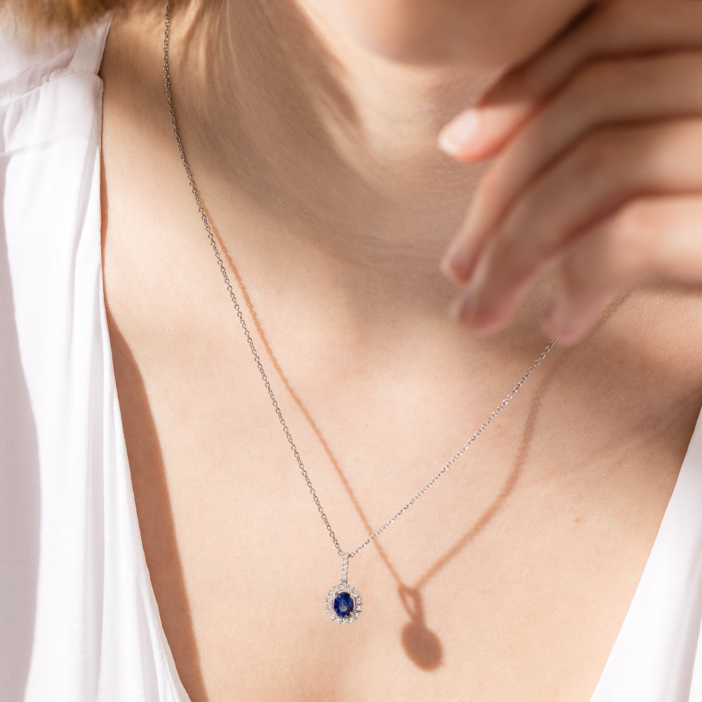 This gorgeous pendant consists of an oval faceted sapphire encased with nineteen round brilliant cut diamonds set in 18ct white gold.