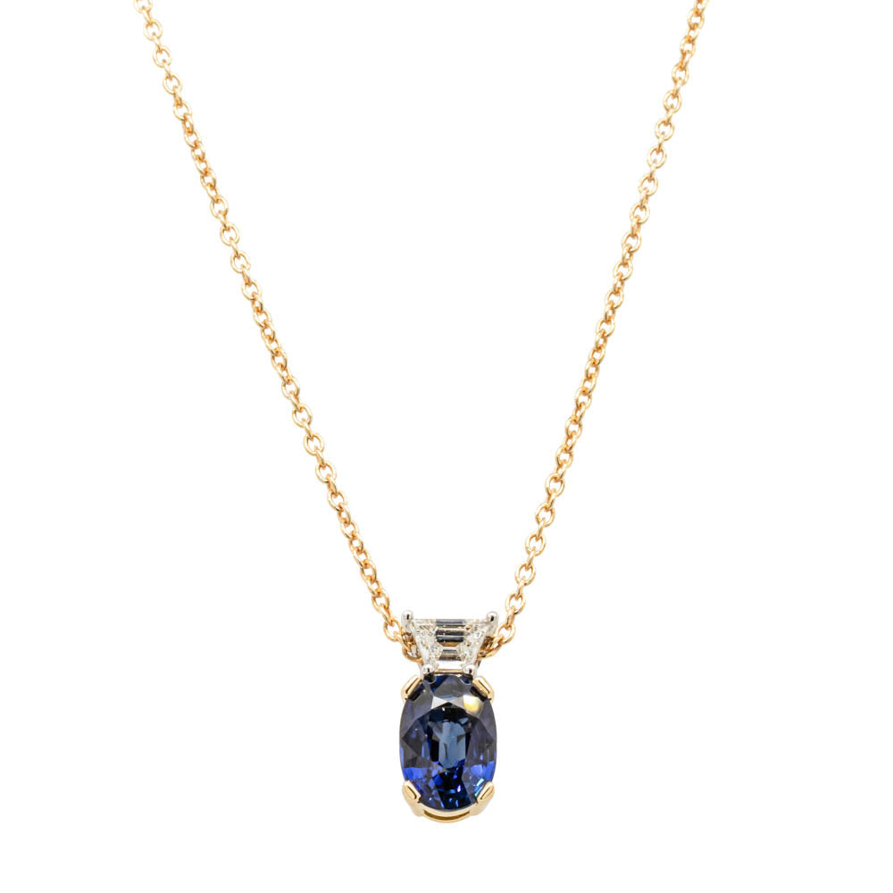 This gorgeous pendant consists of a oval faceted sapphire resting below a tapering diamond set bail, set in 18ct yellow gold from our signature 1899 collection.