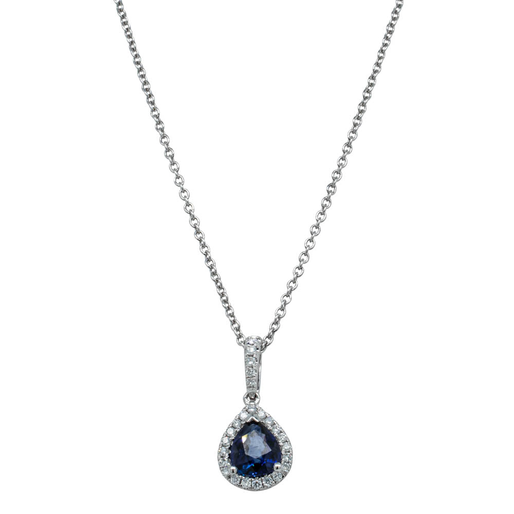 This gorgeous pendant consists of a pear faceted sapphire surrounded by a halo of round brilliant cut diamonds and resting below a tapering diamond set bail, set in 18ct white gold.