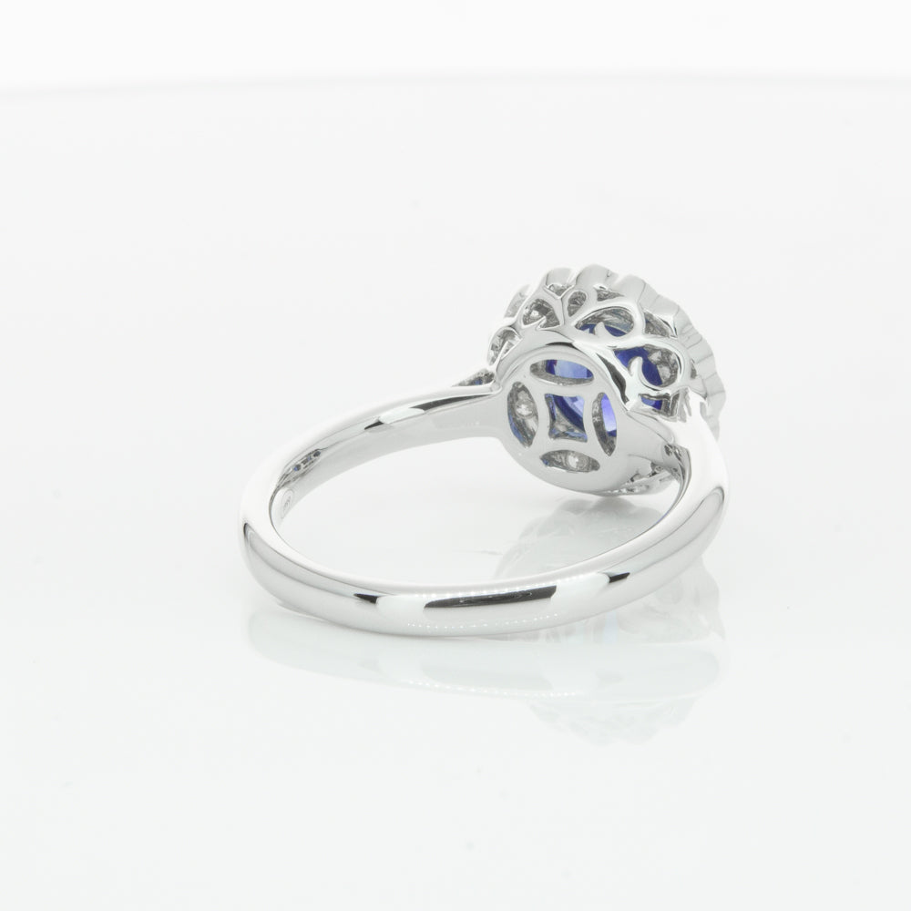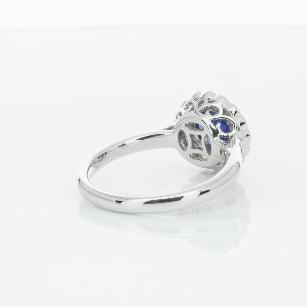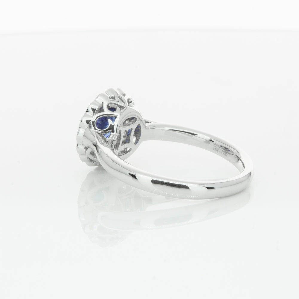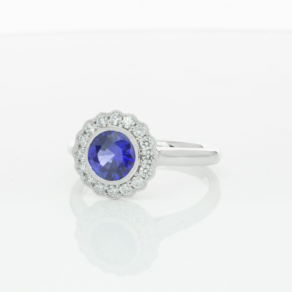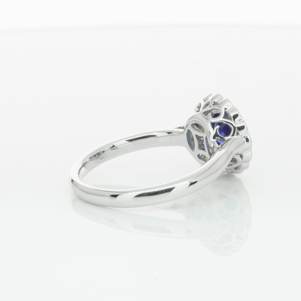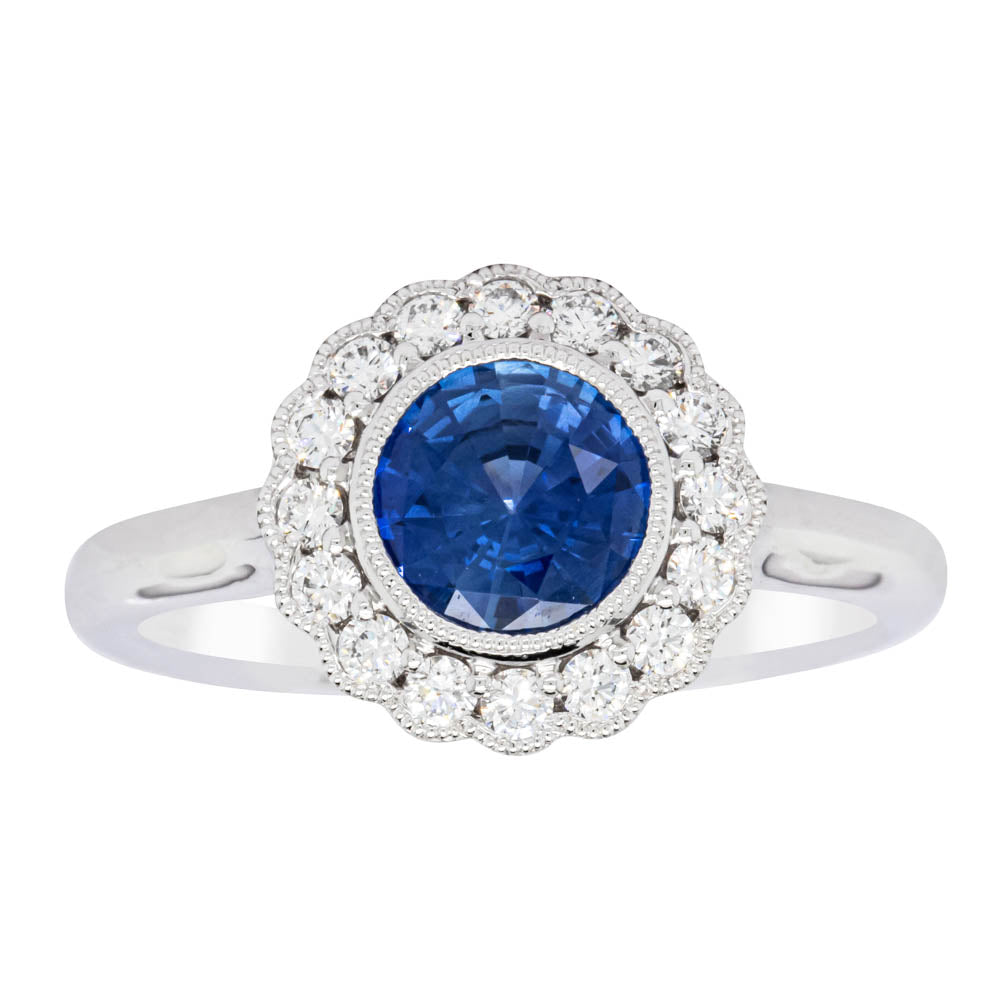 Surrounded by a framing halo of round brilliant cut diamonds, the deep blue colour of the round faceted sapphire comes on strong, and delivers the constant companionship of brilliant sparkle. This statement ring is set in 18ct white gold.