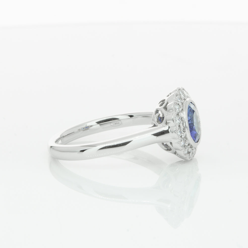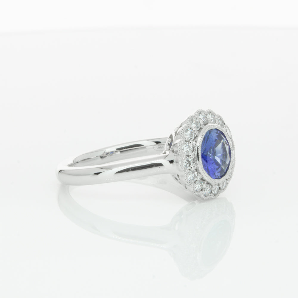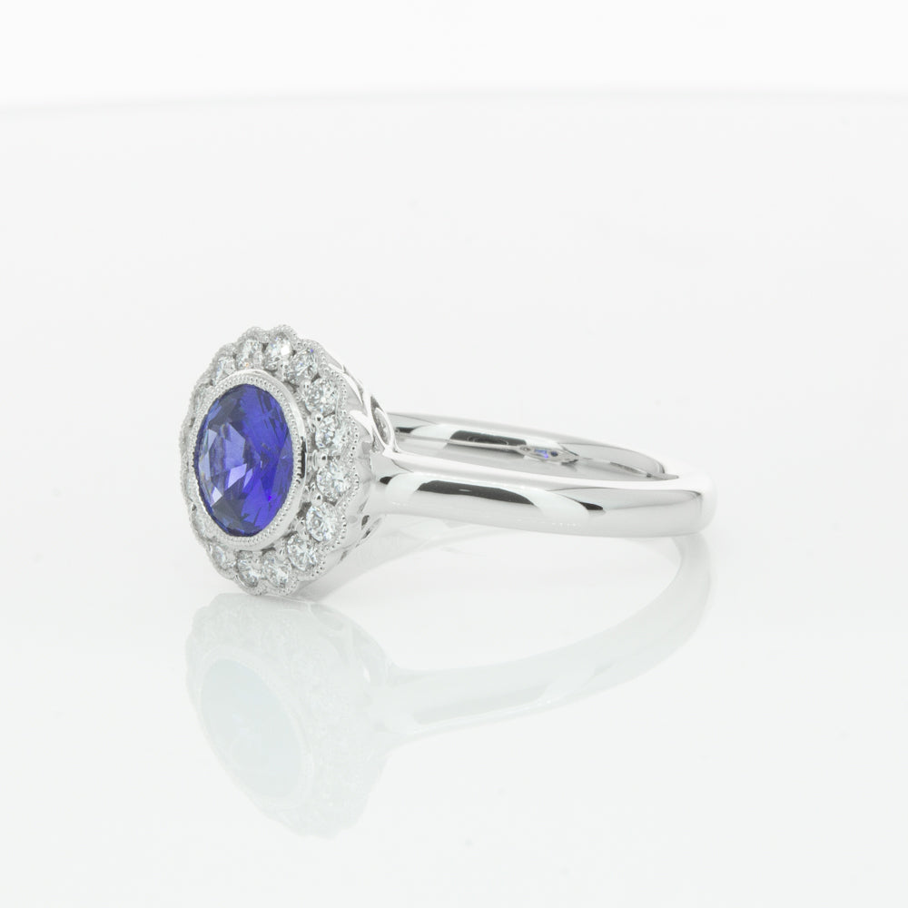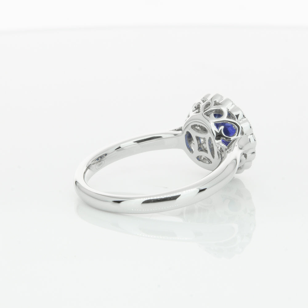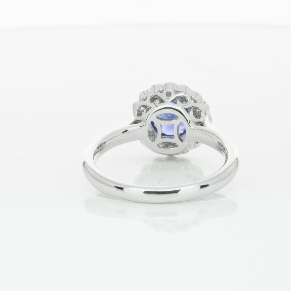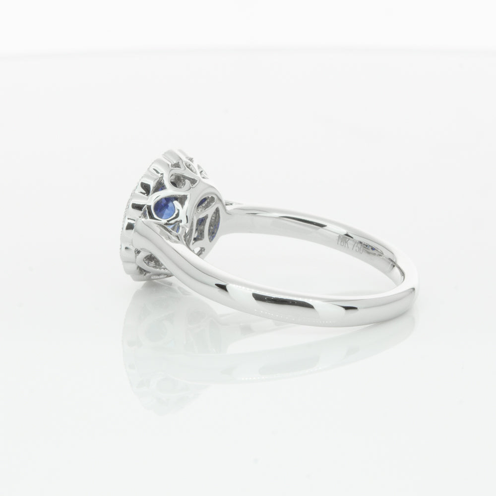 Surrounded by a framing halo of round brilliant cut diamonds, the deep blue colour of the round faceted sapphire comes on strong, and delivers the constant companionship of brilliant sparkle. This statement ring is set in 18ct white gold.