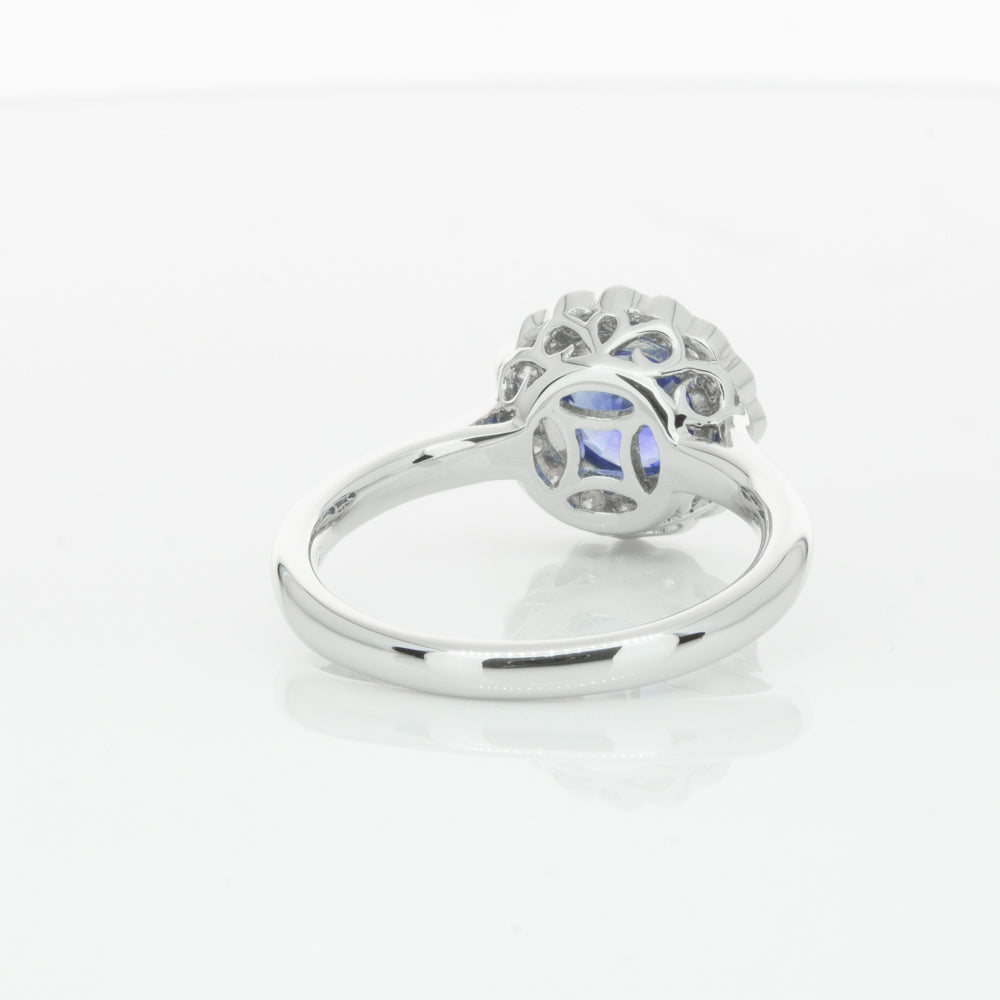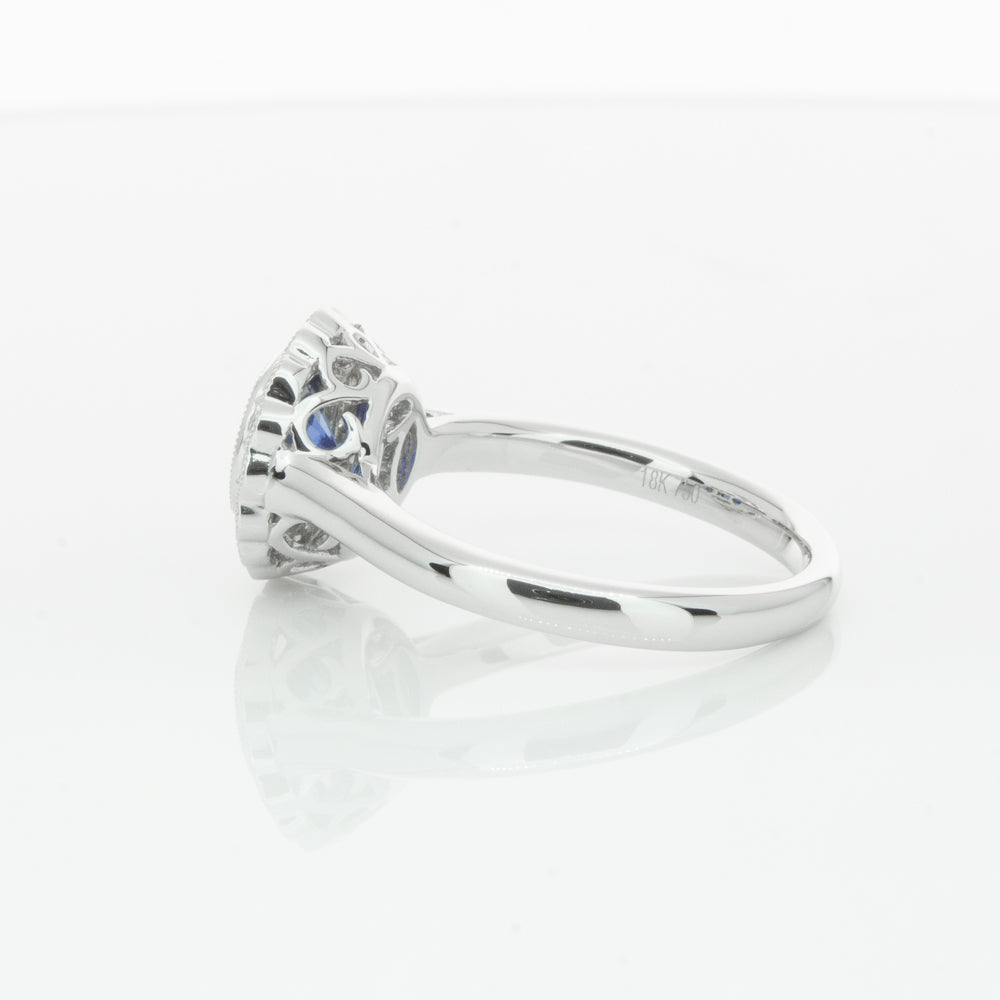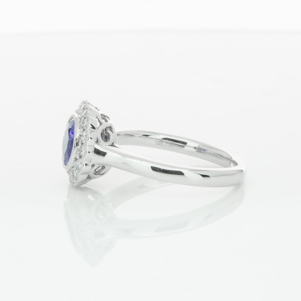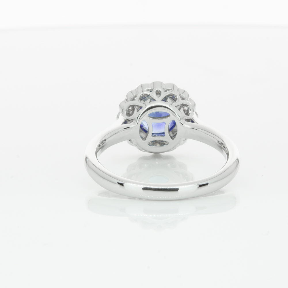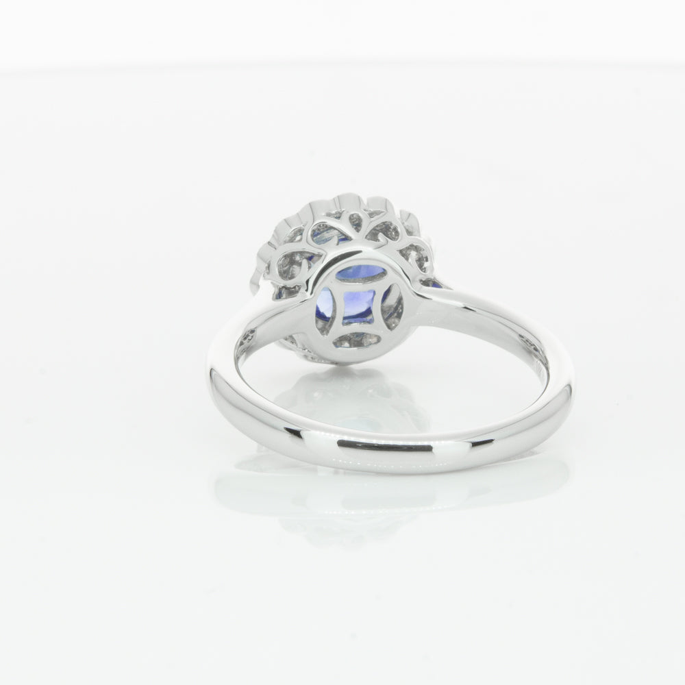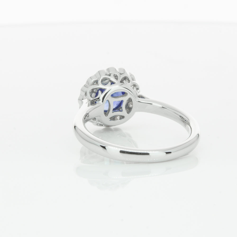 Surrounded by a framing halo of round brilliant cut diamonds, the deep blue colour of the round faceted sapphire comes on strong, and delivers the constant companionship of brilliant sparkle. This statement ring is set in 18ct white gold.
