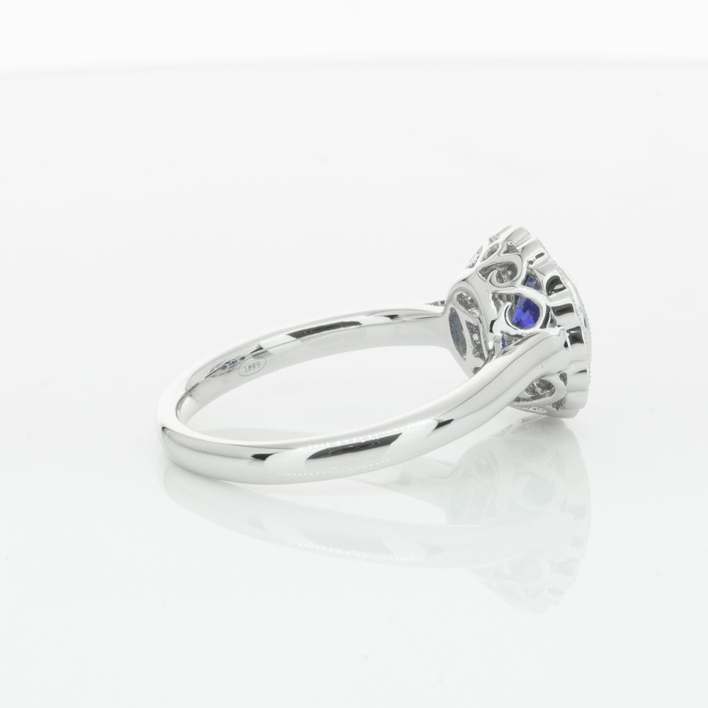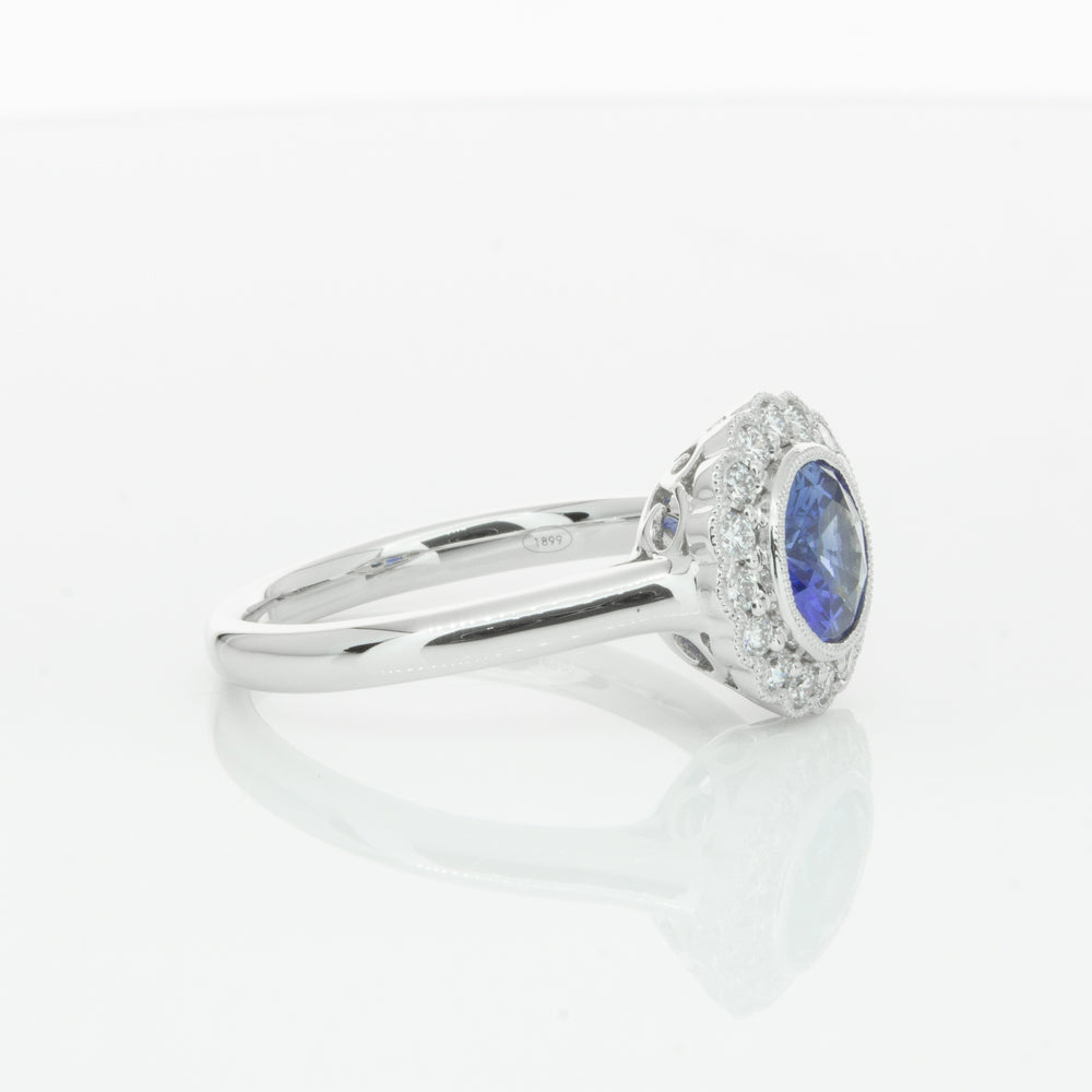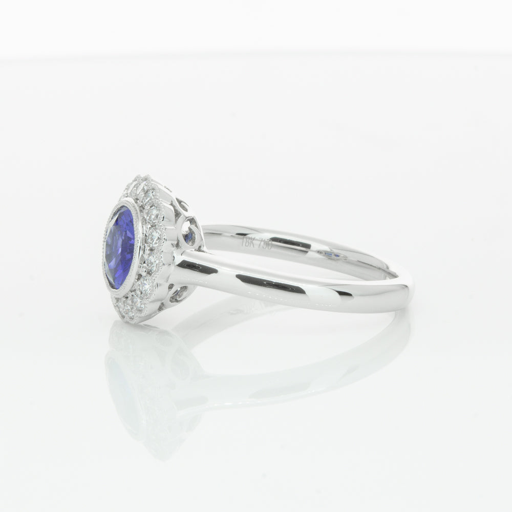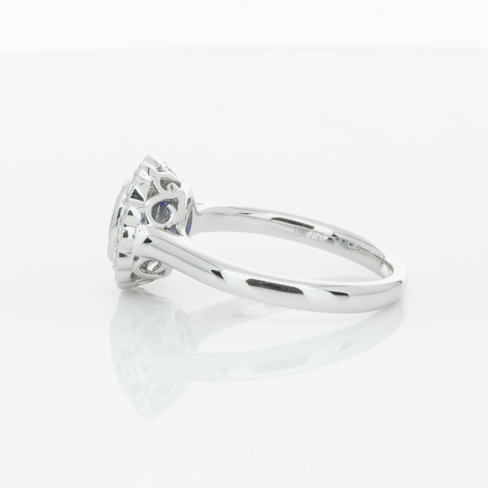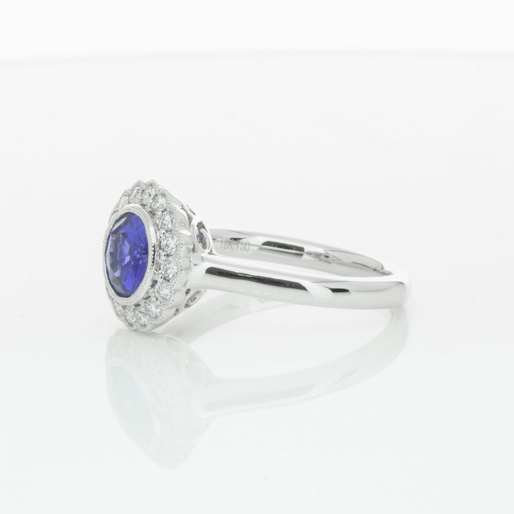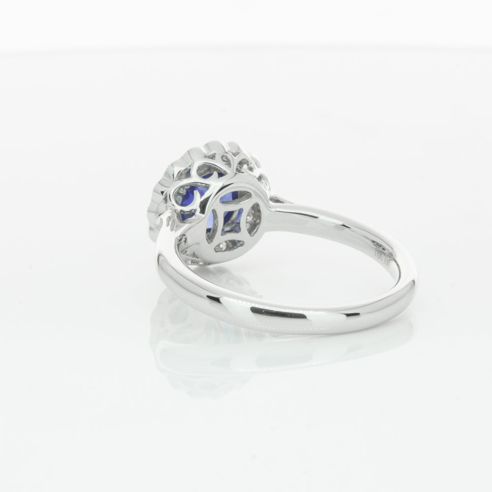 Surrounded by a framing halo of round brilliant cut diamonds, the deep blue colour of the round faceted sapphire comes on strong, and delivers the constant companionship of brilliant sparkle. This statement ring is set in 18ct white gold.