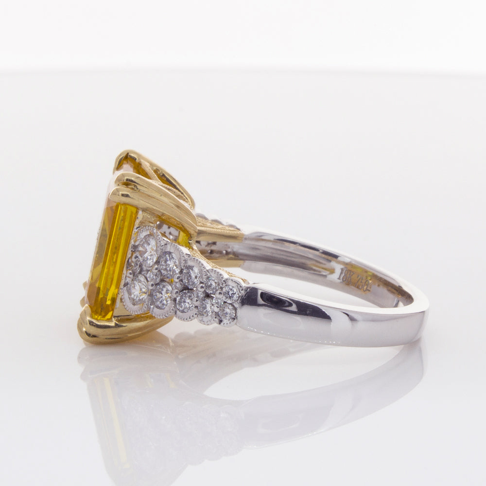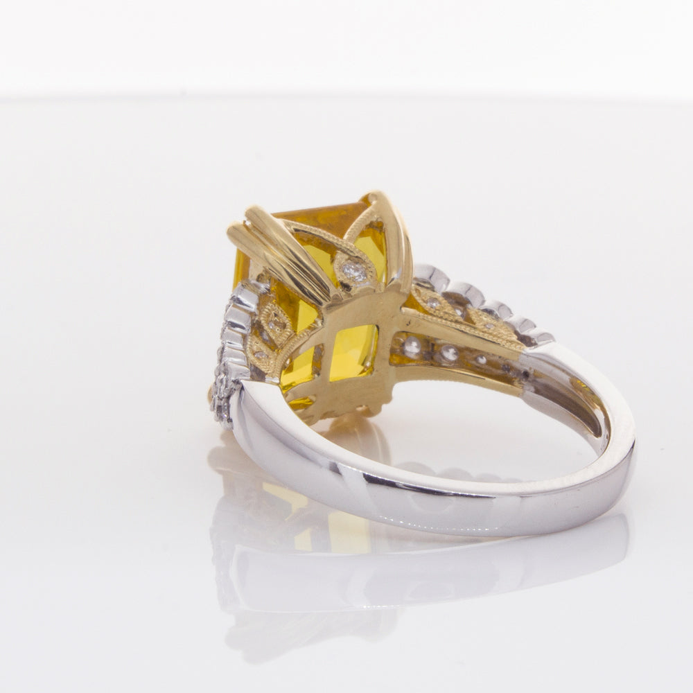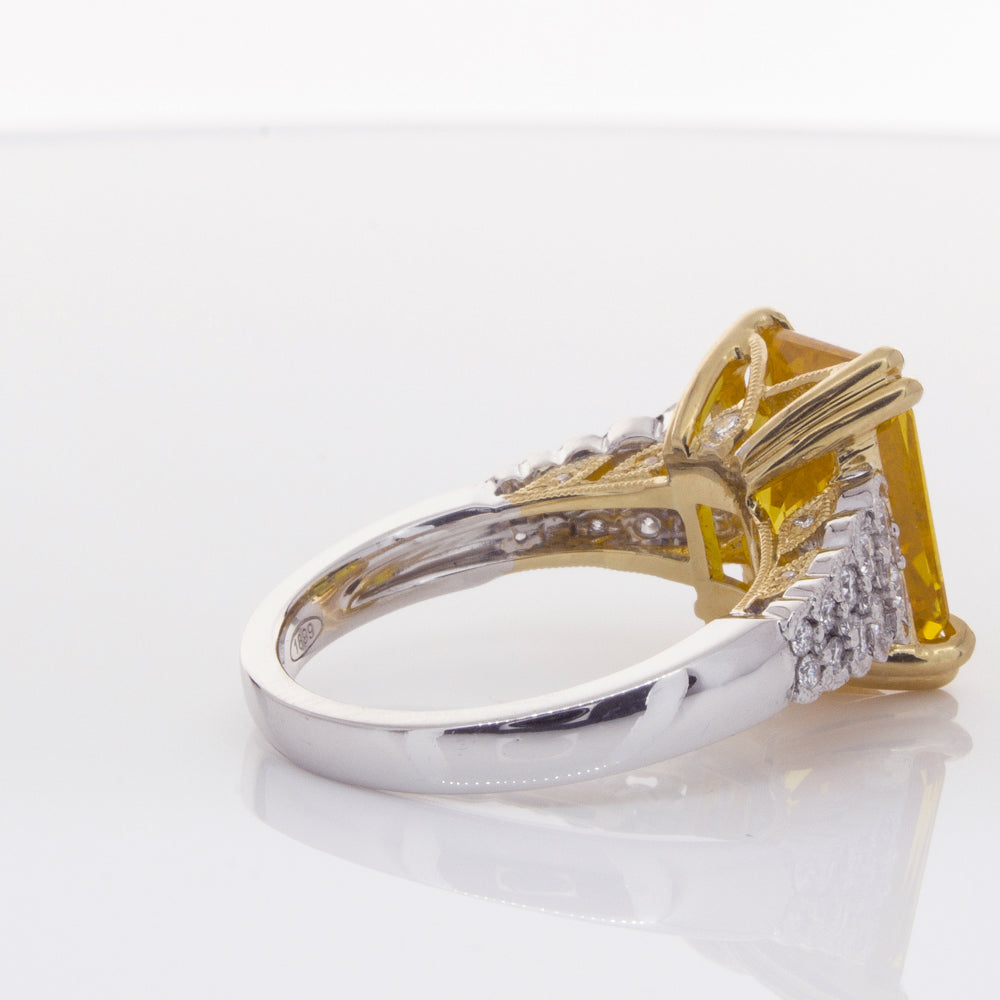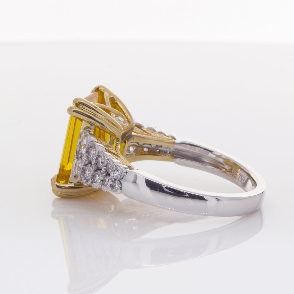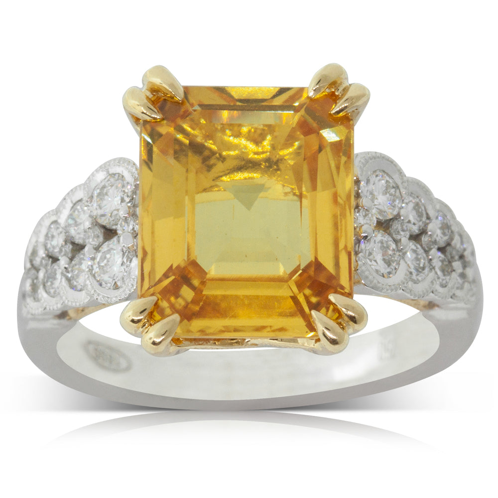 Carefully crafted in 18ct white gold, this gorgeous ring boasts one yellow sapphire set in an 18ct yellow gold double four claw setting, resting on diamond set shoulders featuring forty round brilliant cut diamonds.