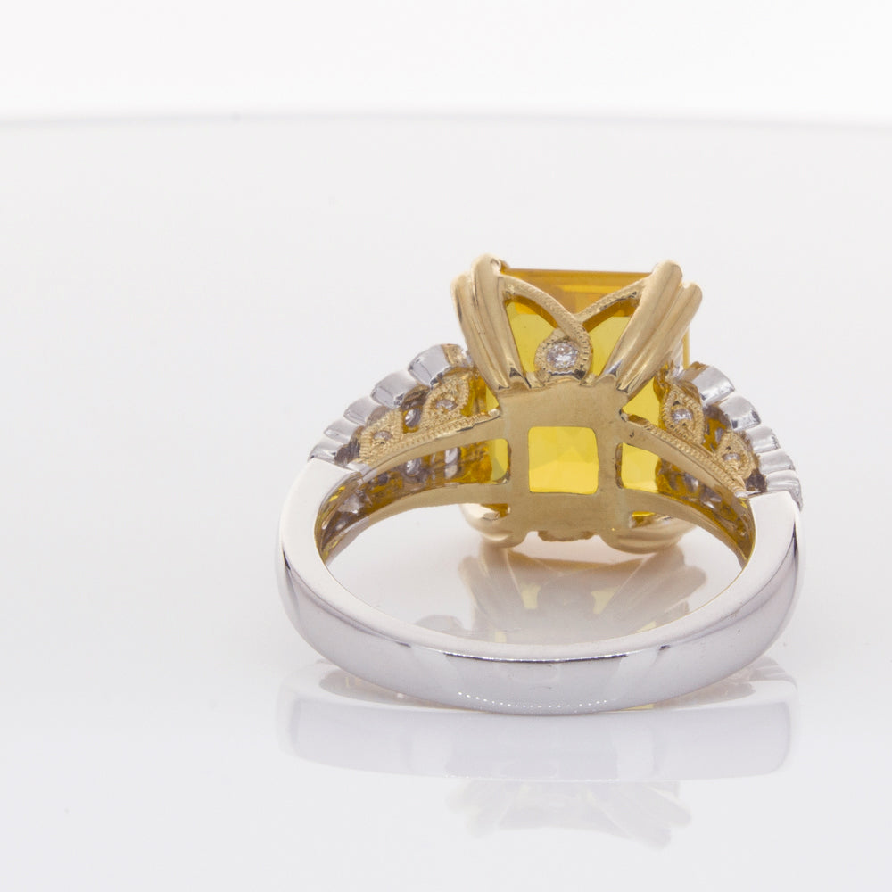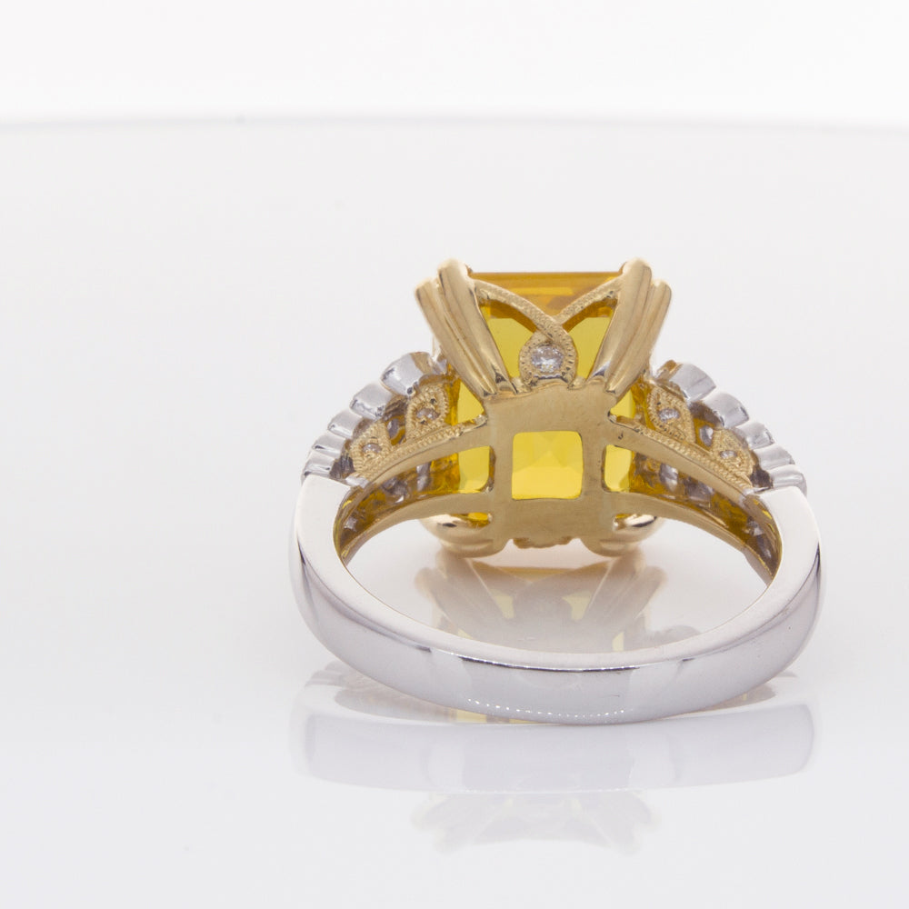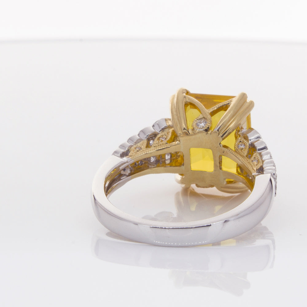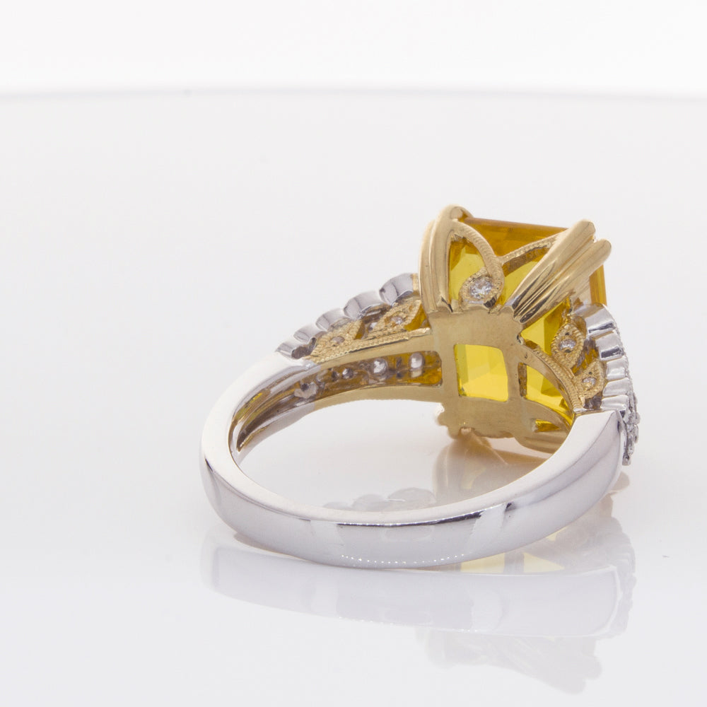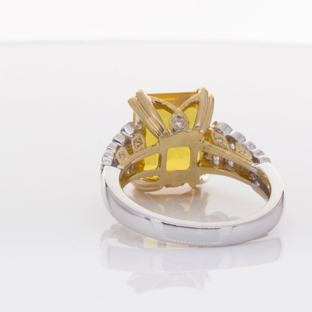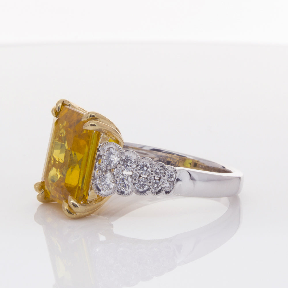 Carefully crafted in 18ct white gold, this gorgeous ring boasts one yellow sapphire set in an 18ct yellow gold double four claw setting, resting on diamond set shoulders featuring forty round brilliant cut diamonds.