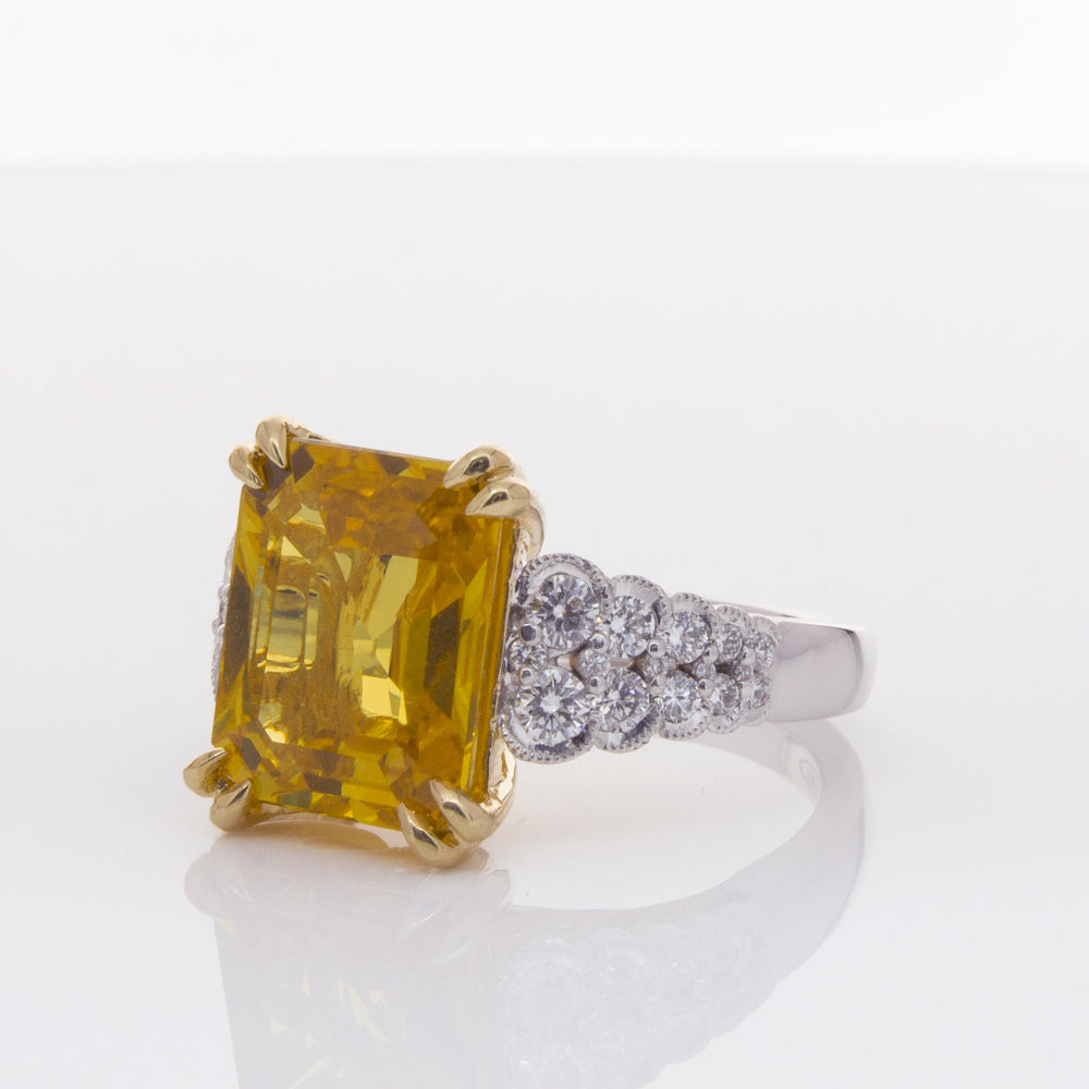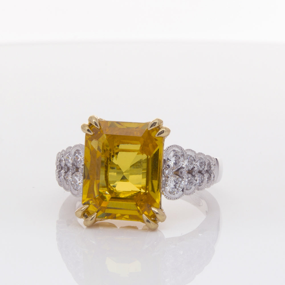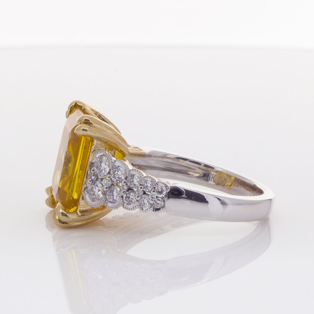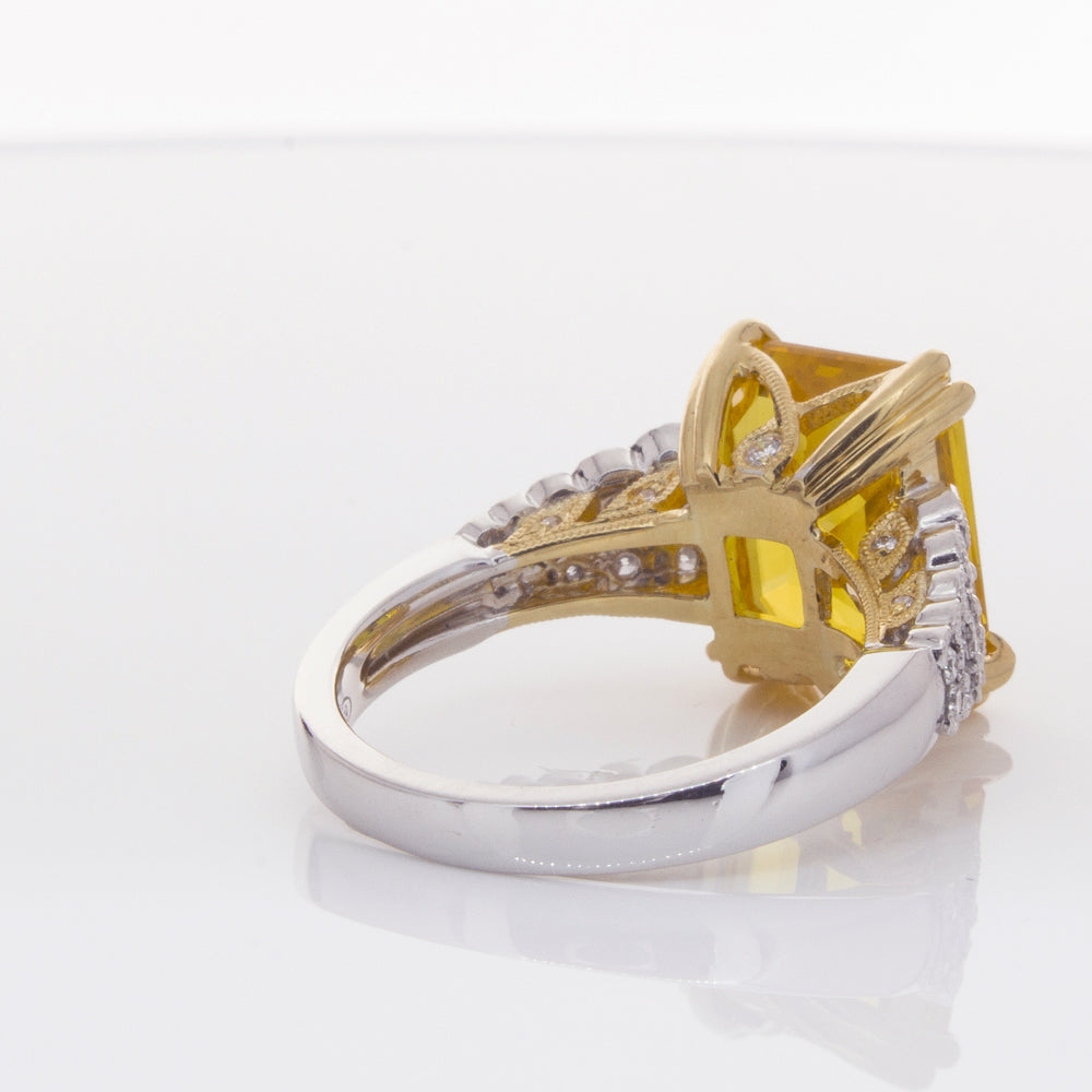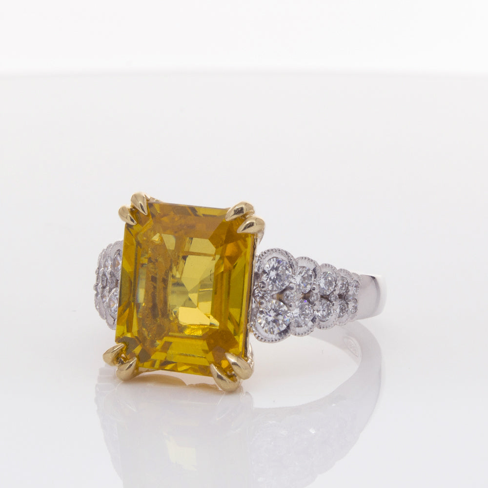 Carefully crafted in 18ct white gold, this gorgeous ring boasts one yellow sapphire set in an 18ct yellow gold double four claw setting, resting on diamond set shoulders featuring forty round brilliant cut diamonds.
