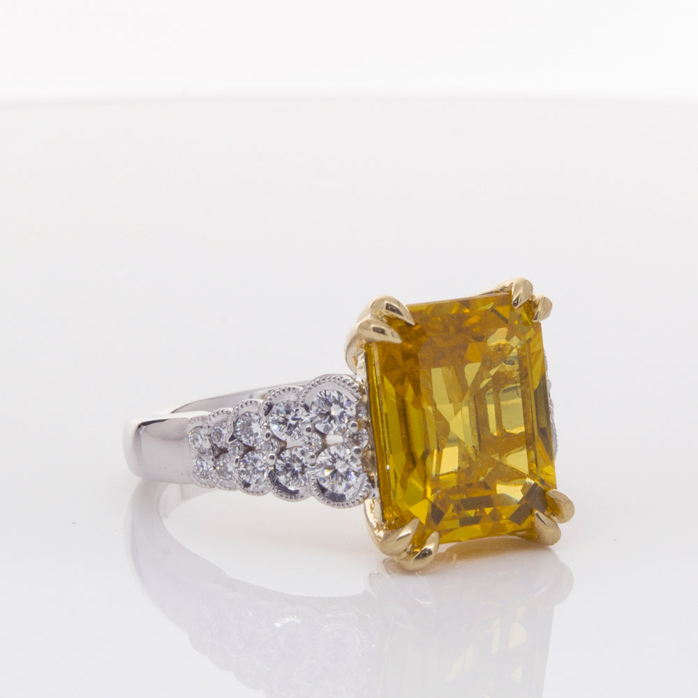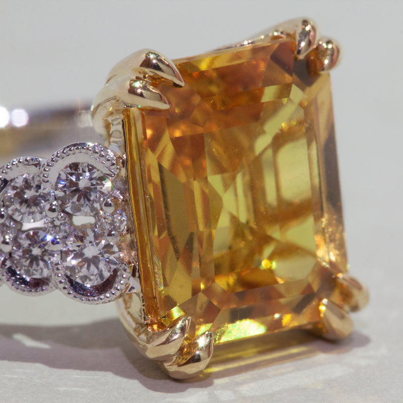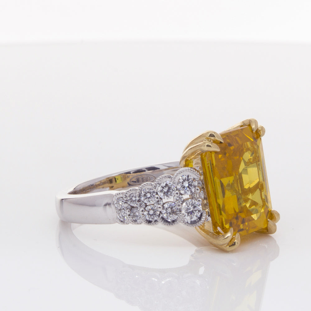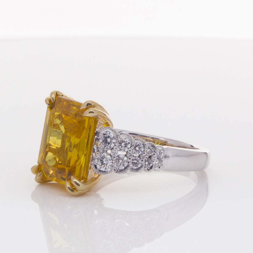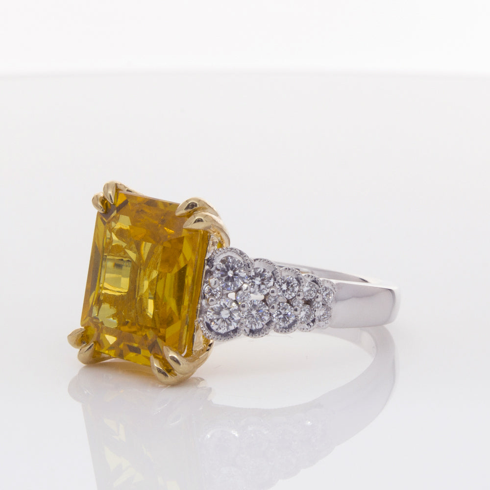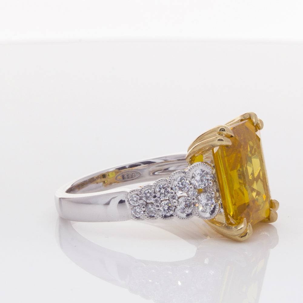 Carefully crafted in 18ct white gold, this gorgeous ring boasts one yellow sapphire set in an 18ct yellow gold double four claw setting, resting on diamond set shoulders featuring forty round brilliant cut diamonds.