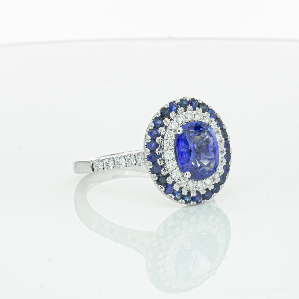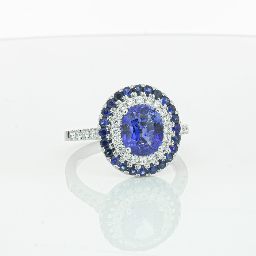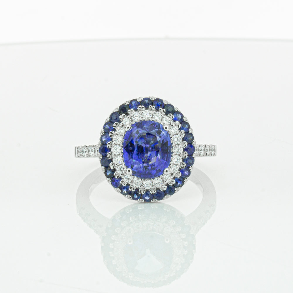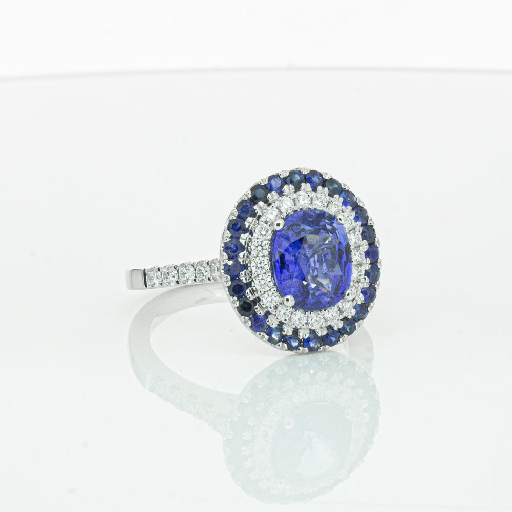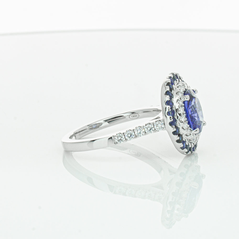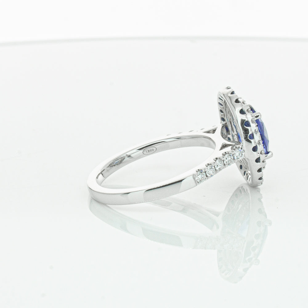 Boasting a round faceted sapphire and a double diamond and sapphire halo you will be the definition of beauty and elegance in this ring from our signature 1899 collection, beautifully set in 18ct white gold.