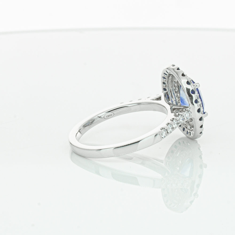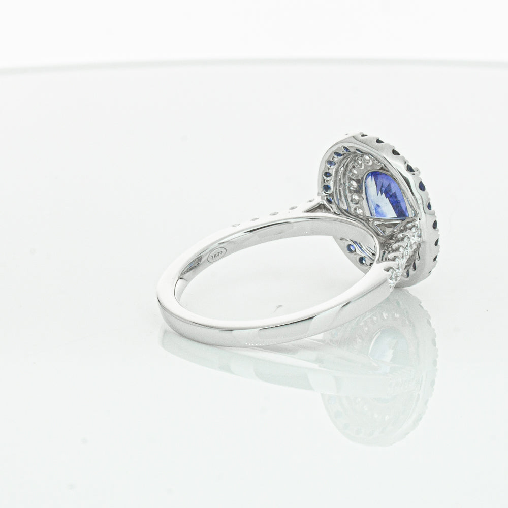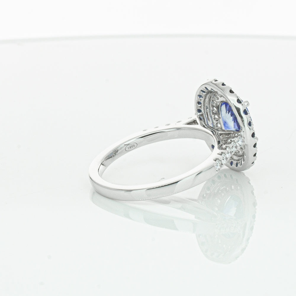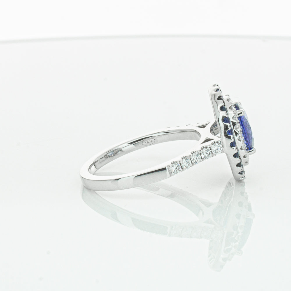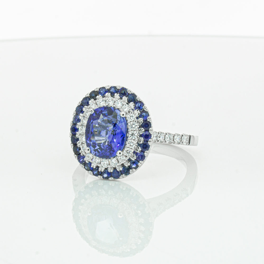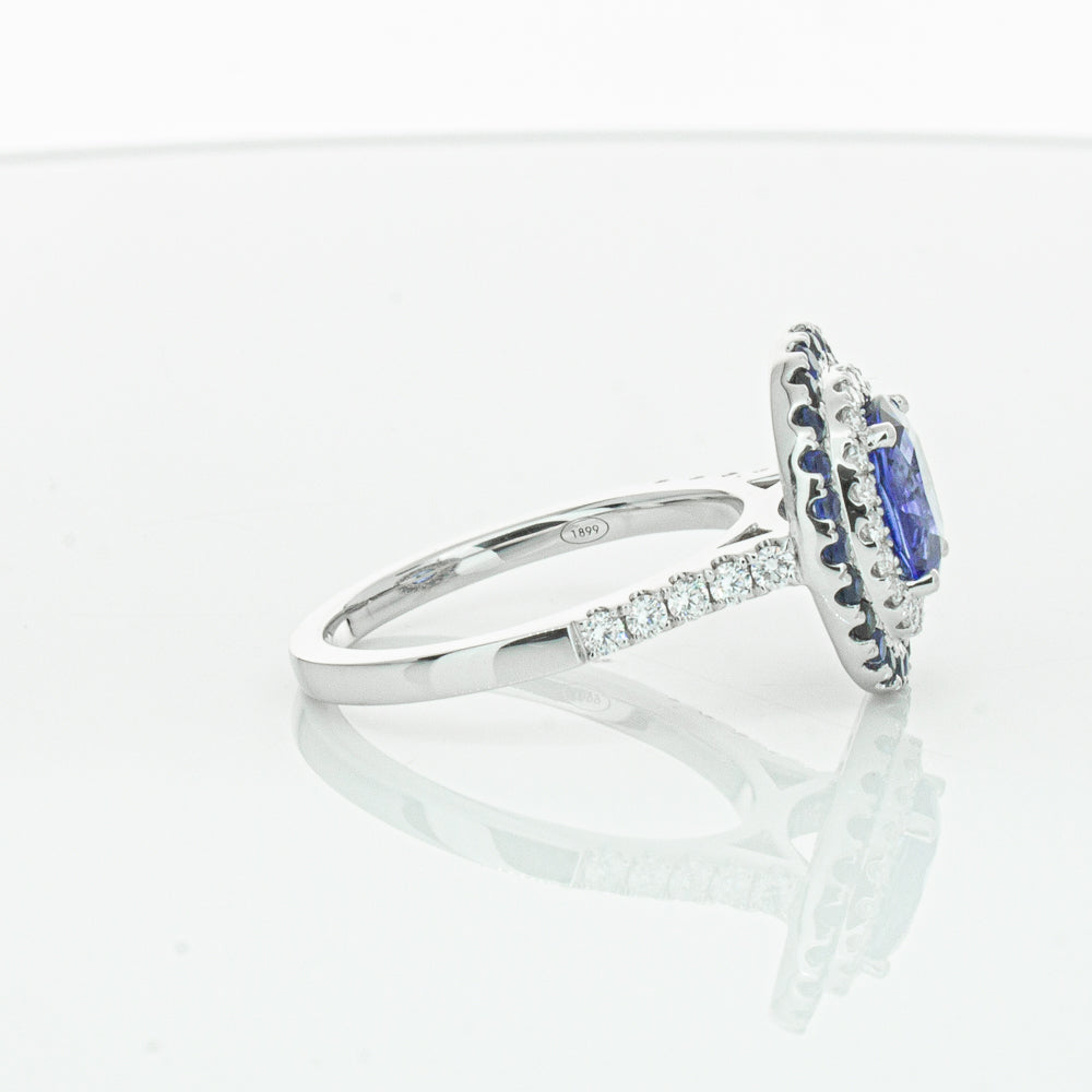 Boasting a round faceted sapphire and a double diamond and sapphire halo you will be the definition of beauty and elegance in this ring from our signature 1899 collection, beautifully set in 18ct white gold.