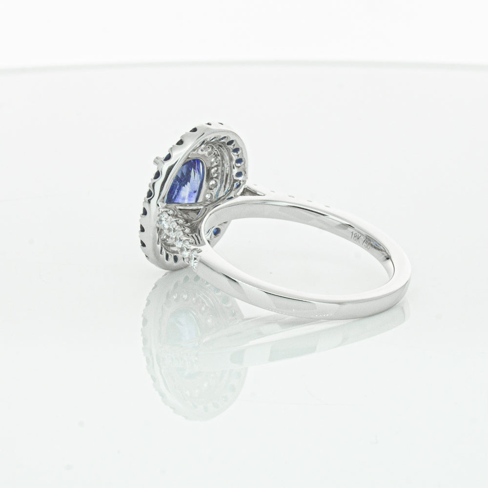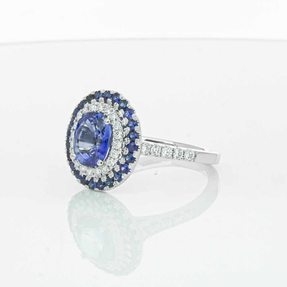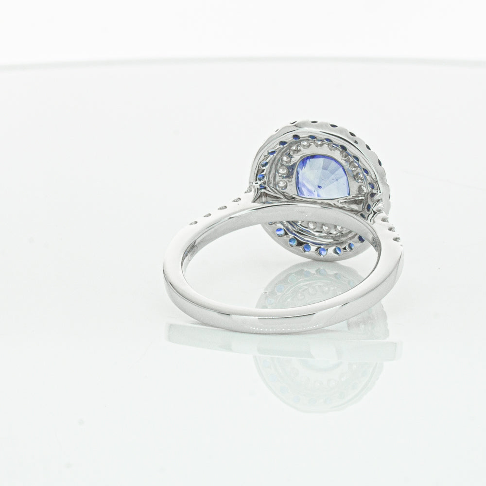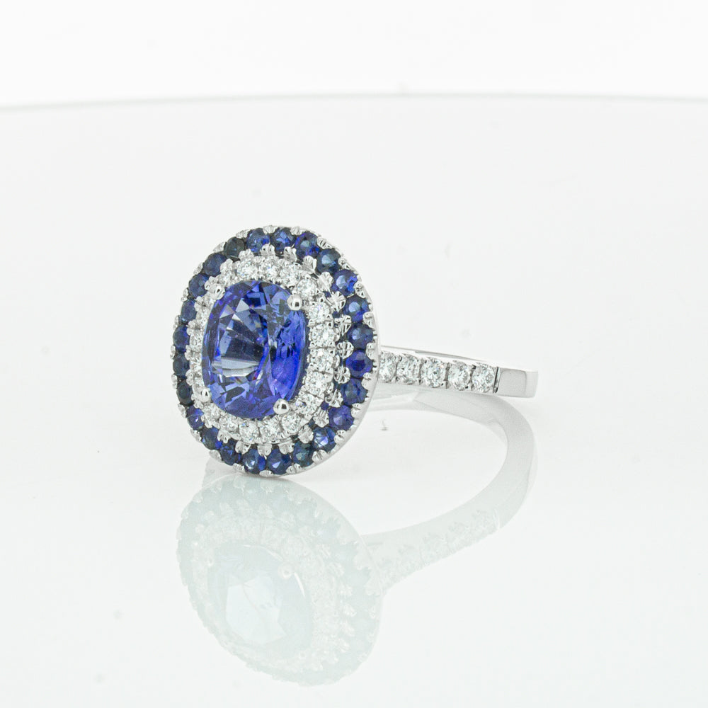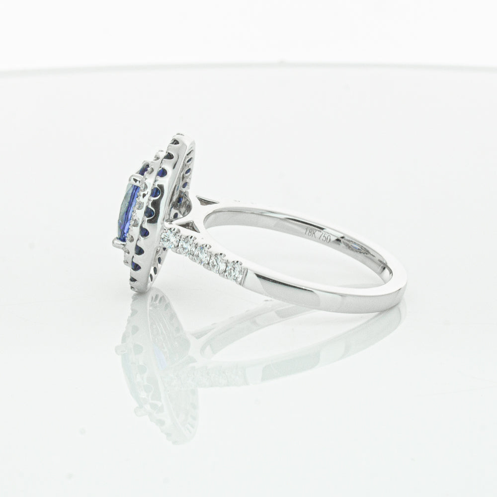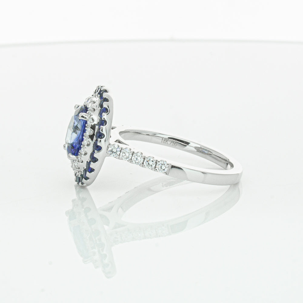 Boasting a round faceted sapphire and a double diamond and sapphire halo you will be the definition of beauty and elegance in this ring from our signature 1899 collection, beautifully set in 18ct white gold.