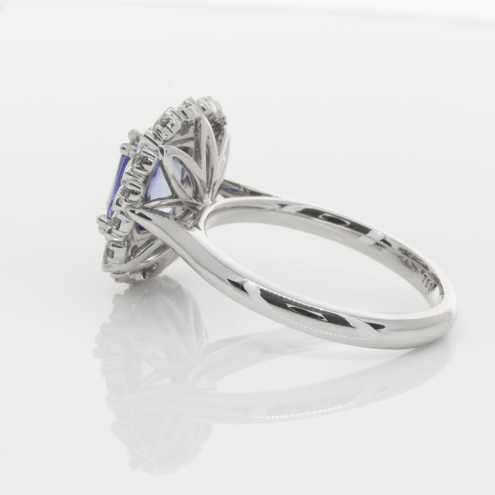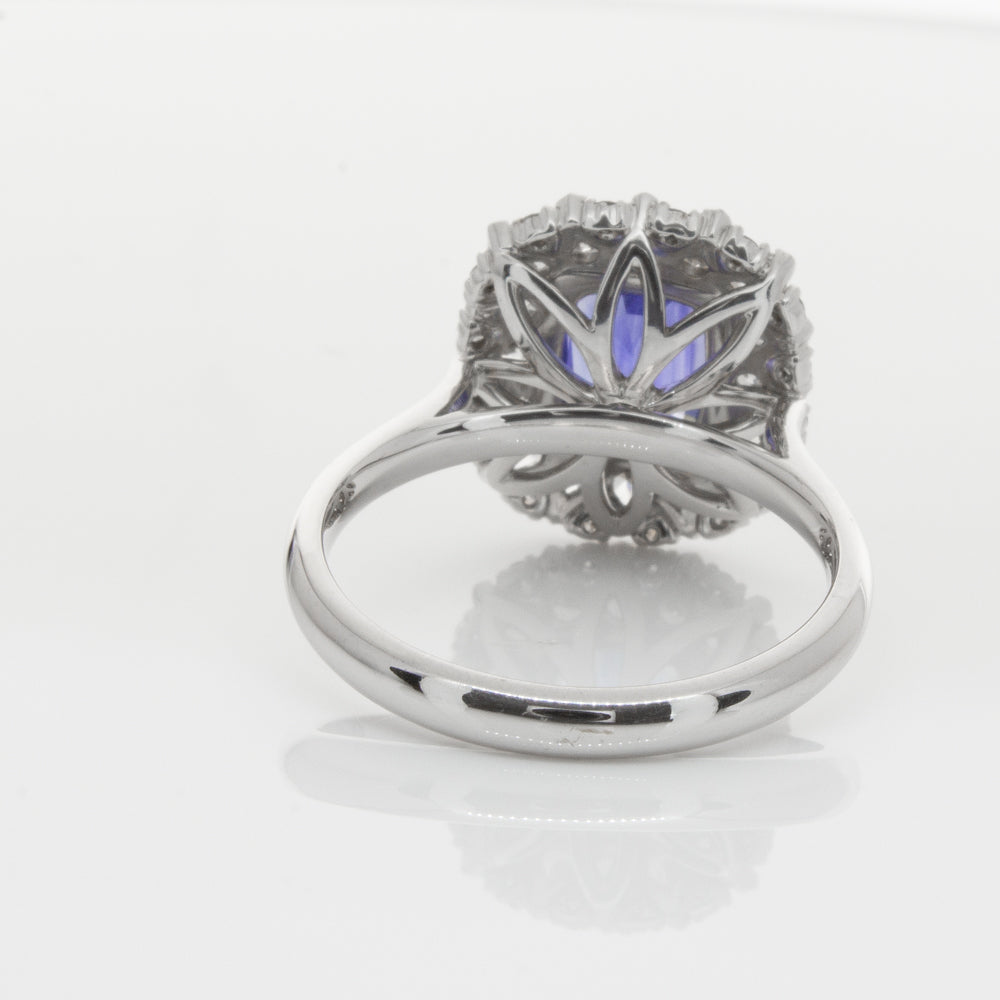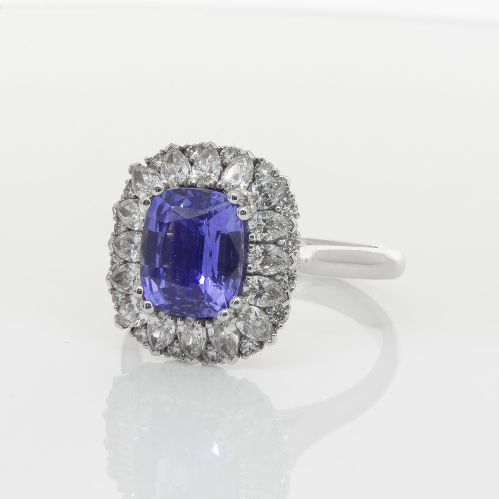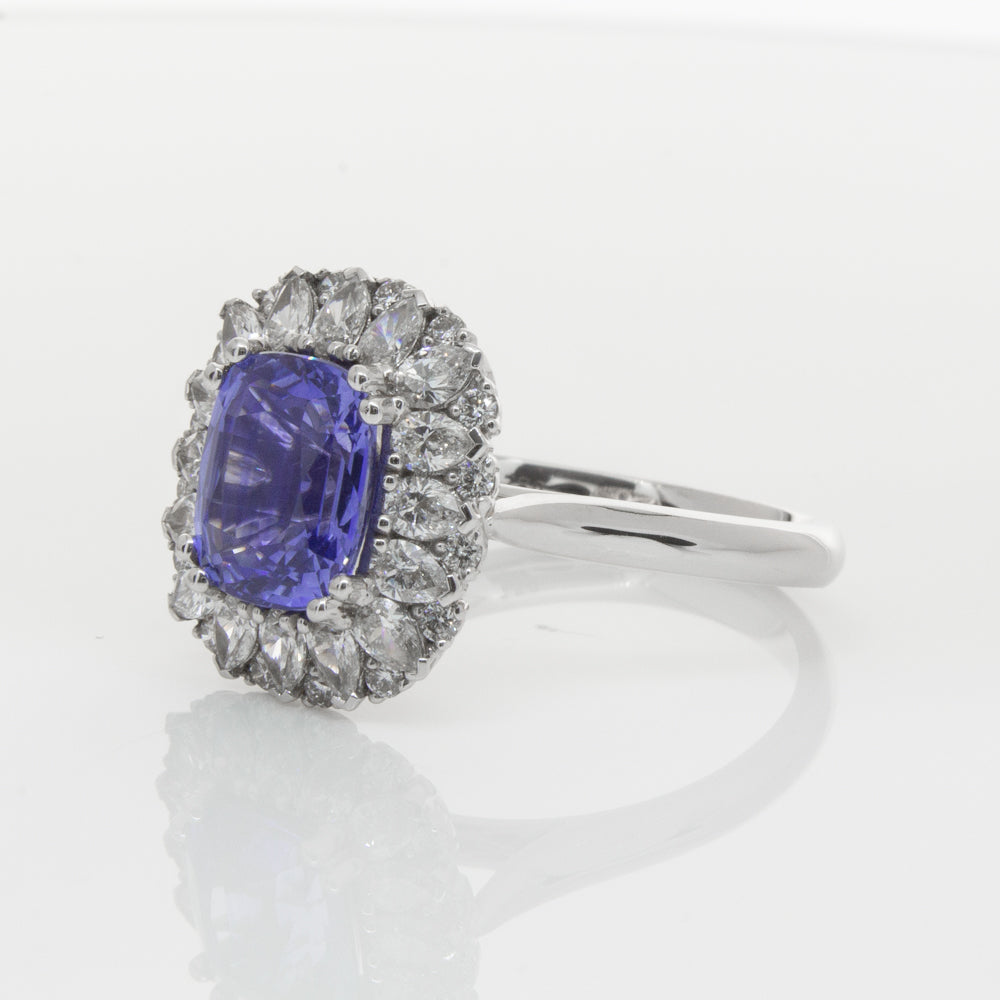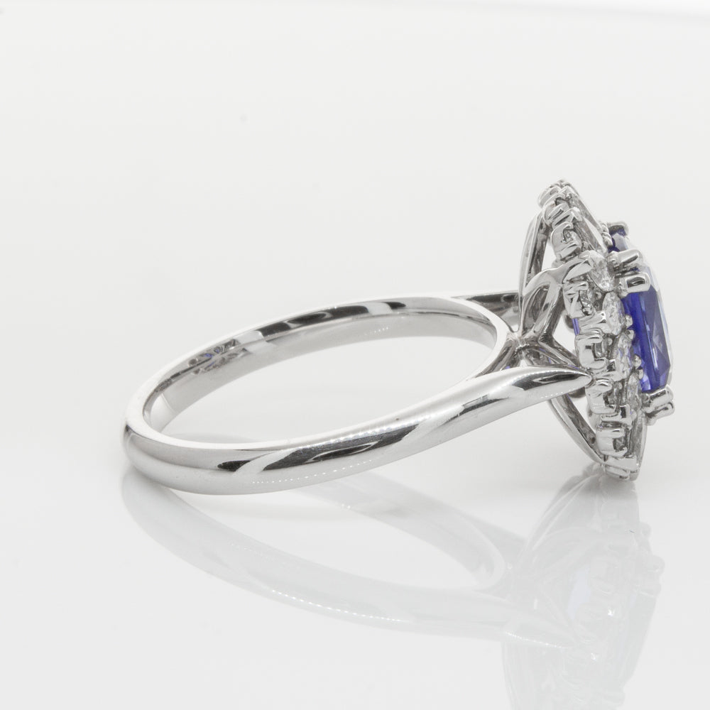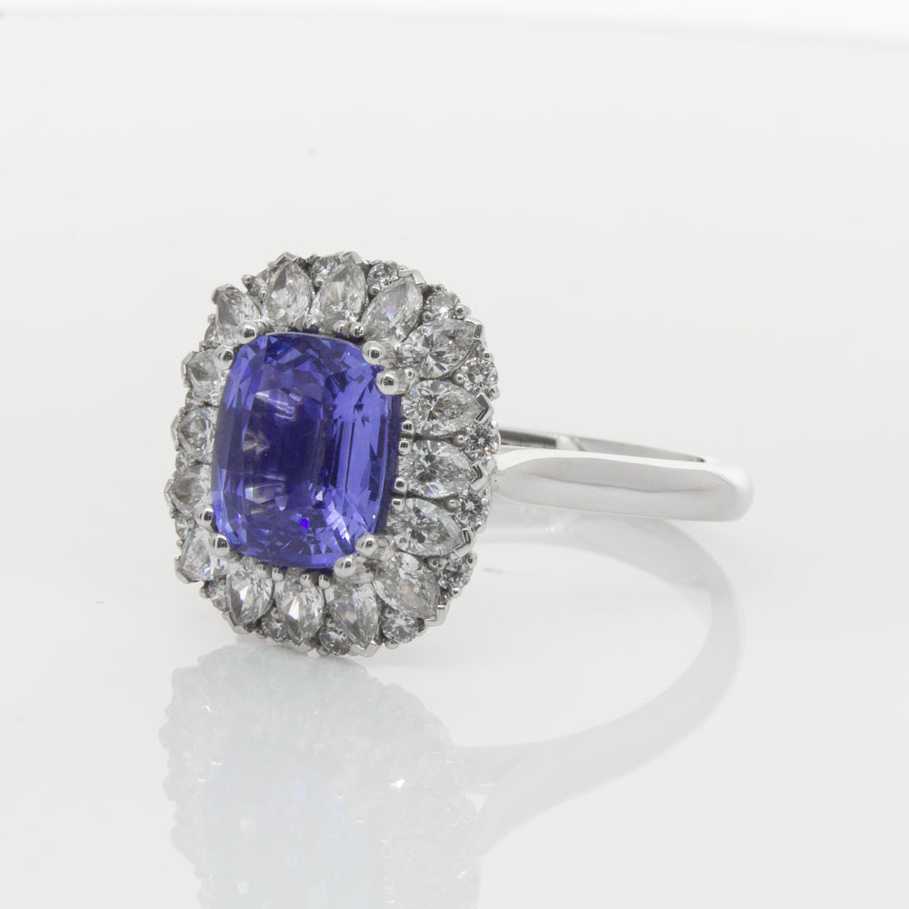 18ct white gold ring featuring one beautiful blue cushion cut sapphire framed by a halo of sixteen pear cut and sixteen round brilliant cut diamonds.