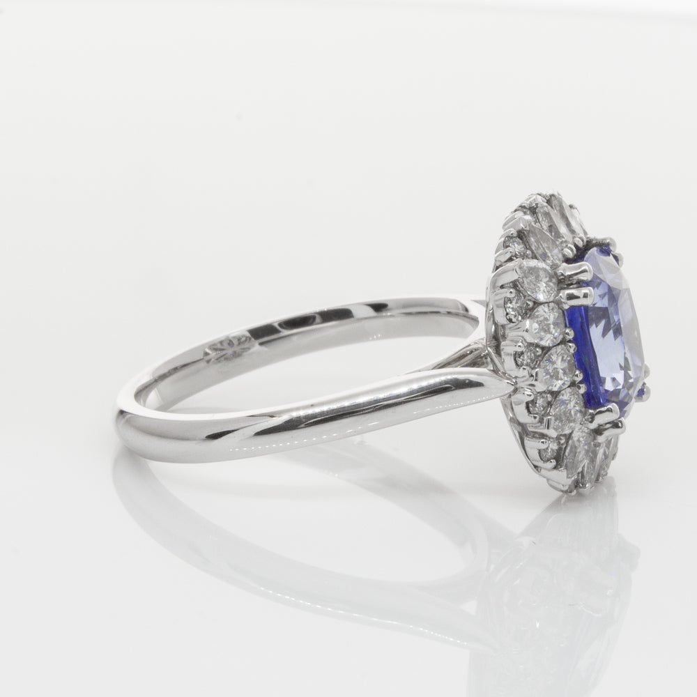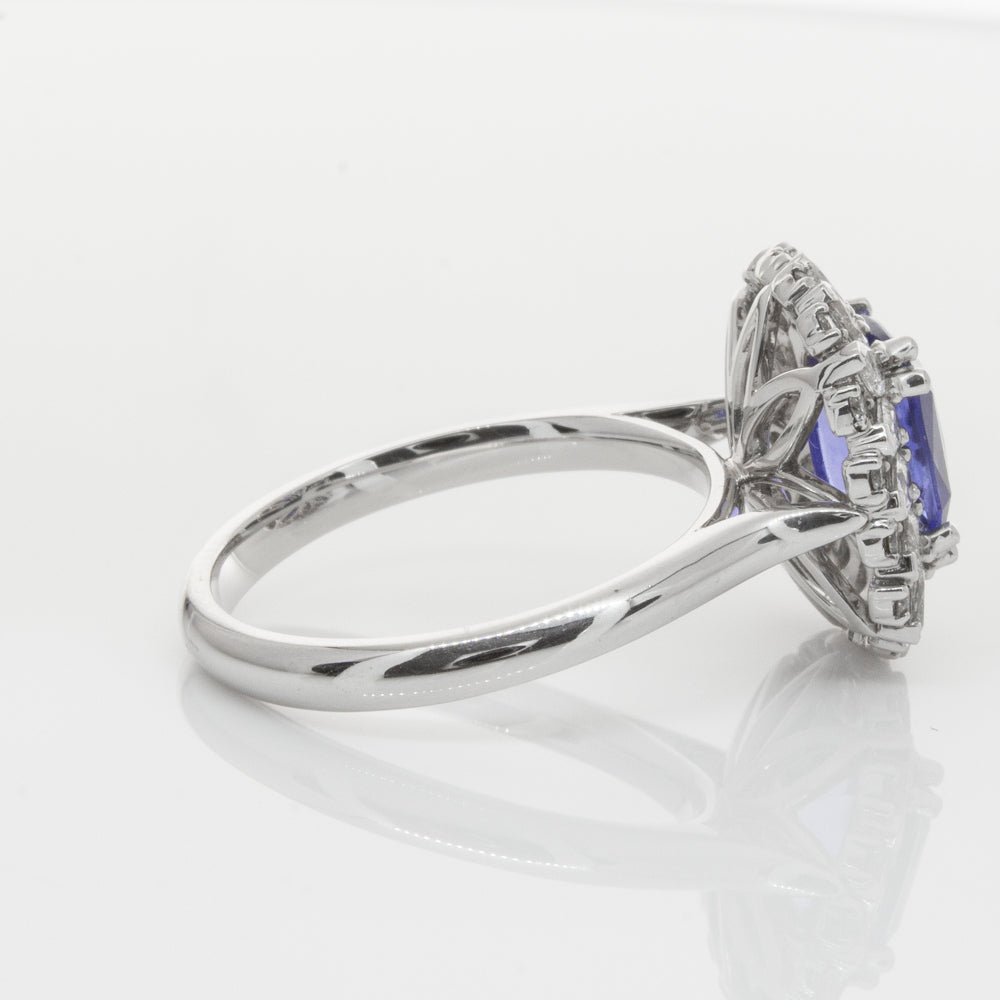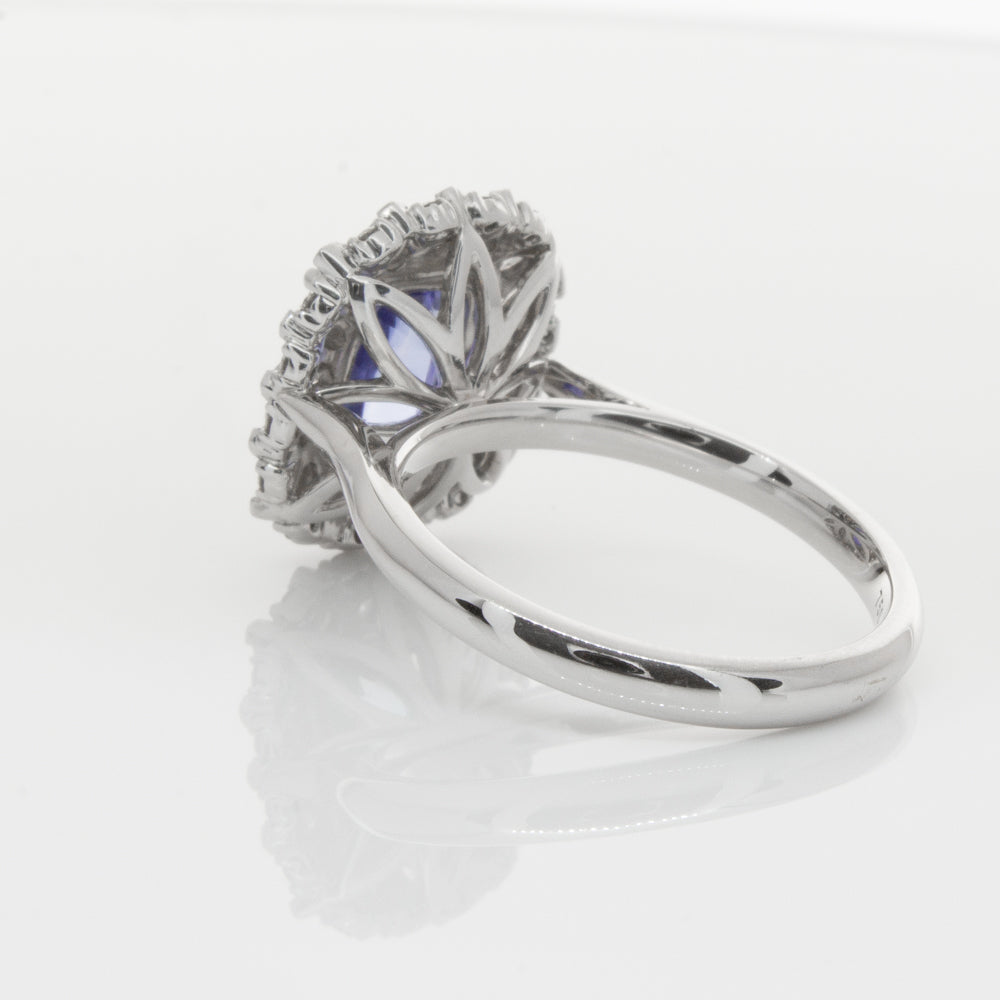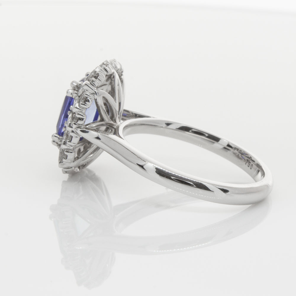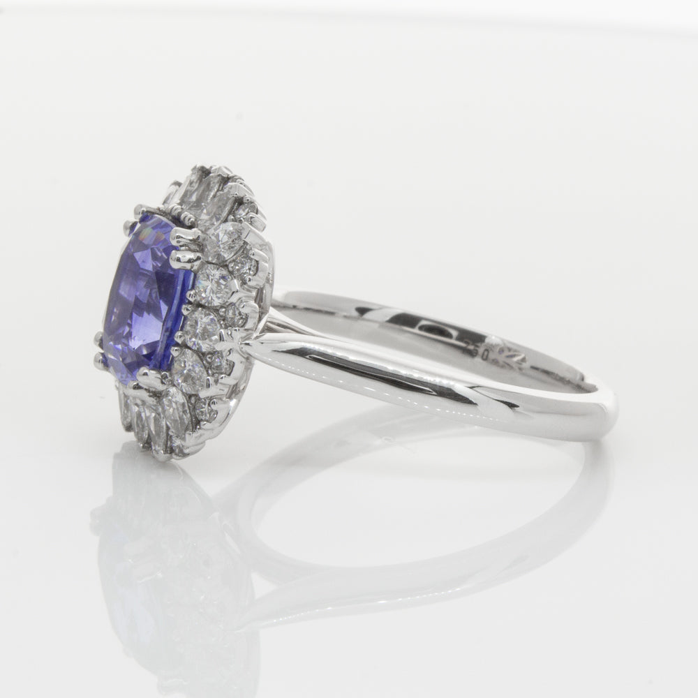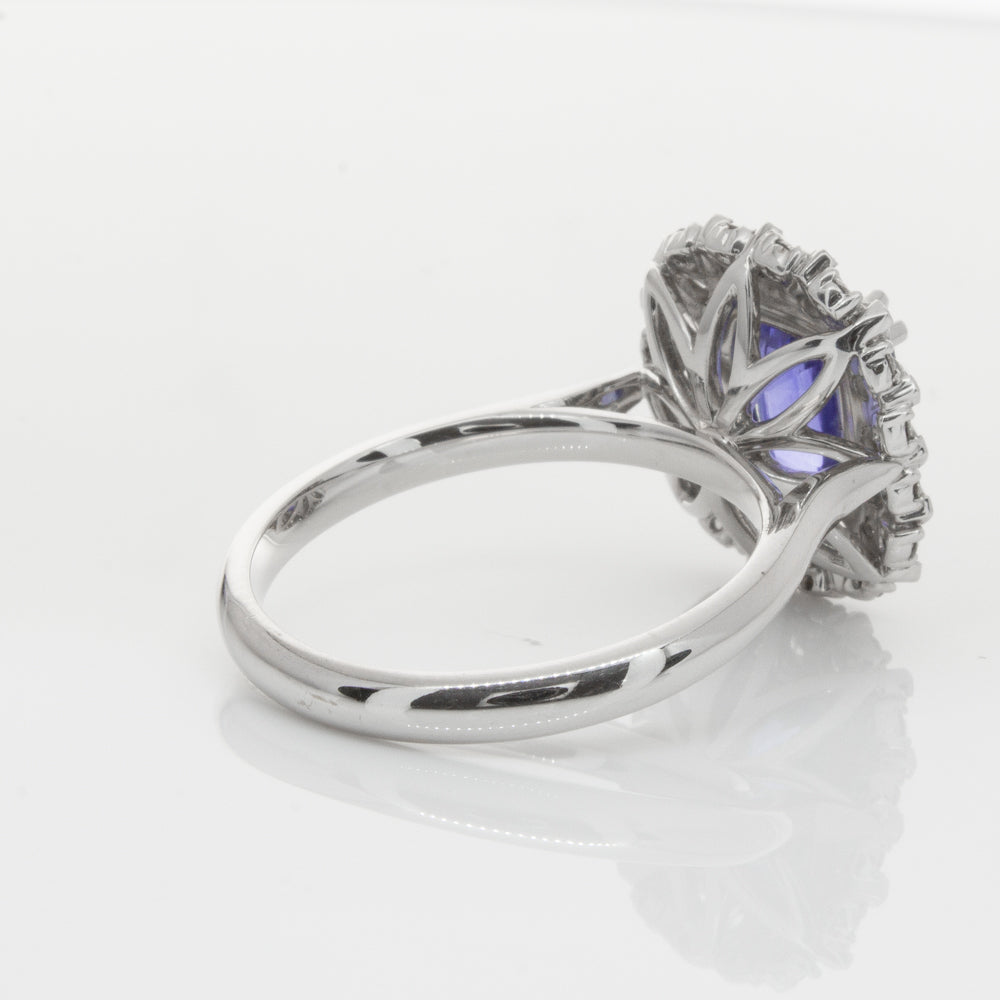 18ct white gold ring featuring one beautiful blue cushion cut sapphire framed by a halo of sixteen pear cut and sixteen round brilliant cut diamonds.