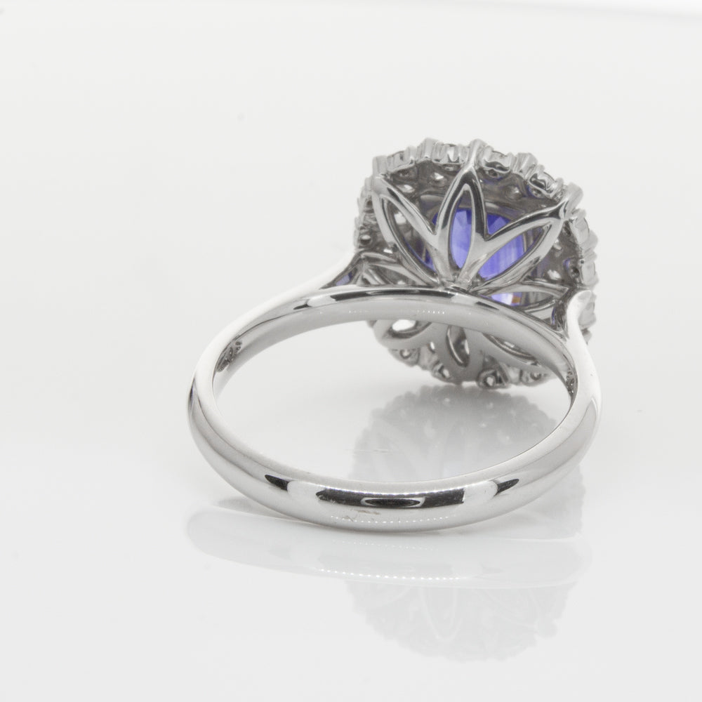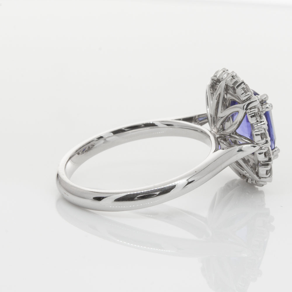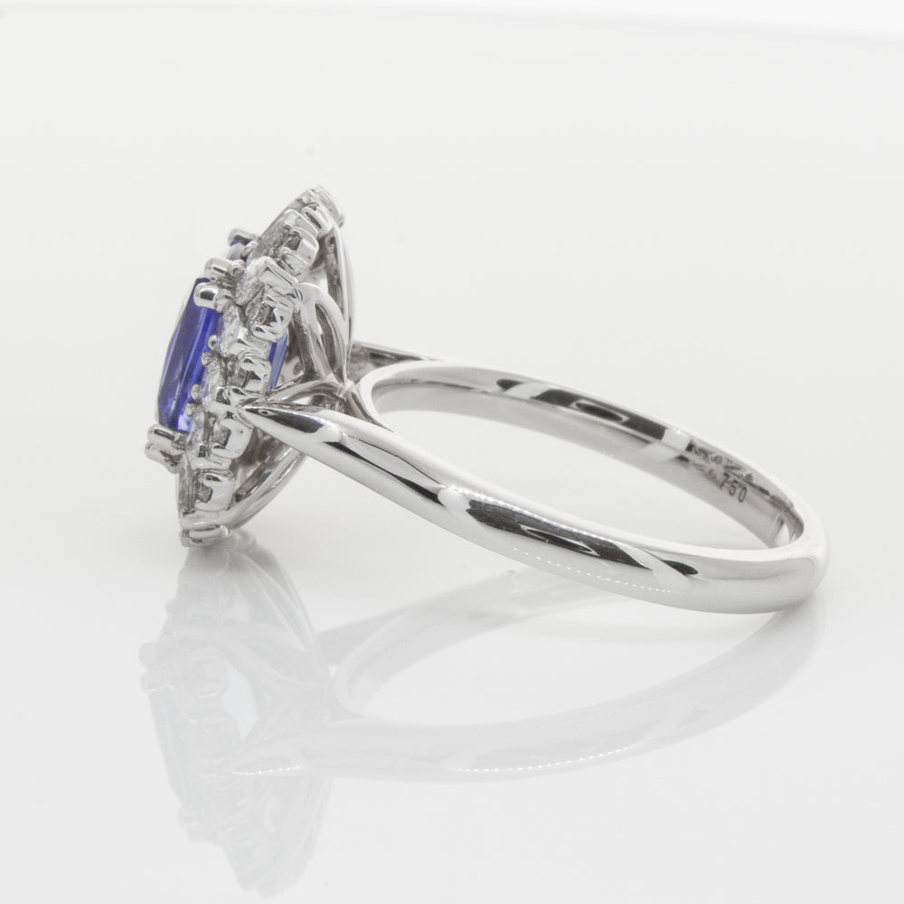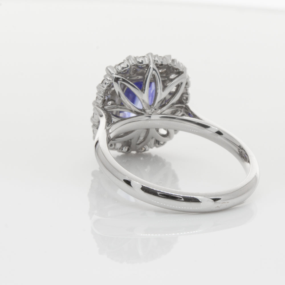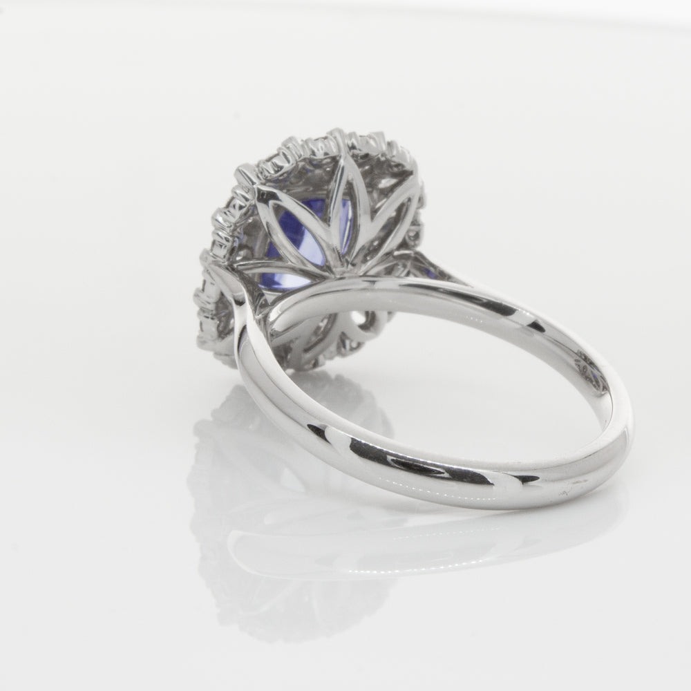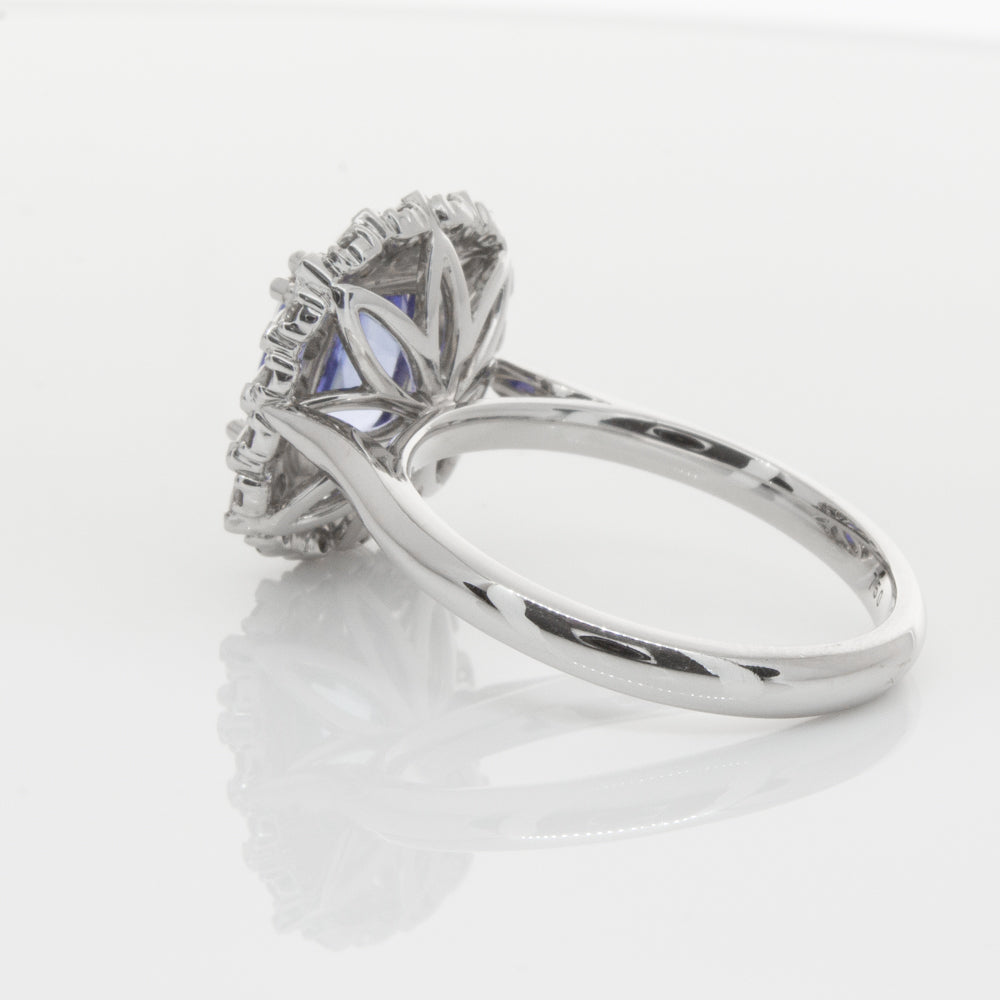 18ct white gold ring featuring one beautiful blue cushion cut sapphire framed by a halo of sixteen pear cut and sixteen round brilliant cut diamonds.