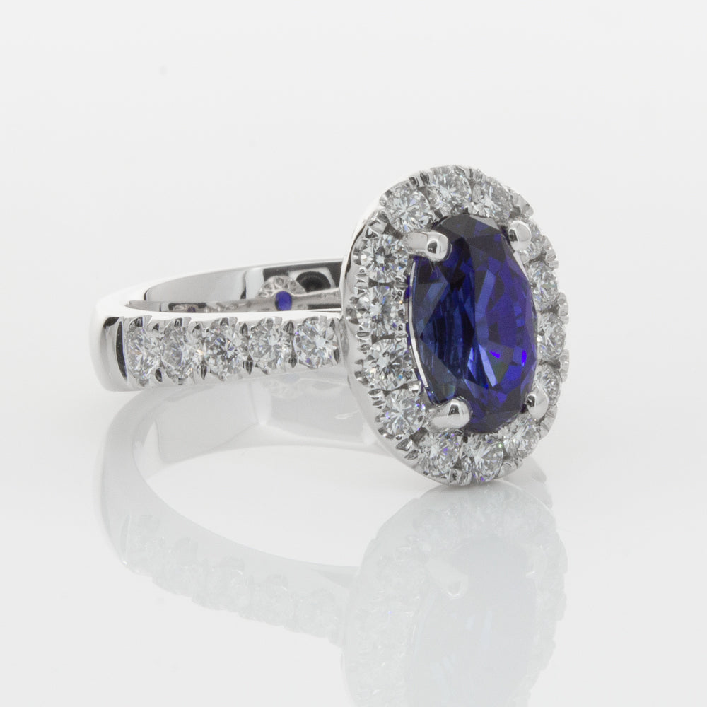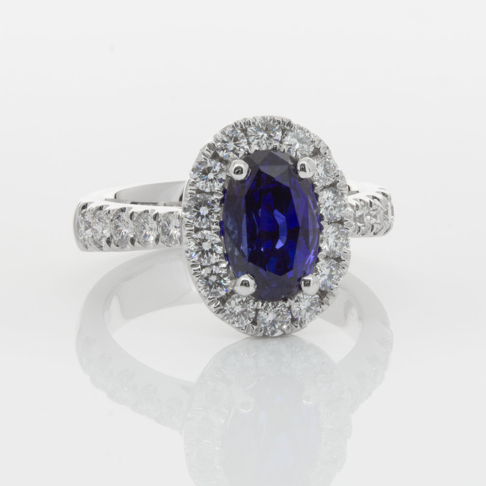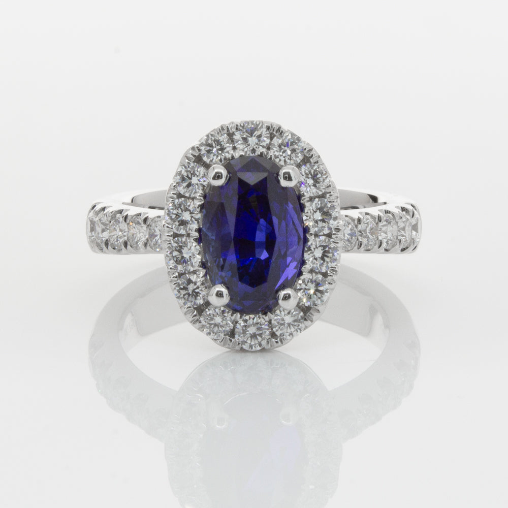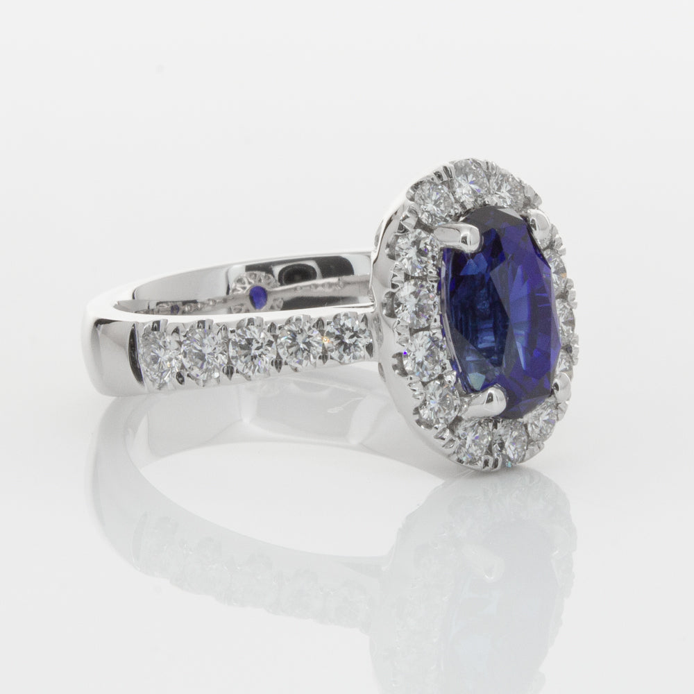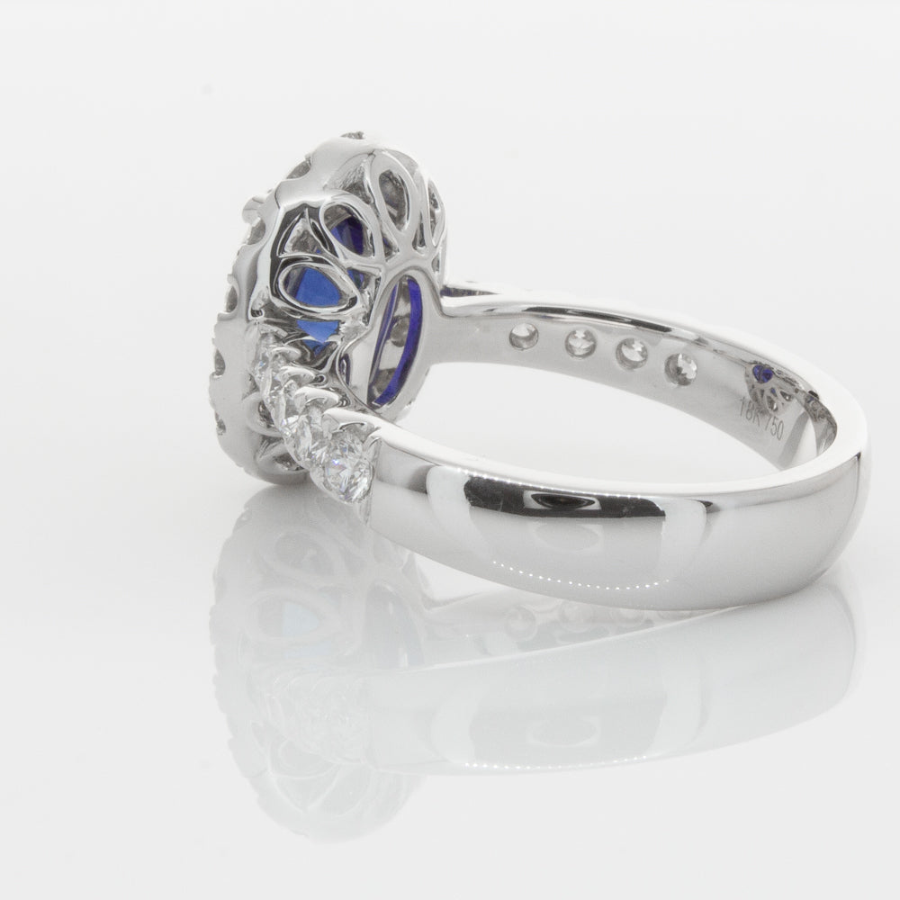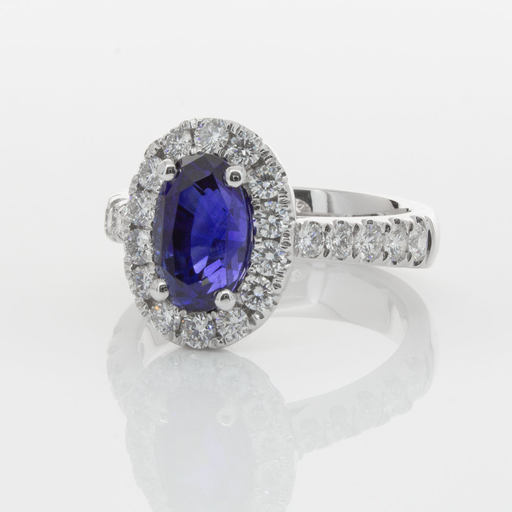 18ct white gold ring featuring one oval cut deep blue sapphire, framed by a halo of dazzling white diamonds, resting on diamond set shoulders.