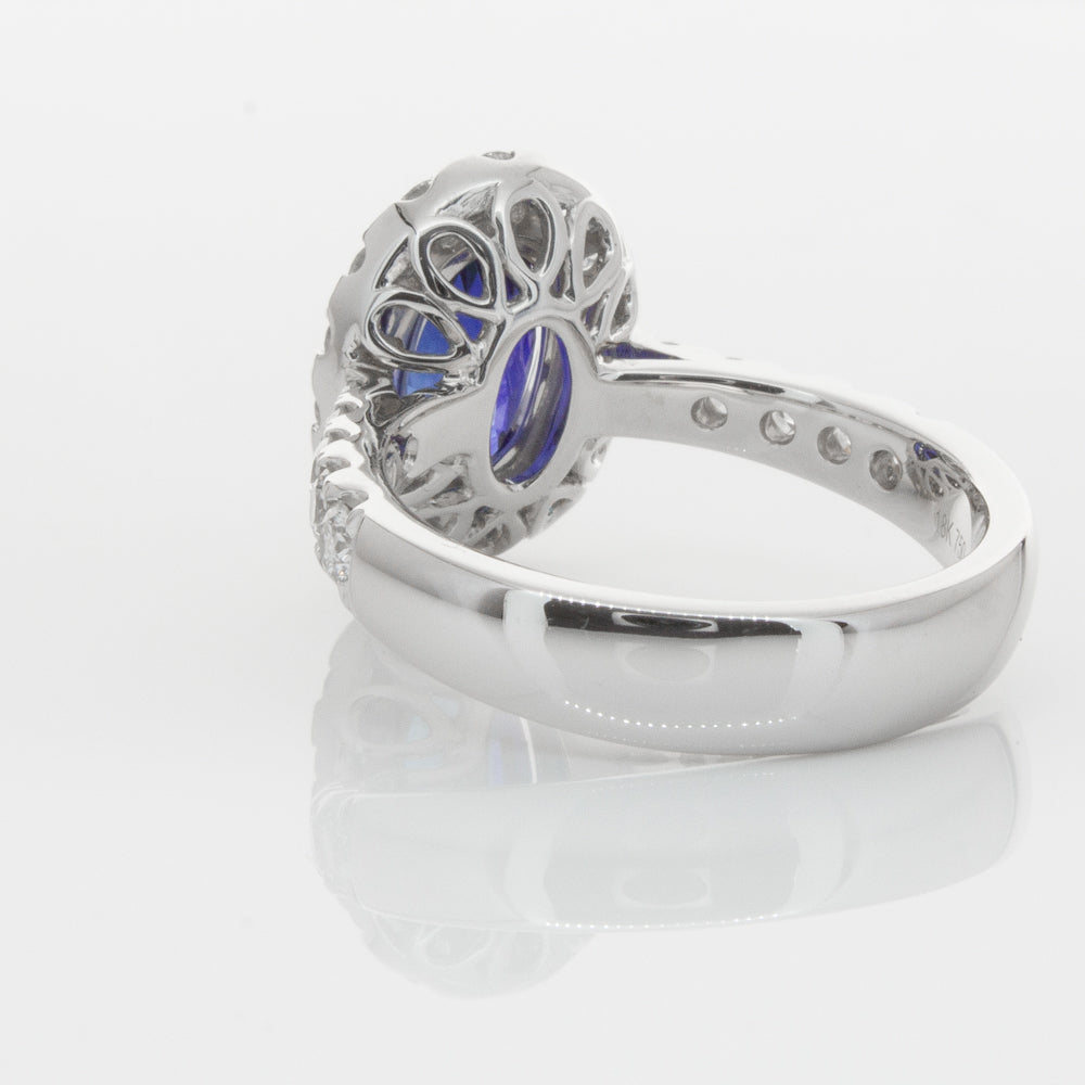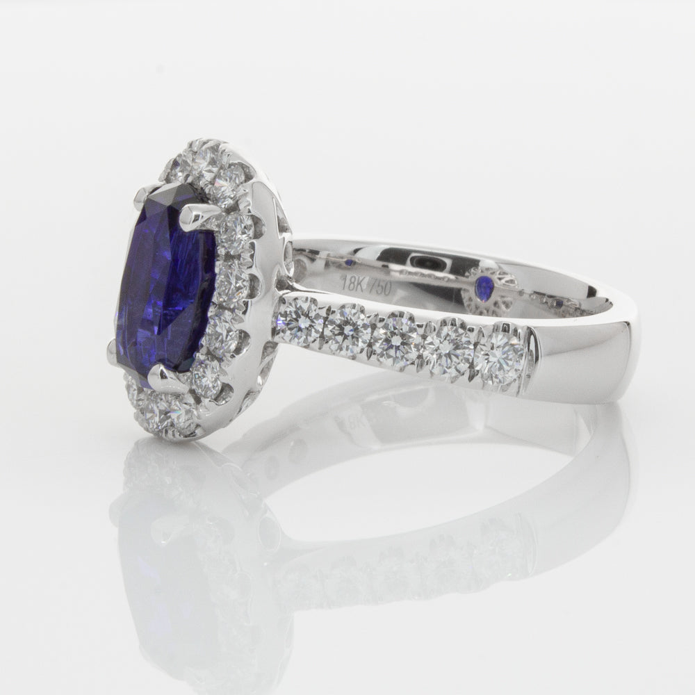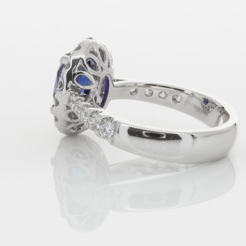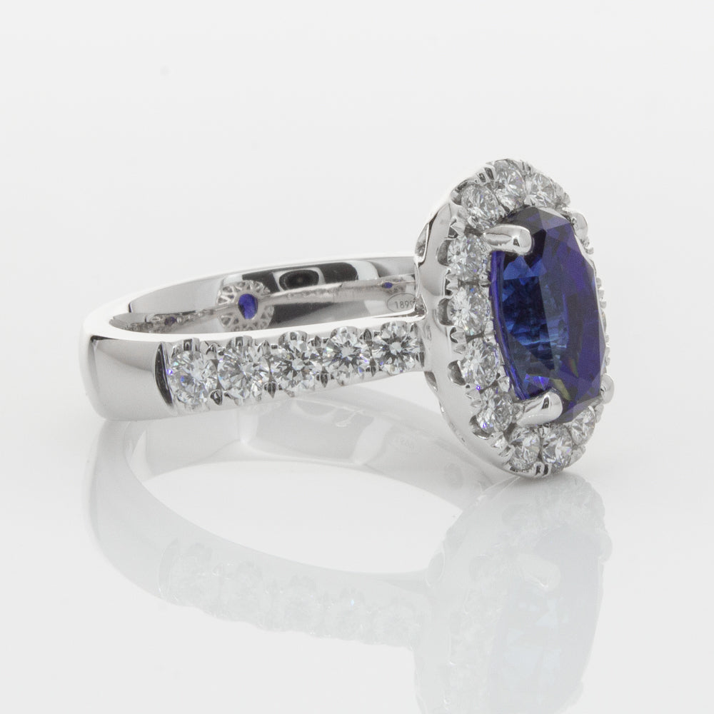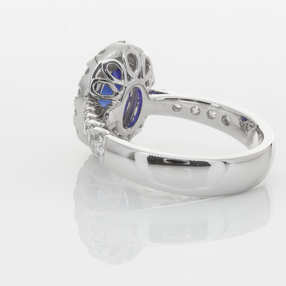 18ct white gold ring featuring one oval cut deep blue sapphire, framed by a halo of dazzling white diamonds, resting on diamond set shoulders.