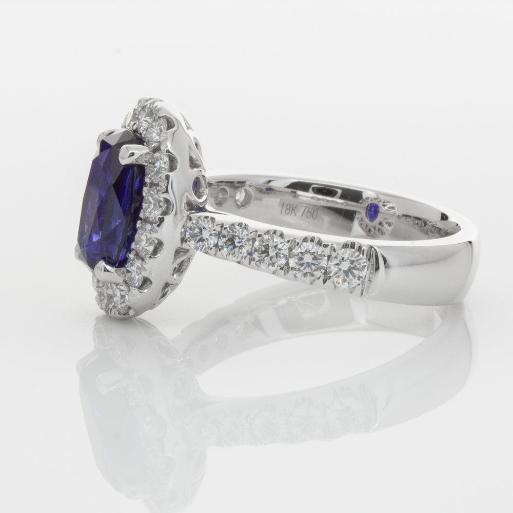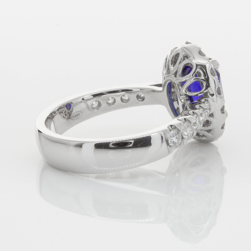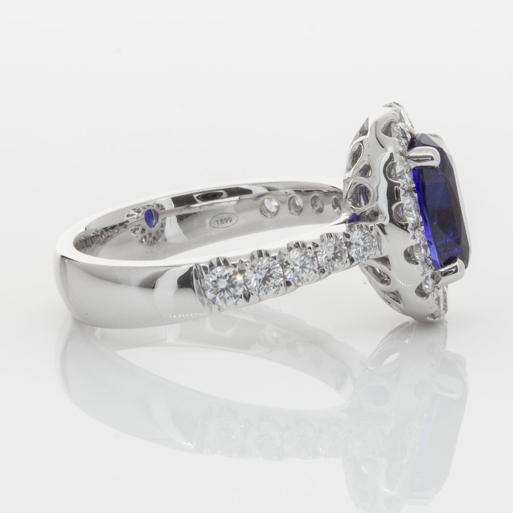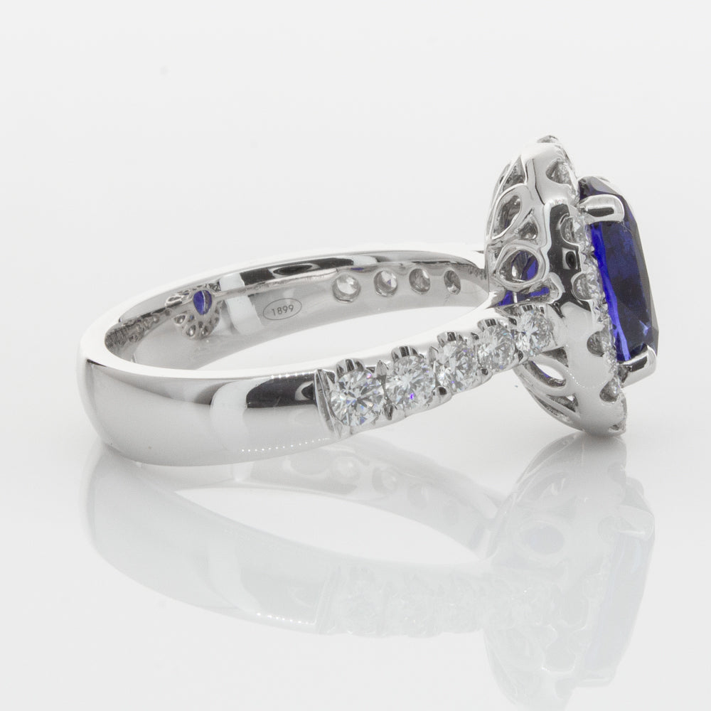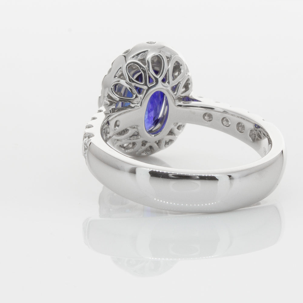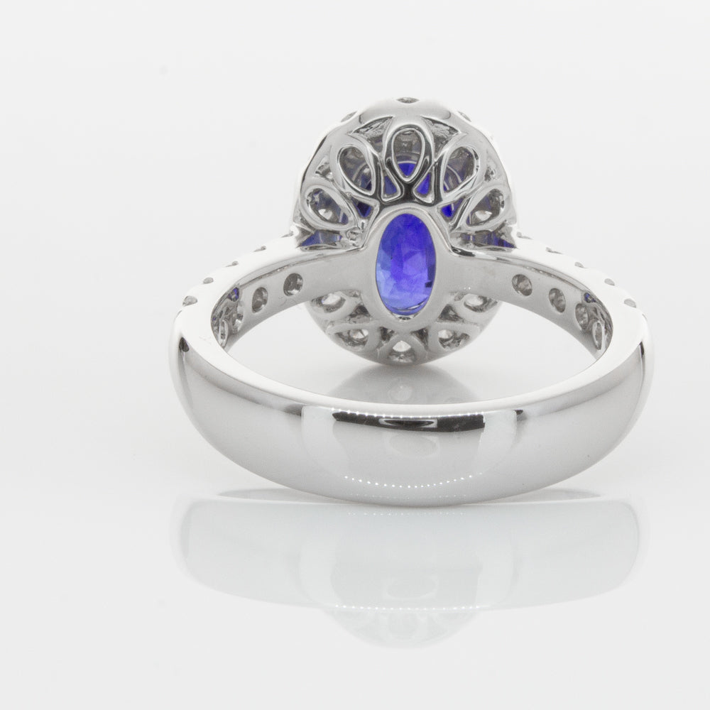 18ct white gold ring featuring one oval cut deep blue sapphire, framed by a halo of dazzling white diamonds, resting on diamond set shoulders.