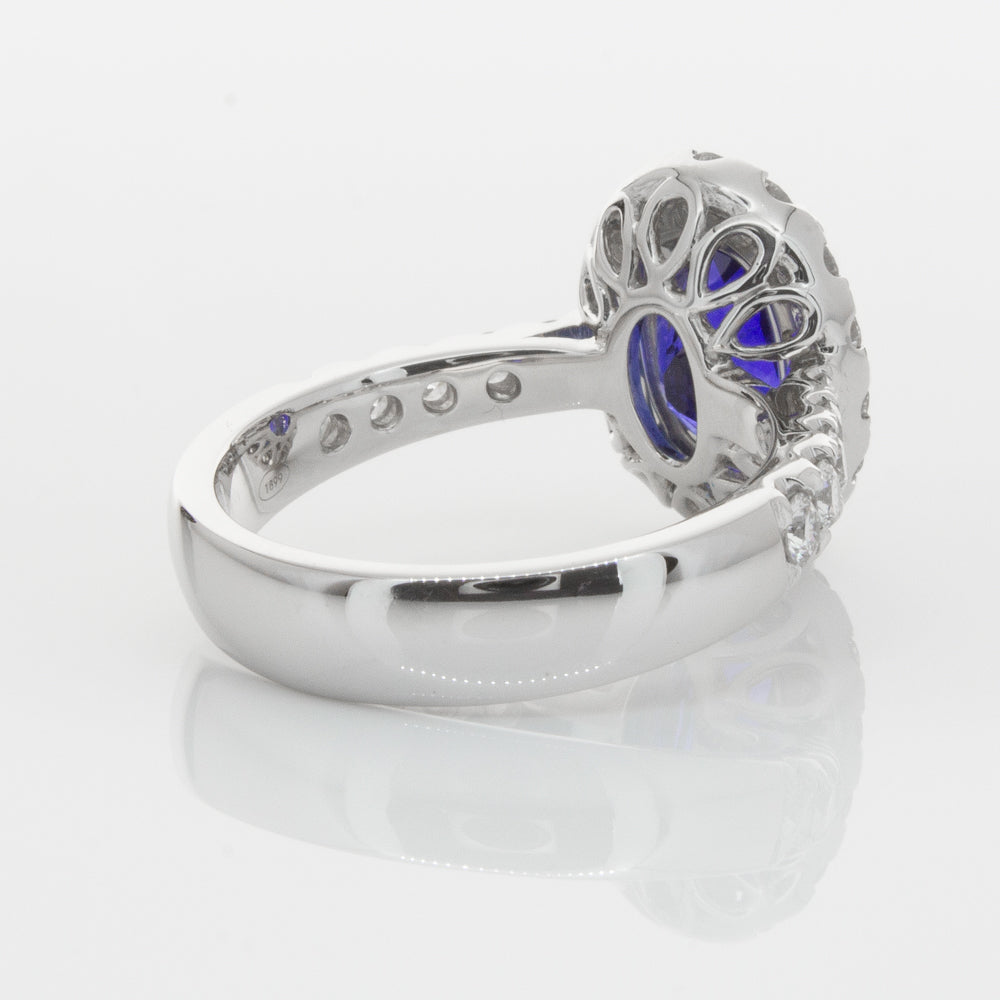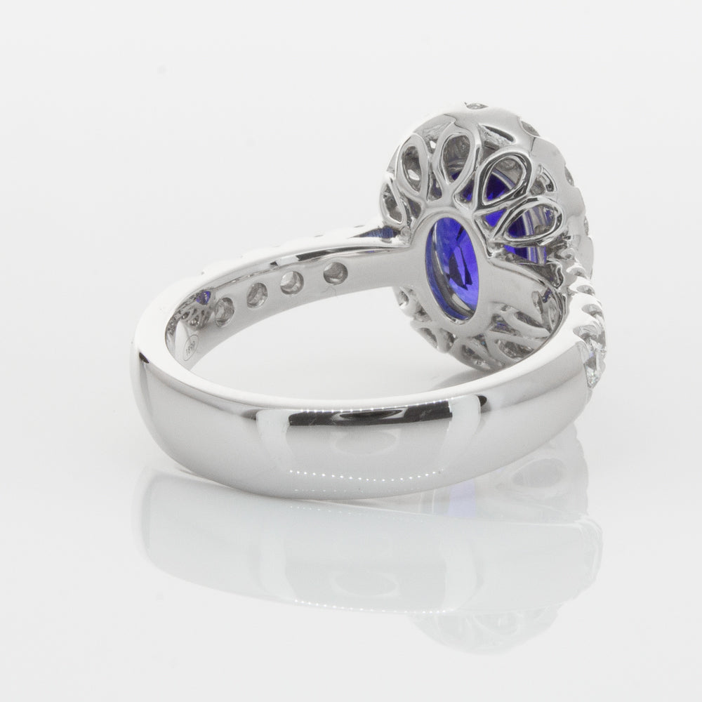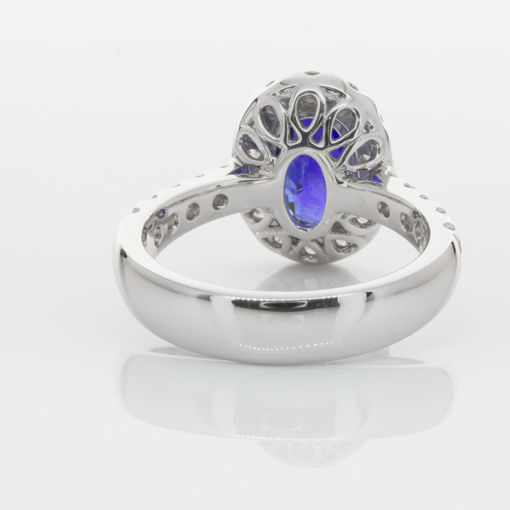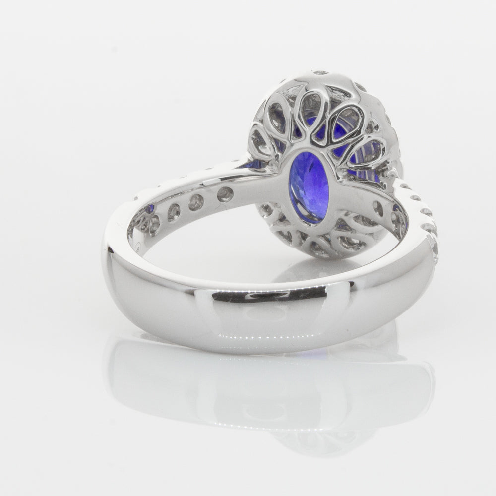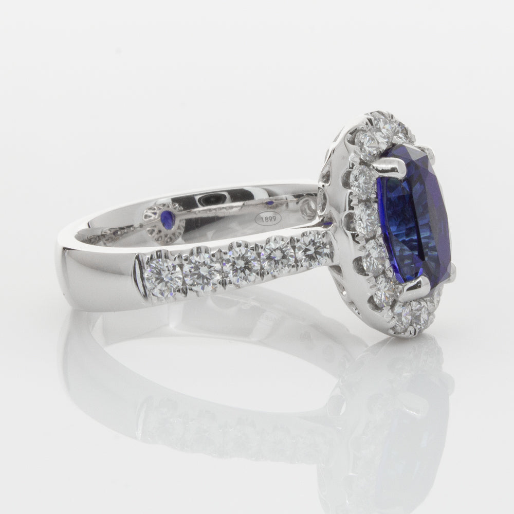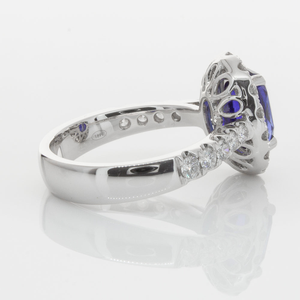 18ct white gold ring featuring one oval cut deep blue sapphire, framed by a halo of dazzling white diamonds, resting on diamond set shoulders.