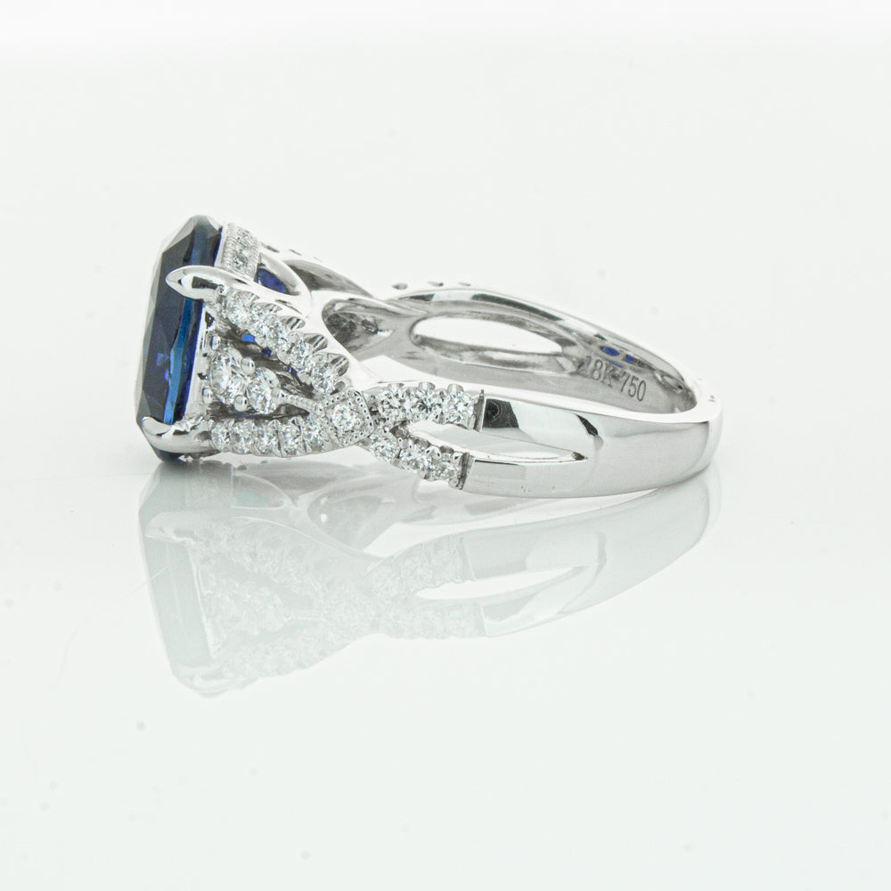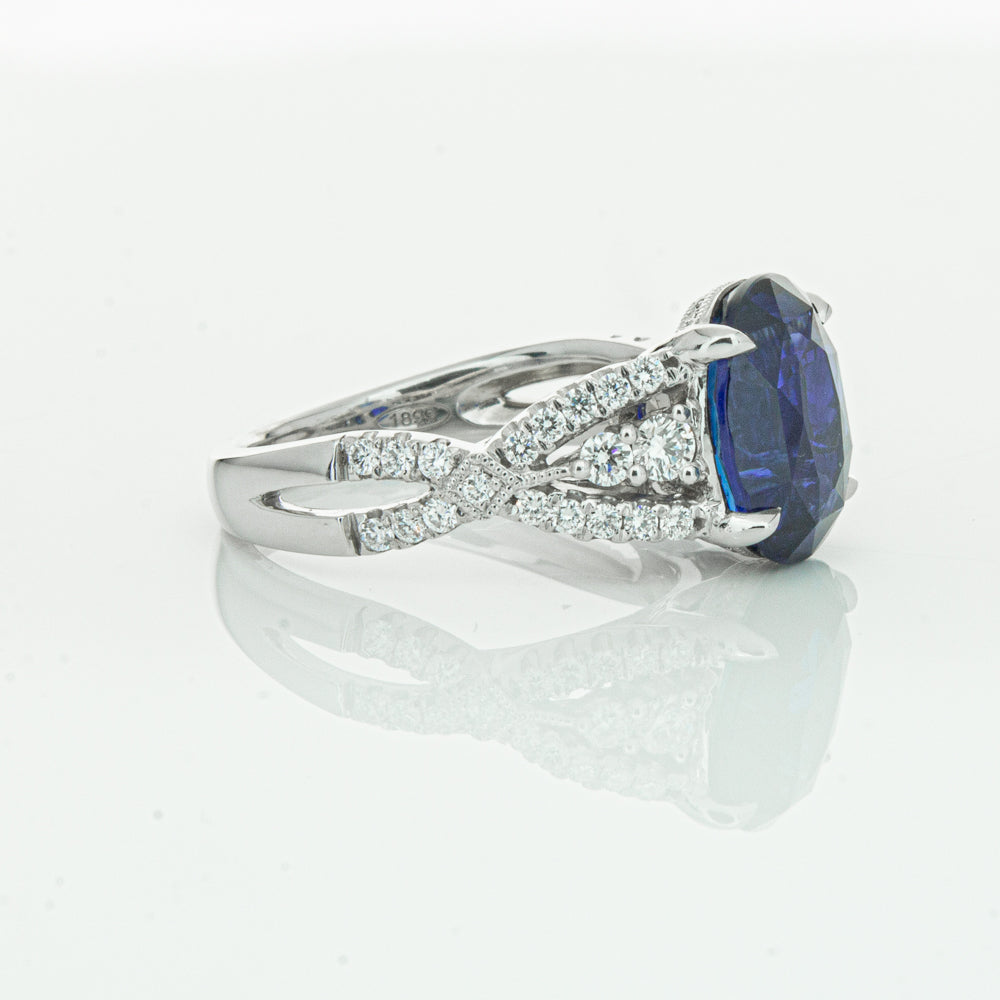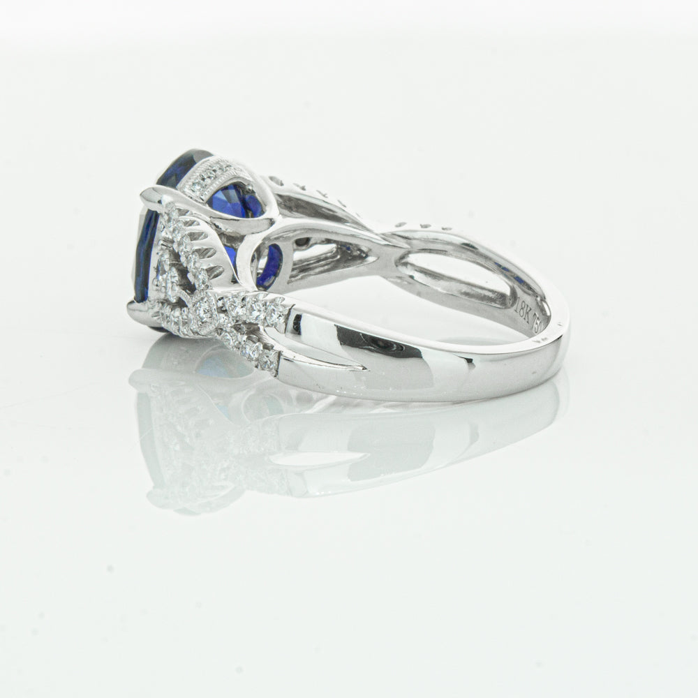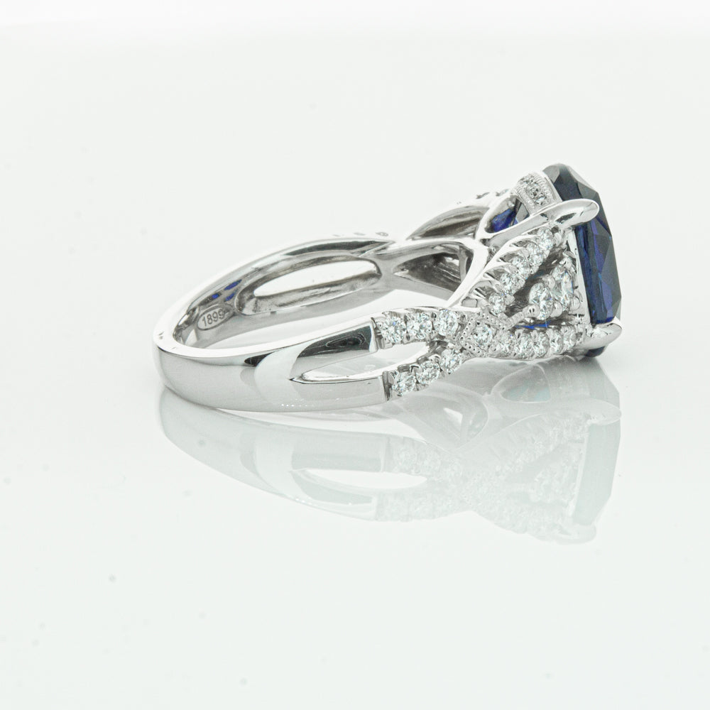 A timeless classic, you will cherish this elegant sapphire and diamond ring. This piece boasts a strong blue sapphire with diamond accents on openwork shoulders and is carefully set in 18ct white gold from our signature 1899 collection.
