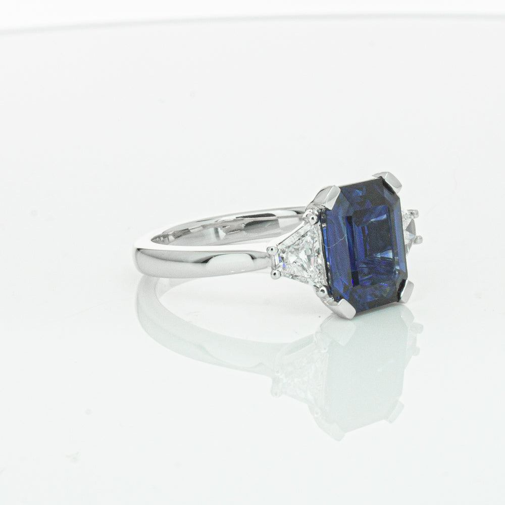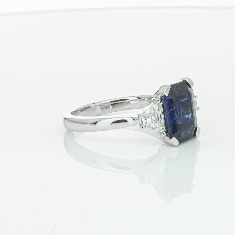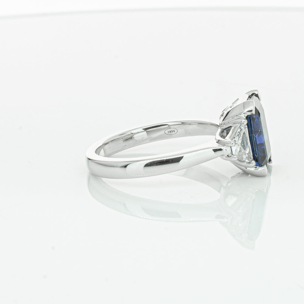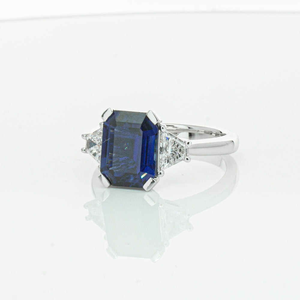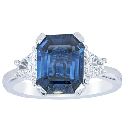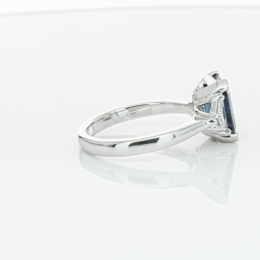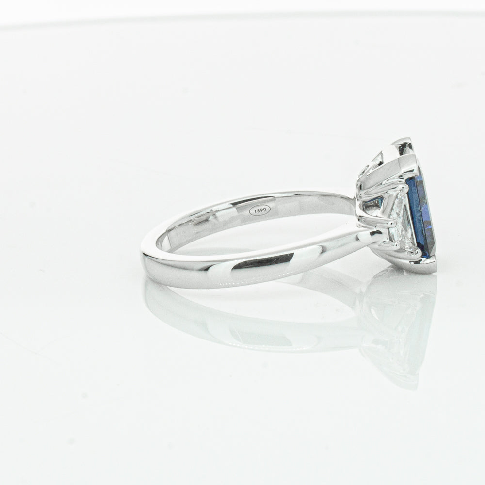 Distinctly glamorous, this sapphire and diamond ring from our signature 1899 collection showcases a deep blue, step cut sapphire with two tapering trapeze-cut diamond side stones. It has a further diamond set on each side of the base.