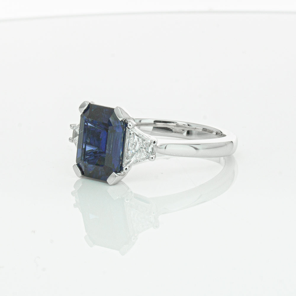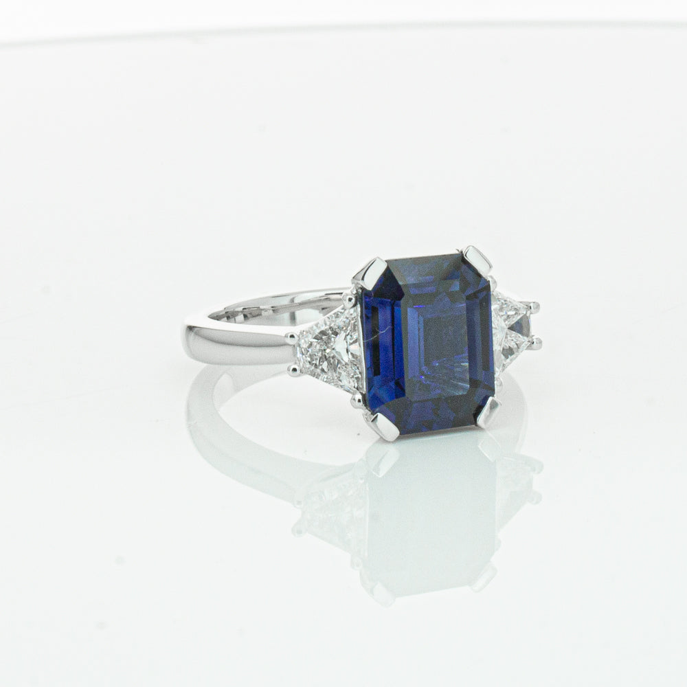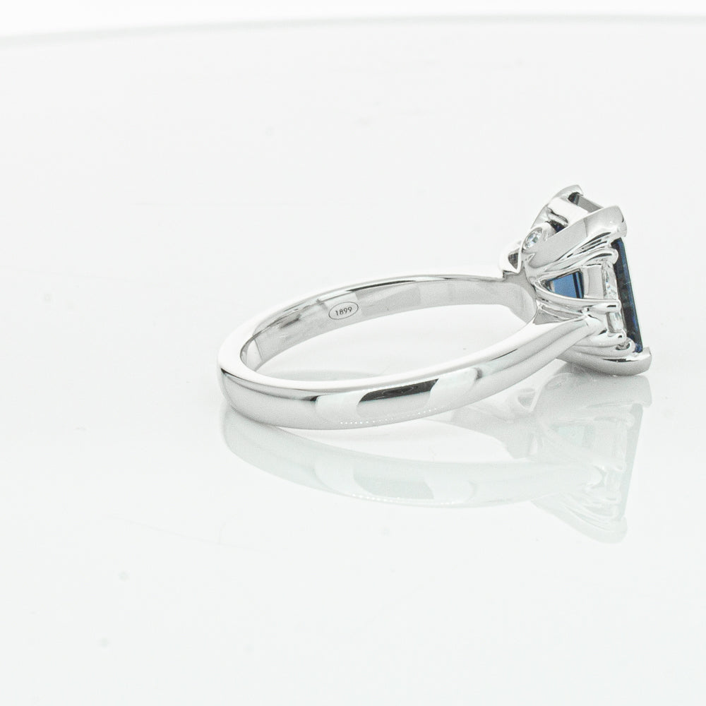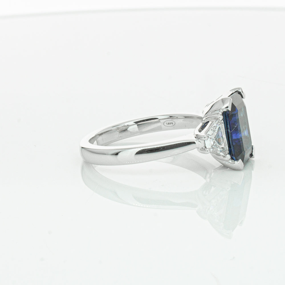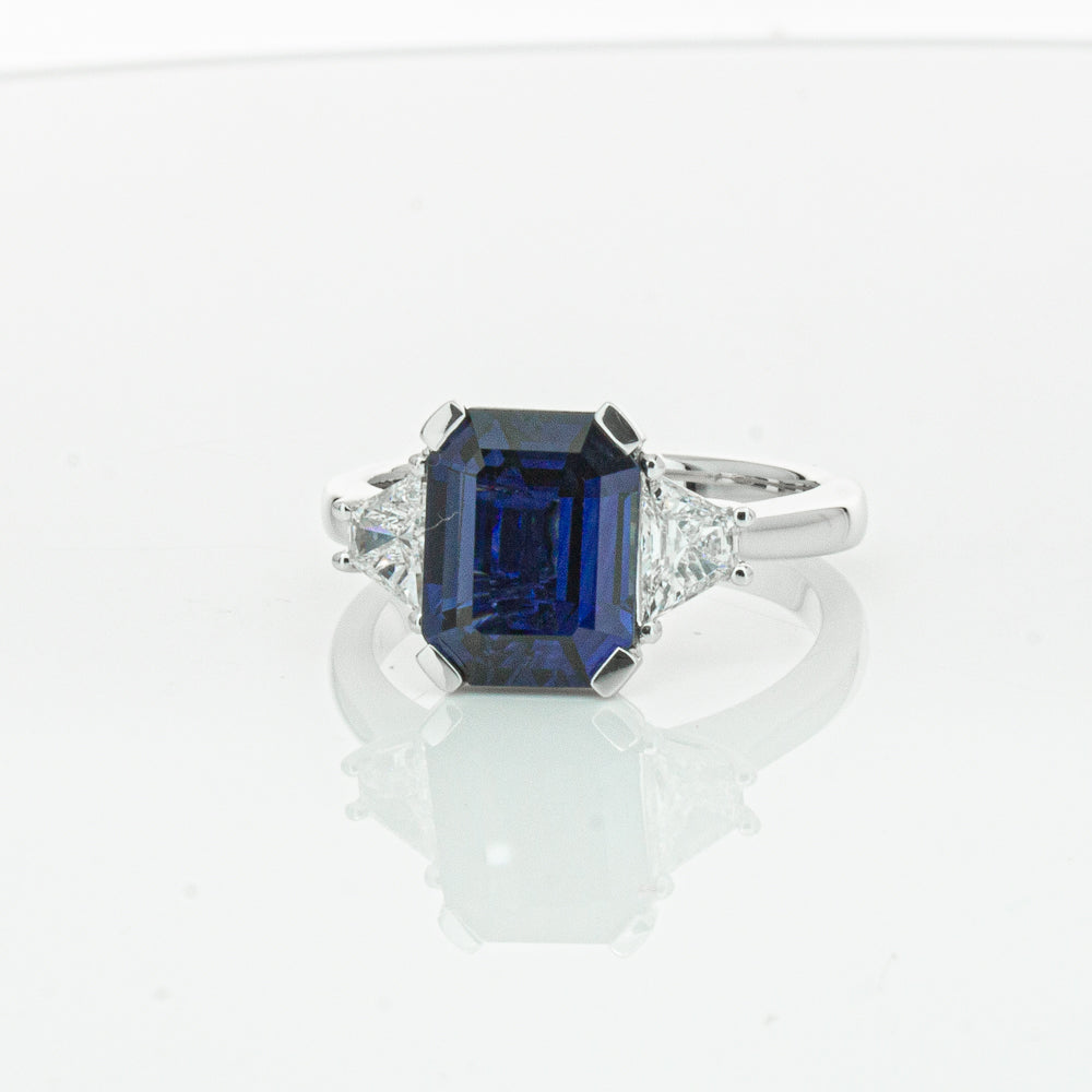 Distinctly glamorous, this sapphire and diamond ring from our signature 1899 collection showcases a deep blue, step cut sapphire with two tapering trapeze-cut diamond side stones. It has a further diamond set on each side of the base.