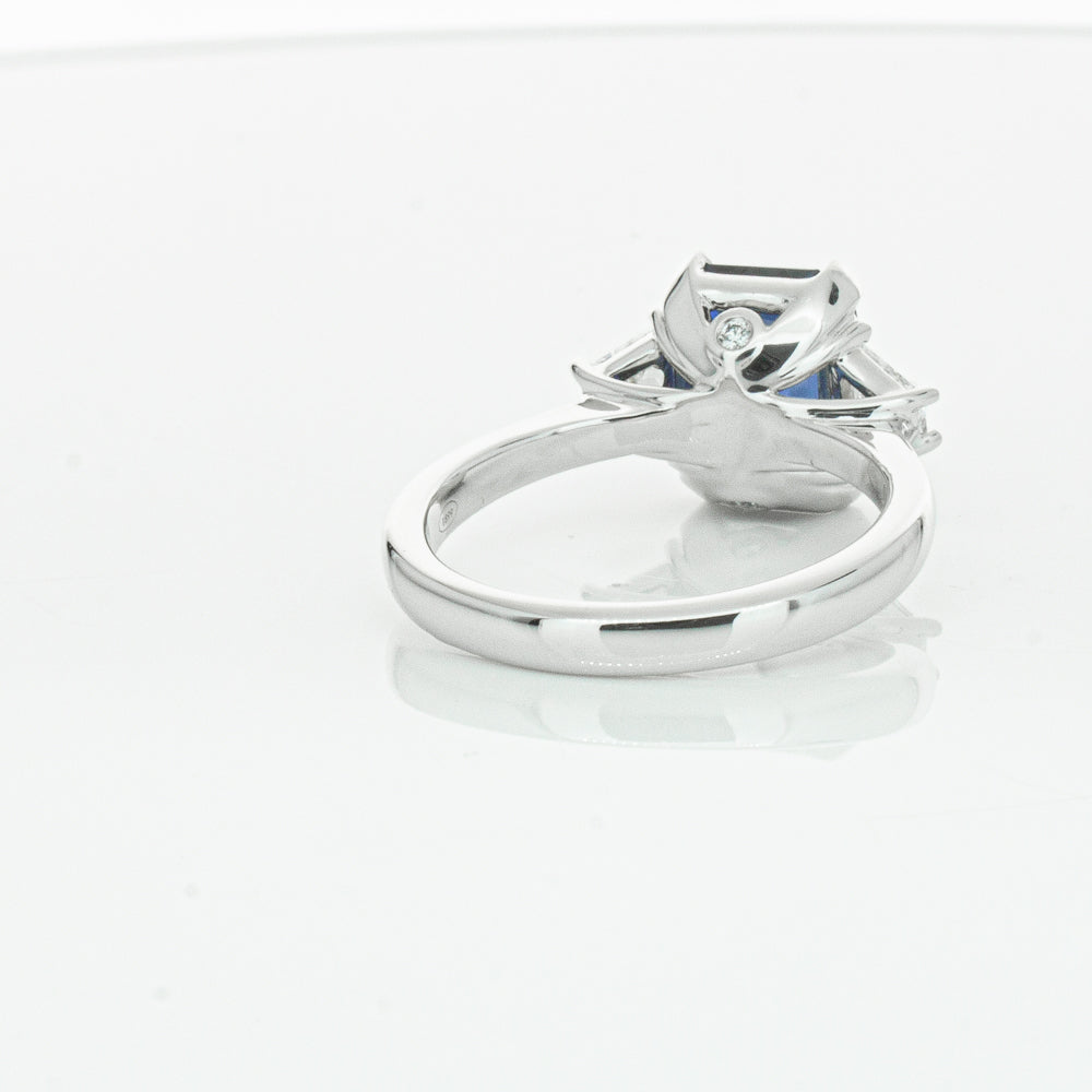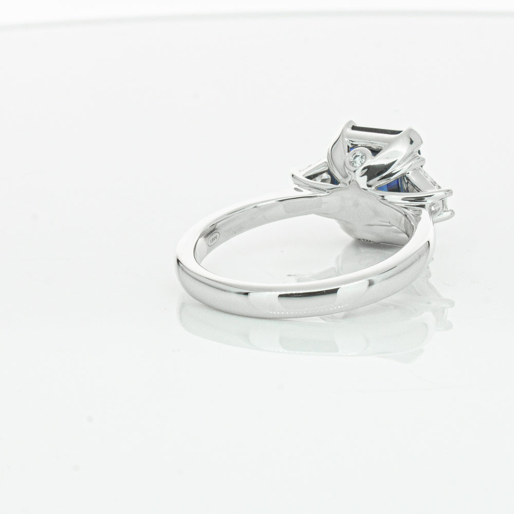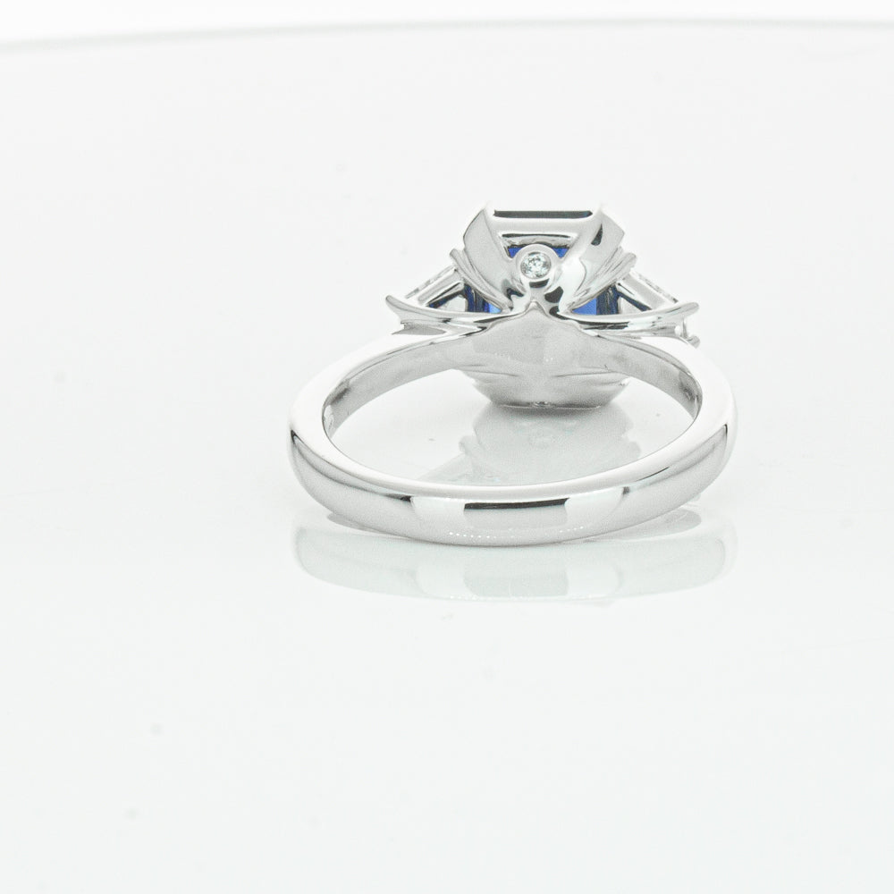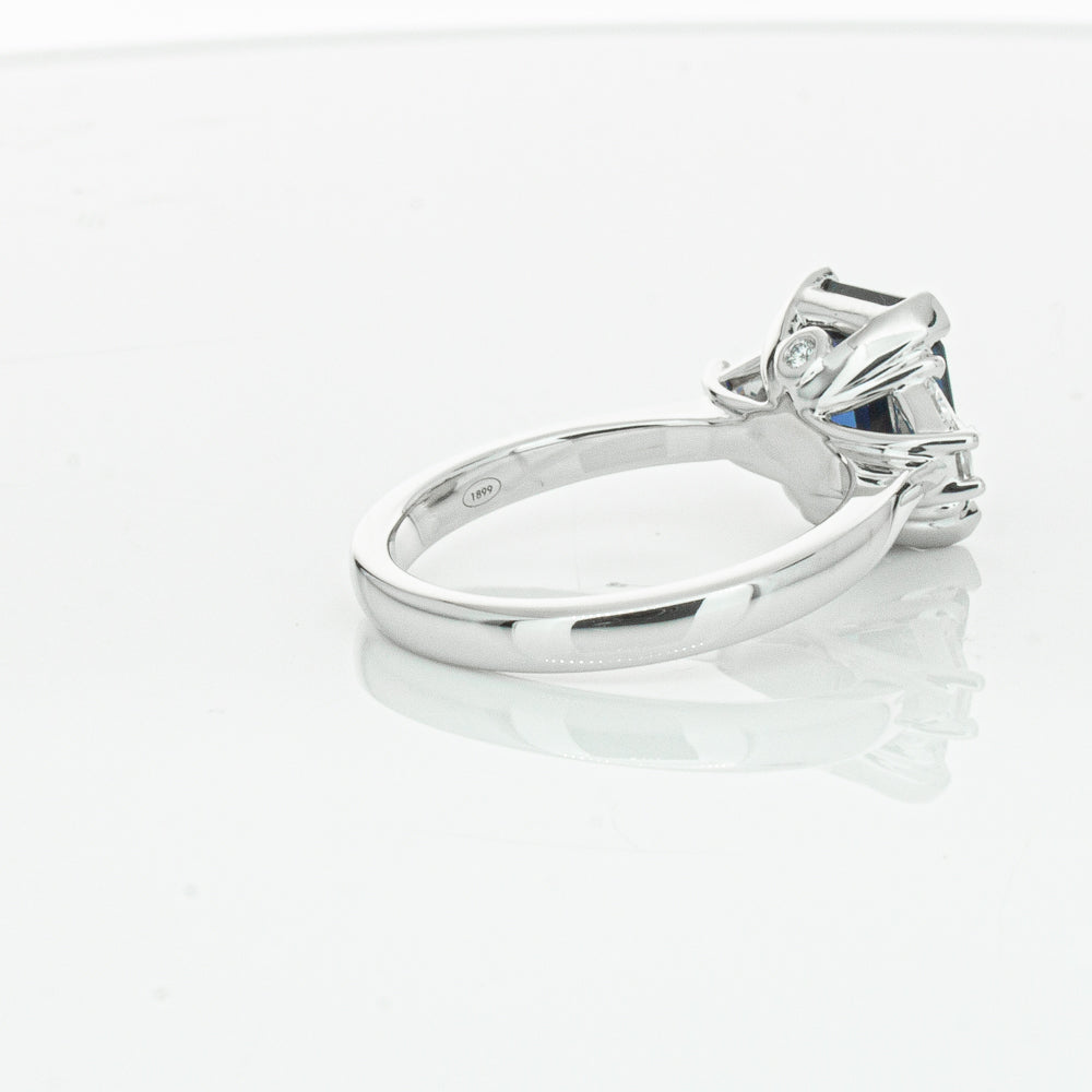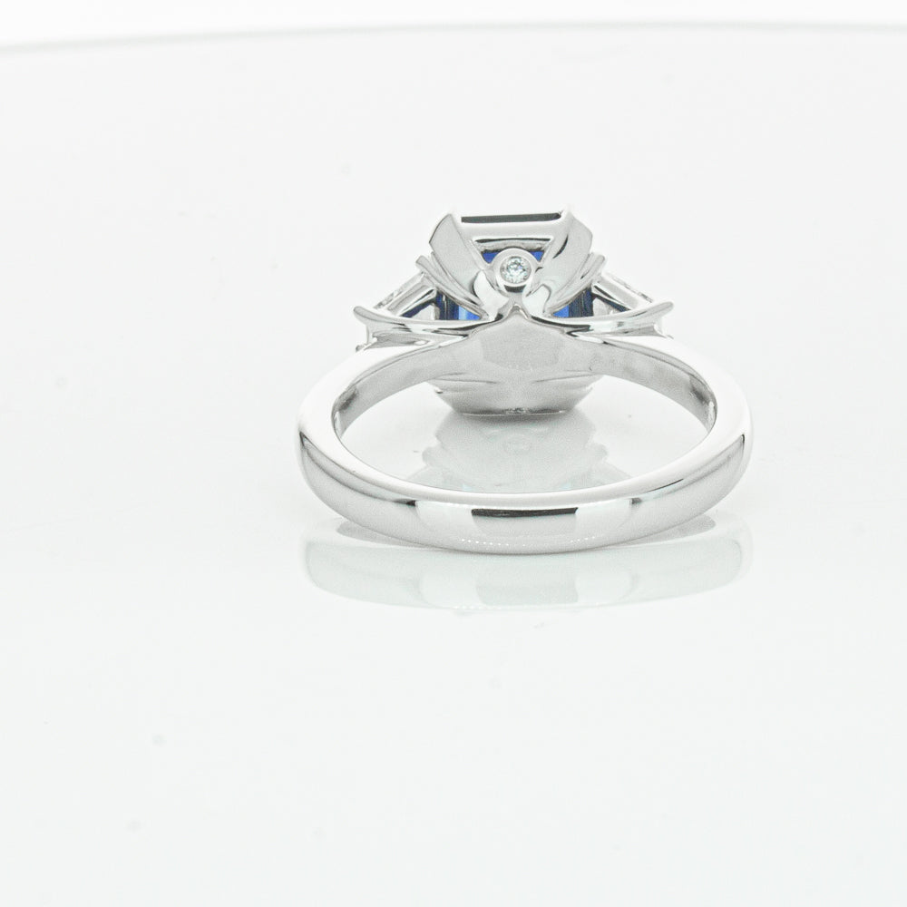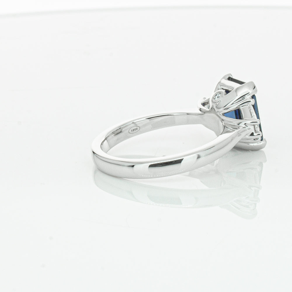 Distinctly glamorous, this sapphire and diamond ring from our signature 1899 collection showcases a deep blue, step cut sapphire with two tapering trapeze-cut diamond side stones. It has a further diamond set on each side of the base.