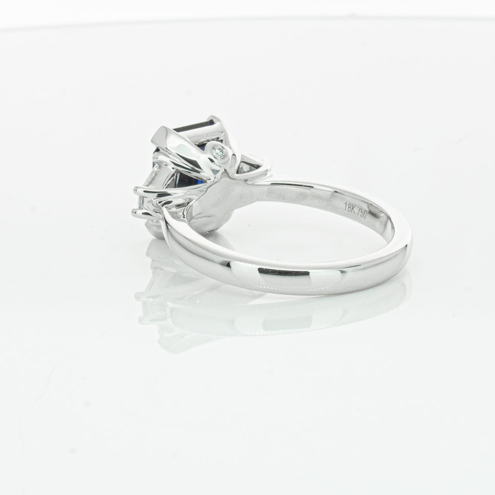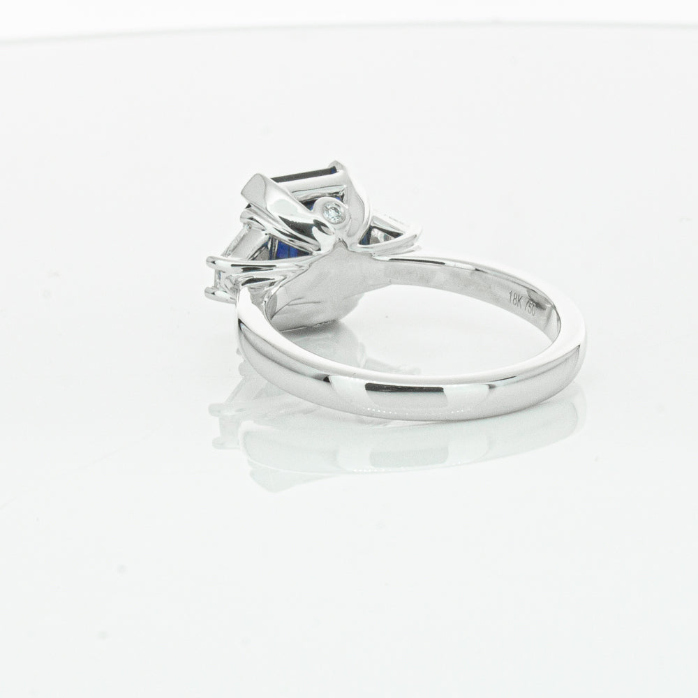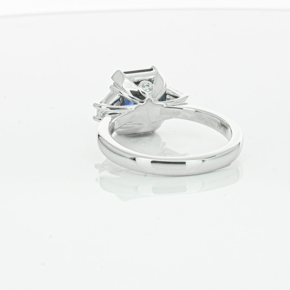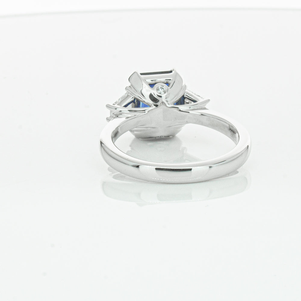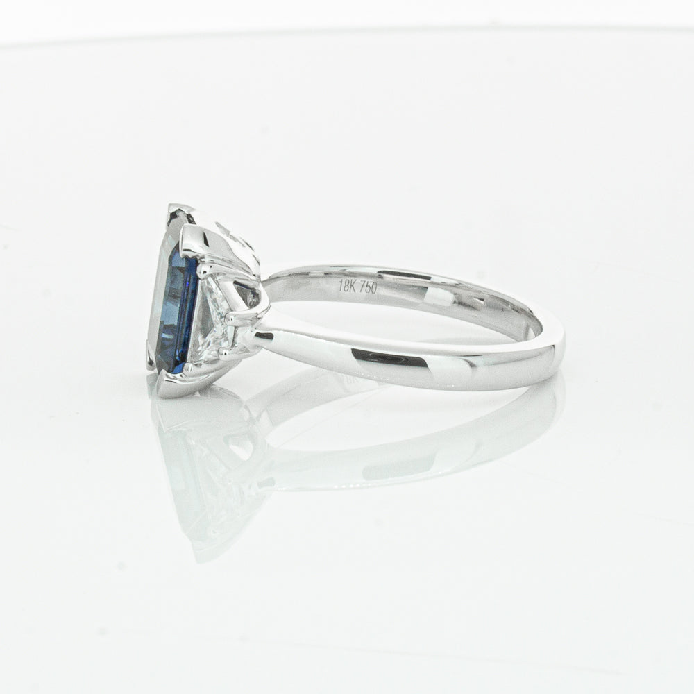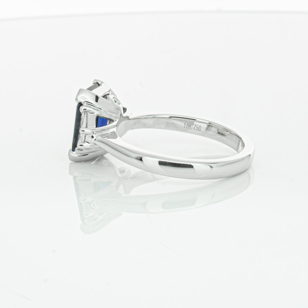 Distinctly glamorous, this sapphire and diamond ring from our signature 1899 collection showcases a deep blue, step cut sapphire with two tapering trapeze-cut diamond side stones. It has a further diamond set on each side of the base.
